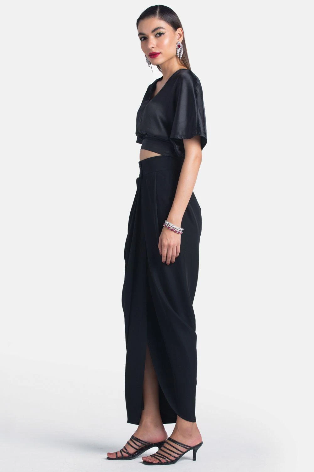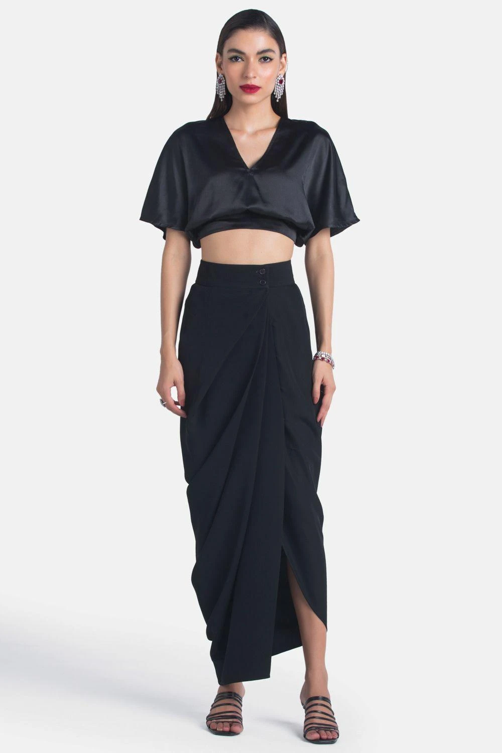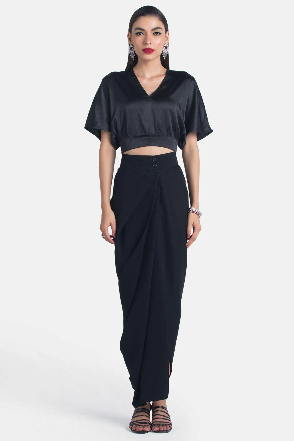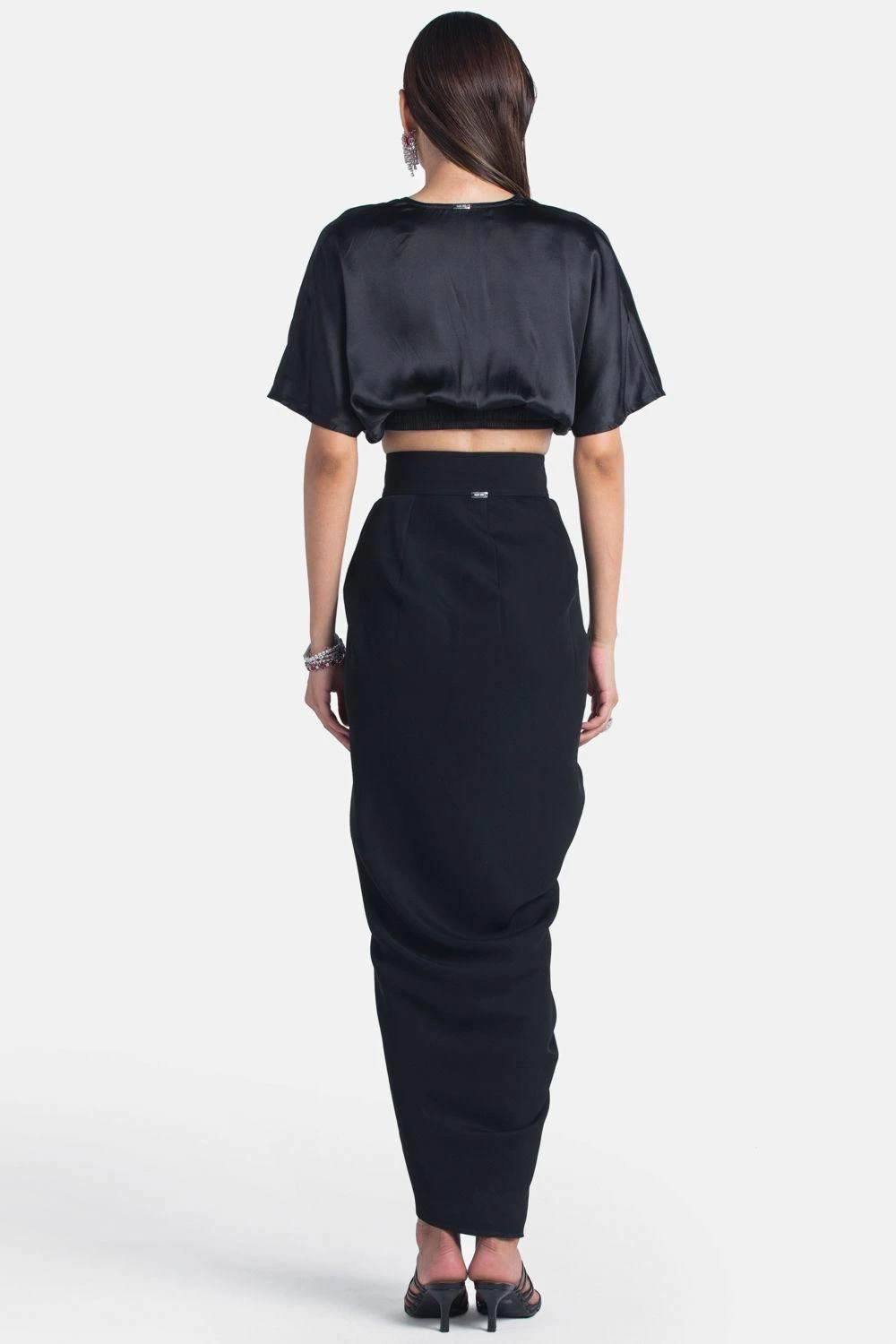 Look efforlessly stylish in this black crop op. Cut in silk satin, this top features a V neck and flared sleeves. Style this set with a draped skirt to complete the look.