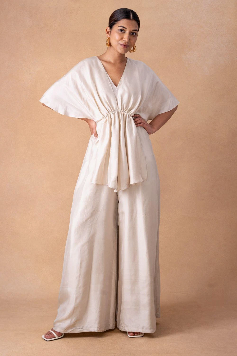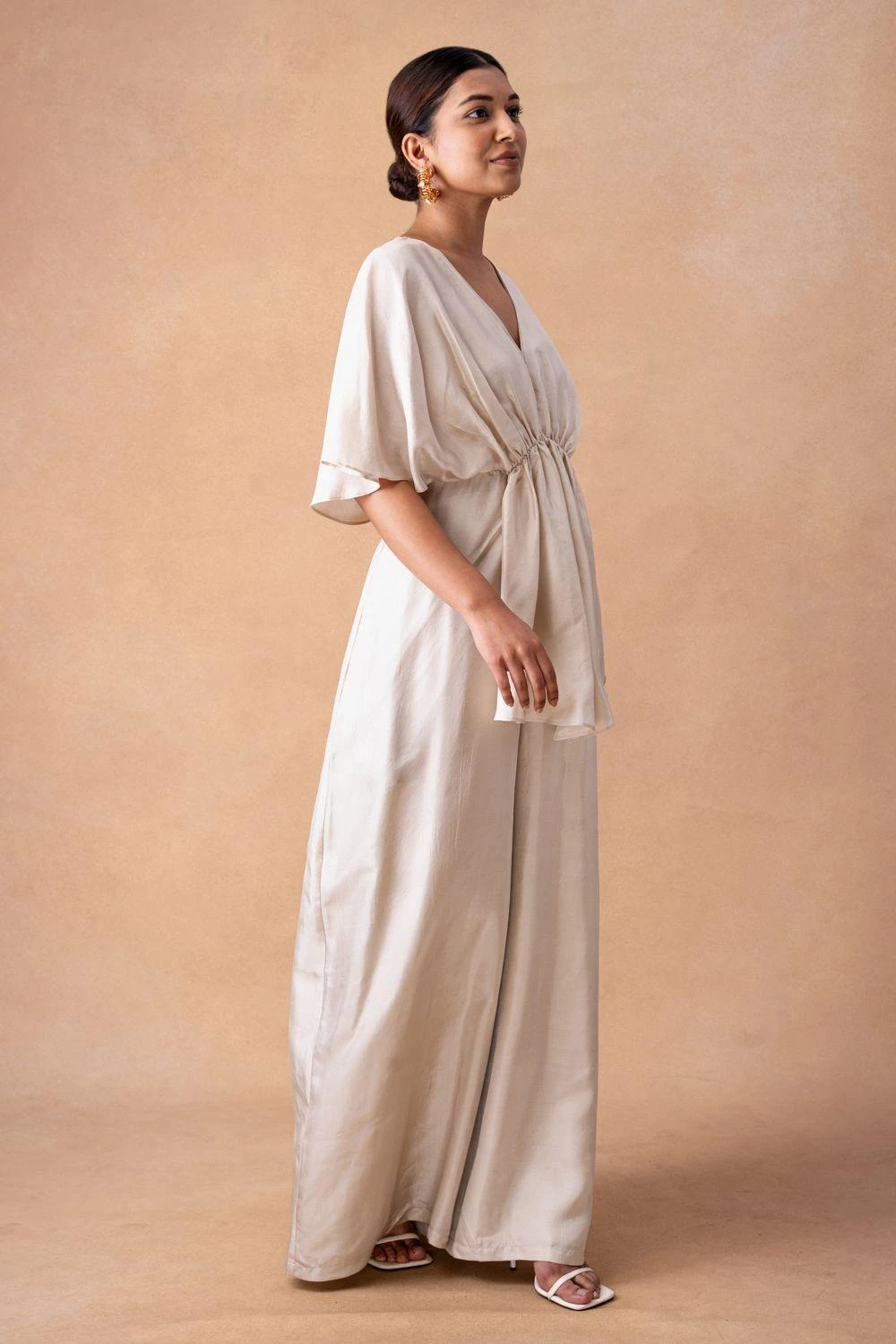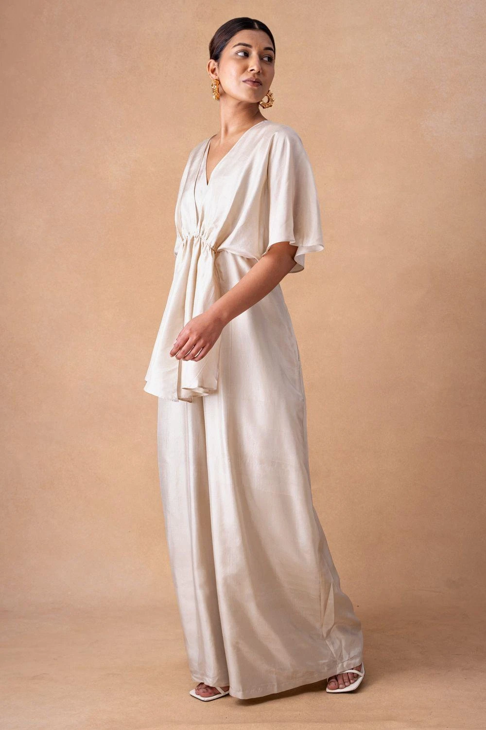 Embrace radiance in the Ivory Silk Draped Jumpsuit, adorned with exquisite drape details. A symphony of elegance, this piece invites you to indulge in a luxurious narrative of style and sophistication.