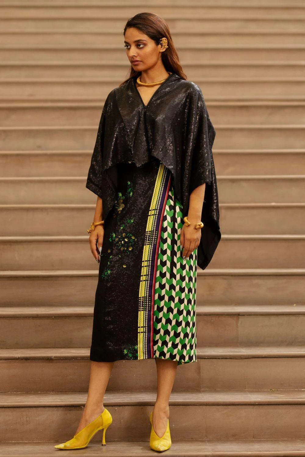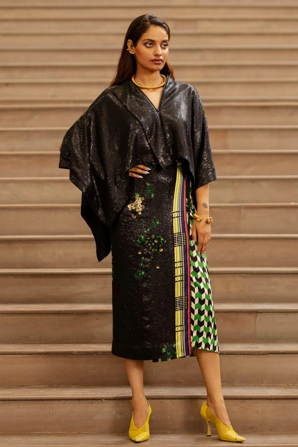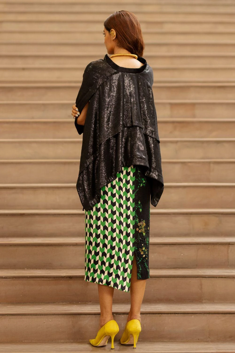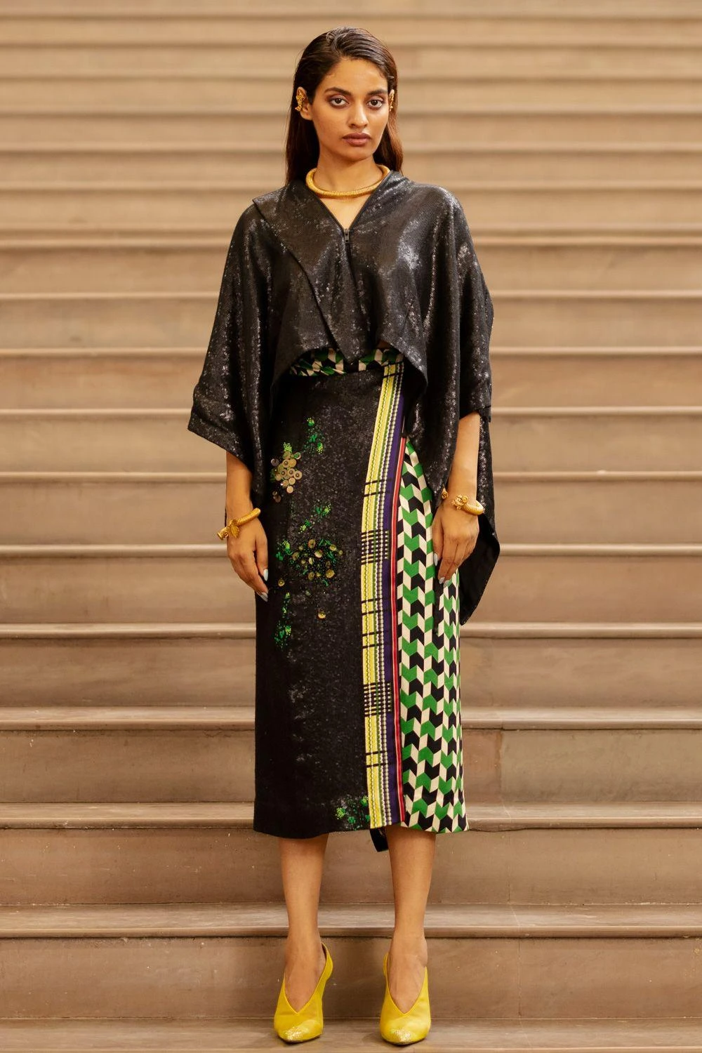 Inspired by quirky geometric prints, this Sequin Wrap Skirt features a black sequin backdrop embellished with green & gold details inspired by the wonders of nature. Flaunt this skirt with a shimmery top & gold-tone jewels for a party-ready look.รก