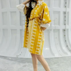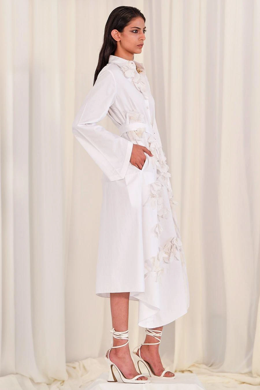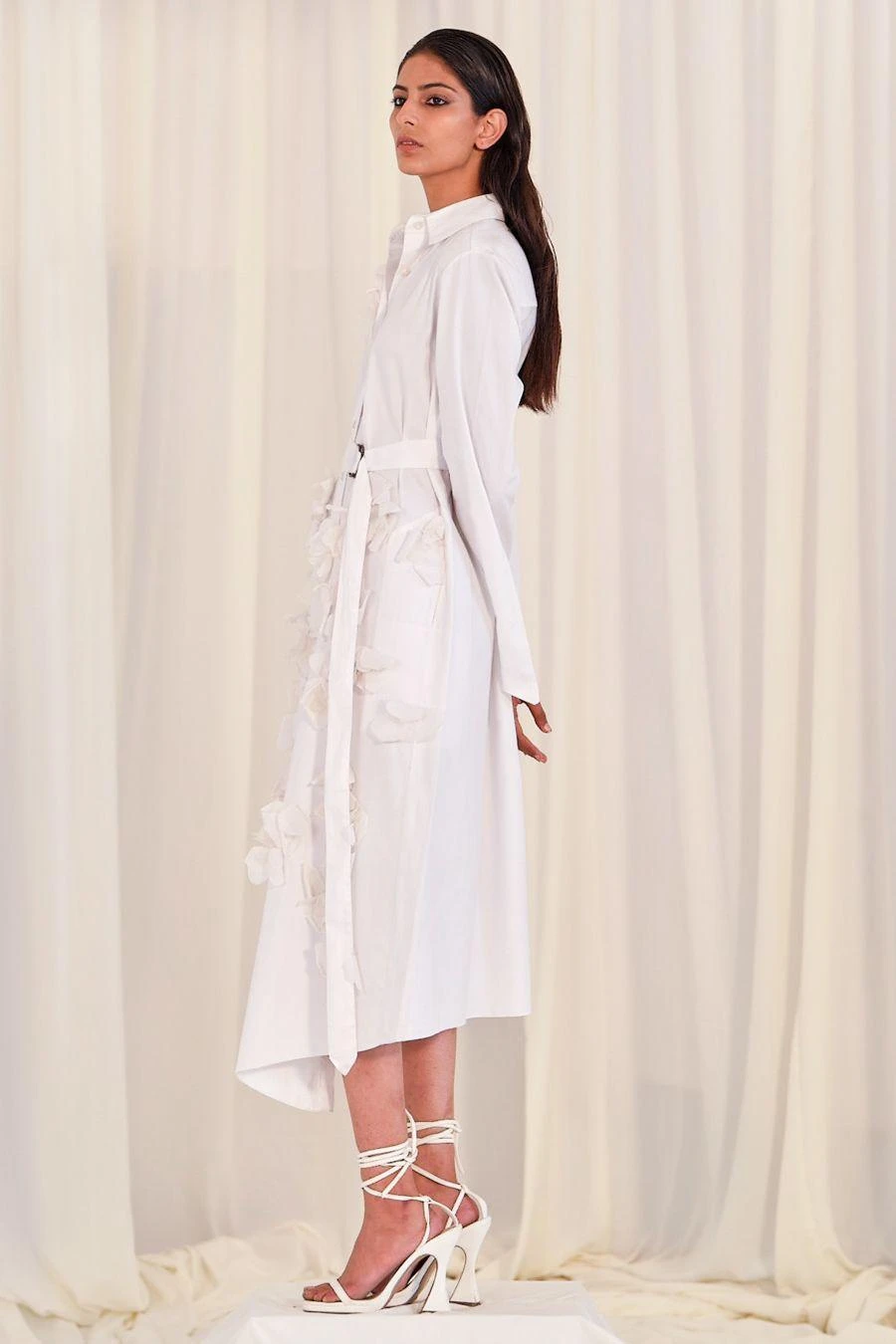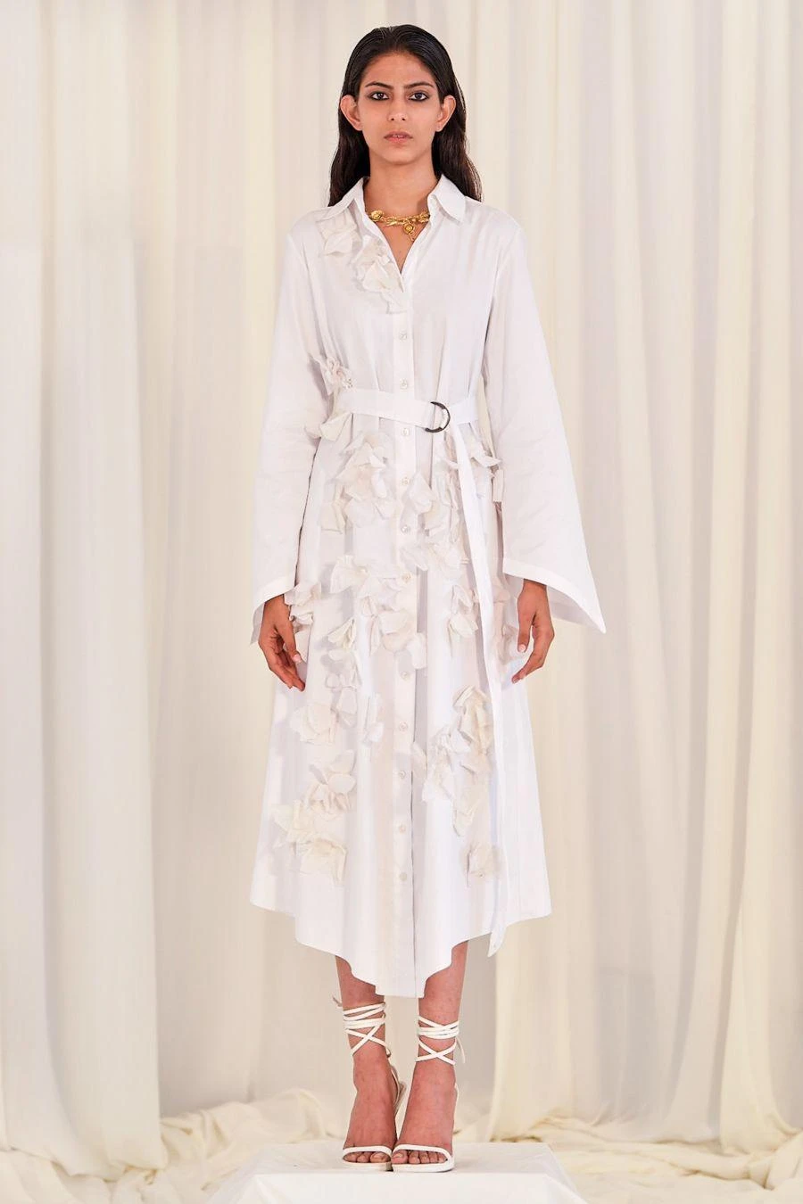 Look sartorially savvy with this white hued shirt dress. This relaxed-fit collared dress is made of cotton and has floral accents. Add a pair of gold hoops to complete the look.