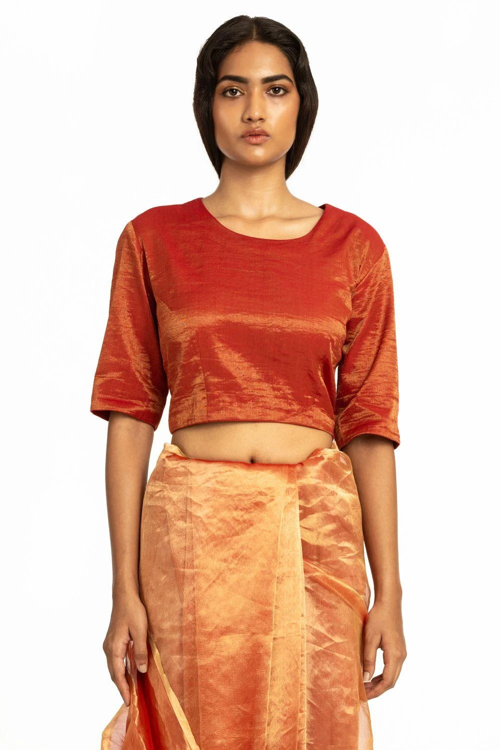This handwoven red round neck blouse is woven in chanderi fabric. You can style this versatile piece with your saris for a festive look.
