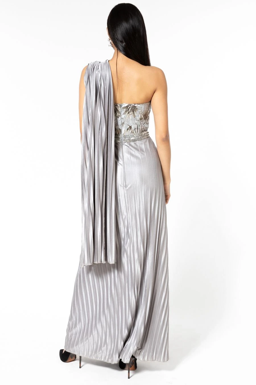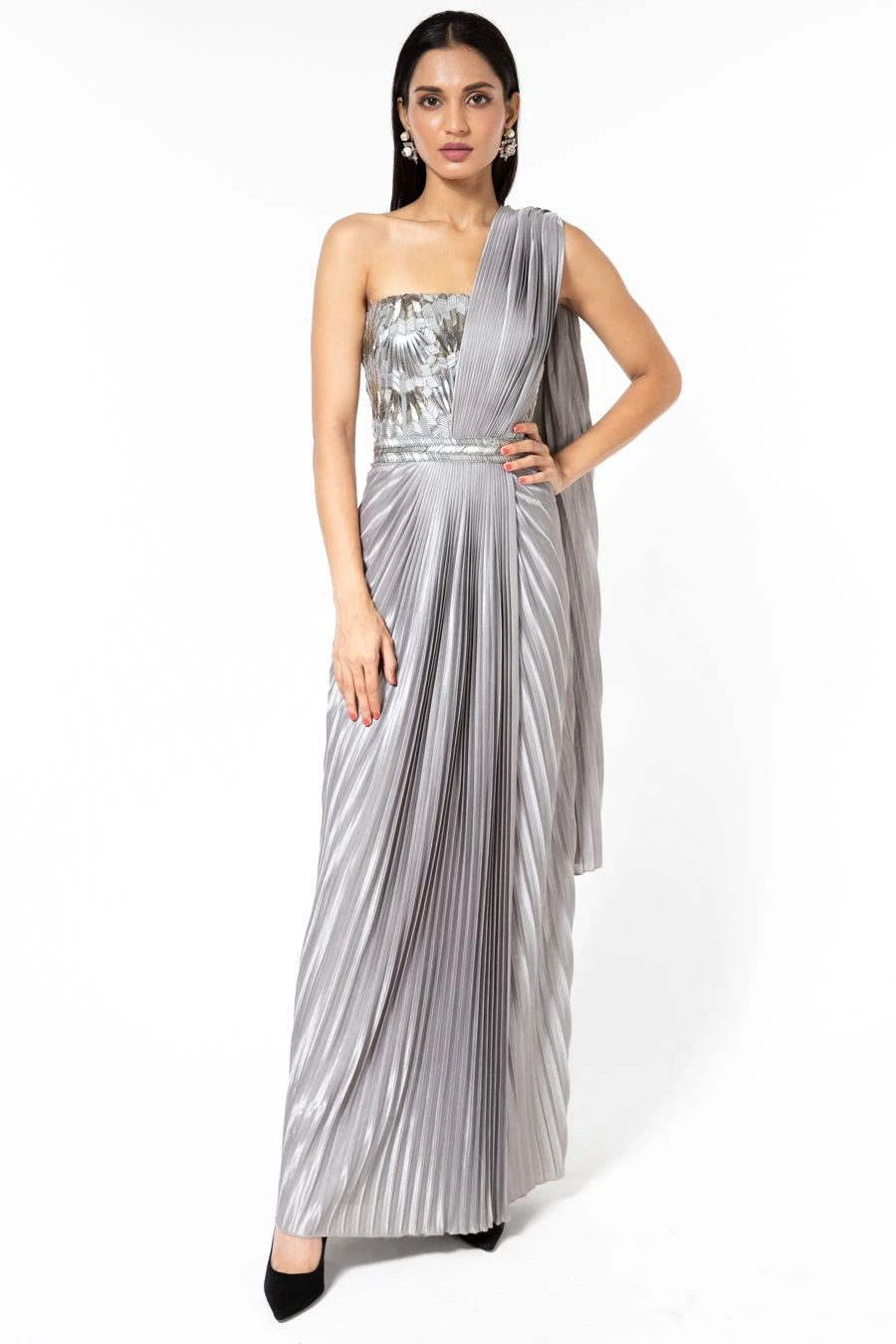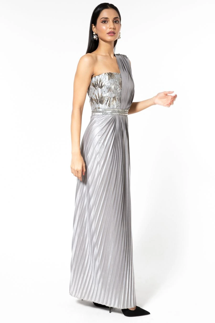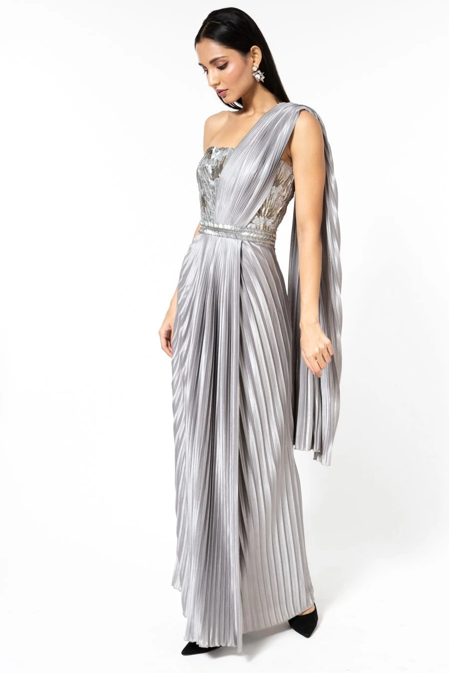 Crafted in shimmer lame, this beautifully & meticulously designed dress with a draped & pleated detail has a lasting impression on the onlookers. Style this dress with a pair of statement earrings to complete the look.