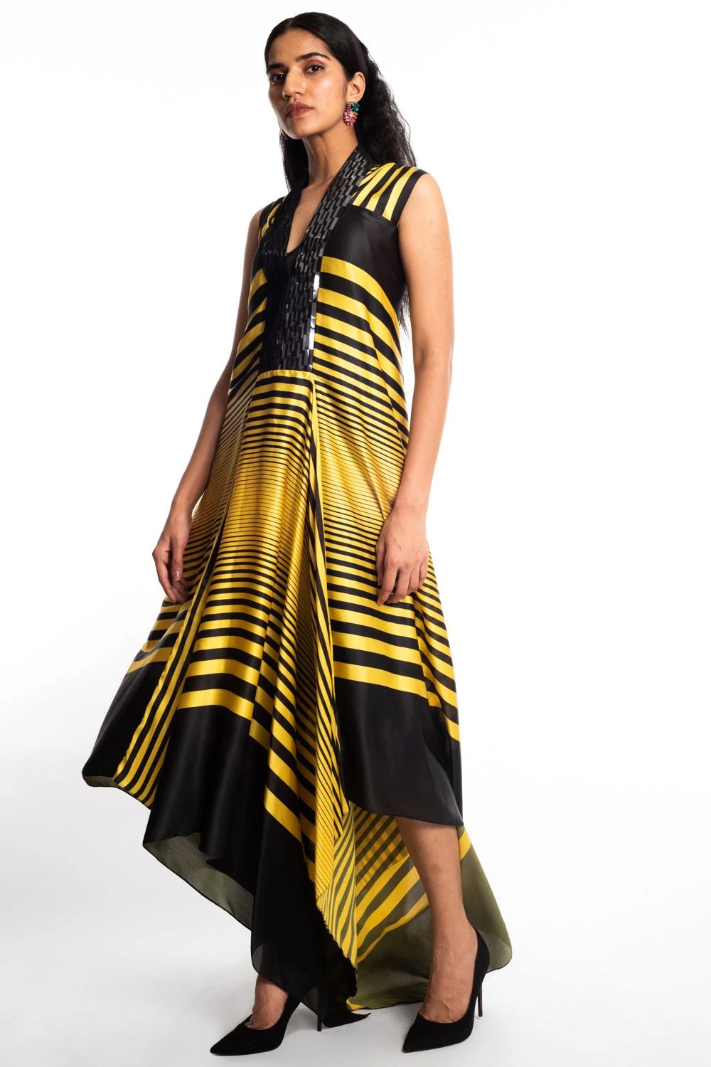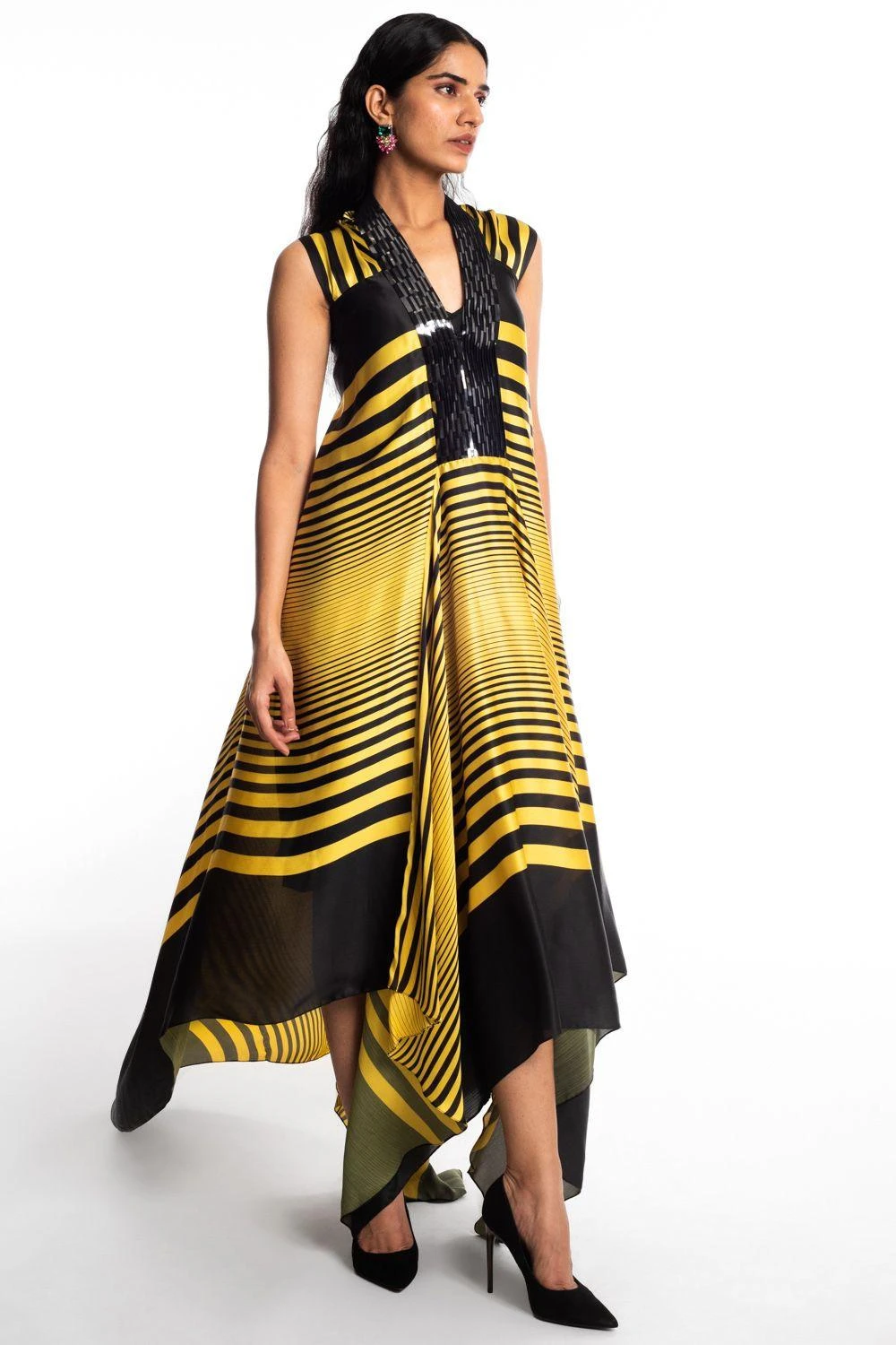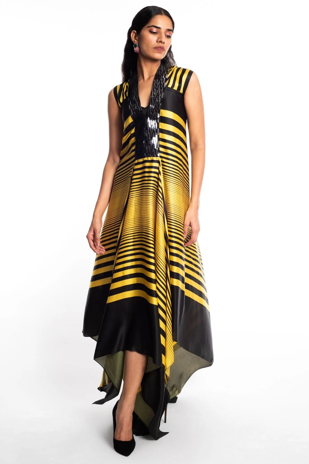 This beautifully and meticulously designed cocktail dress has a lasting impression on the onlookers. Crafted in chiffon, this dress features striped details with a metallic polymer placket & an asymmetric hem.