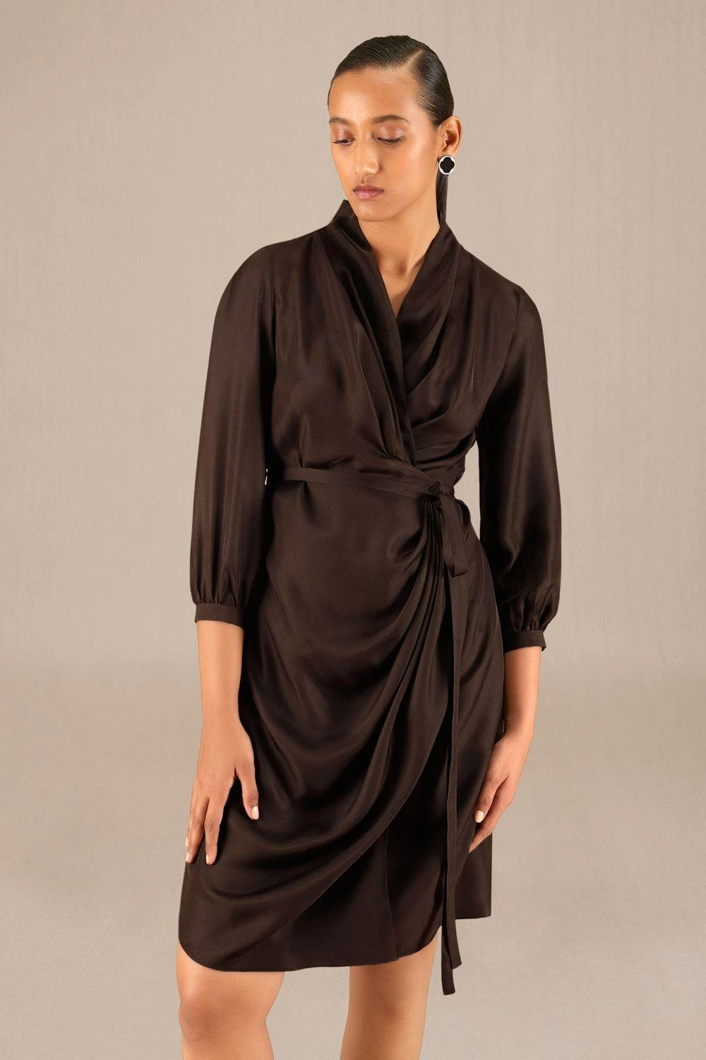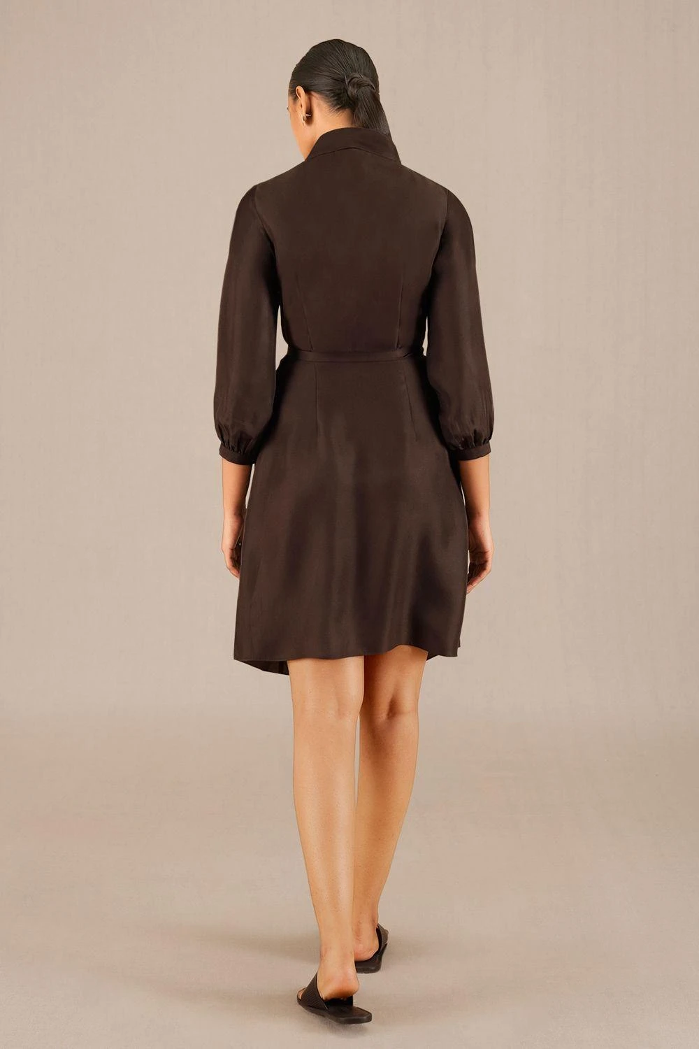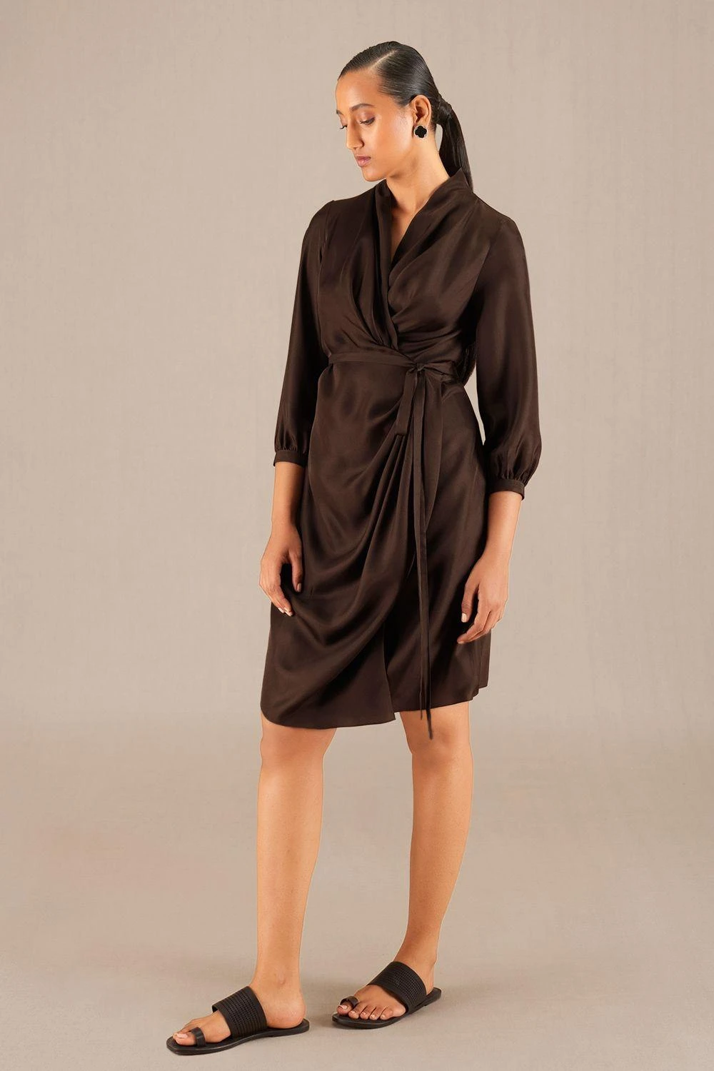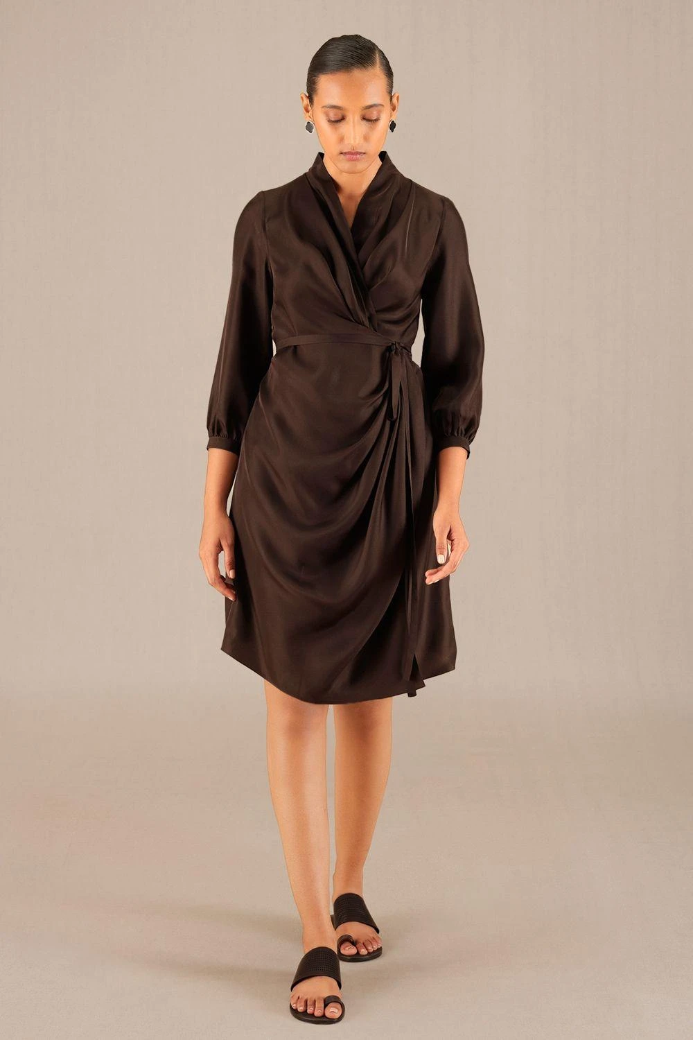 Crafted from sumptuous dark brown silk, Neesa exudes sophistication with its soft, form flattering silhouette and included self fabric belt. This dress is your ultimate choice for a captivating date night ensemble, elevating your style effortlessly.