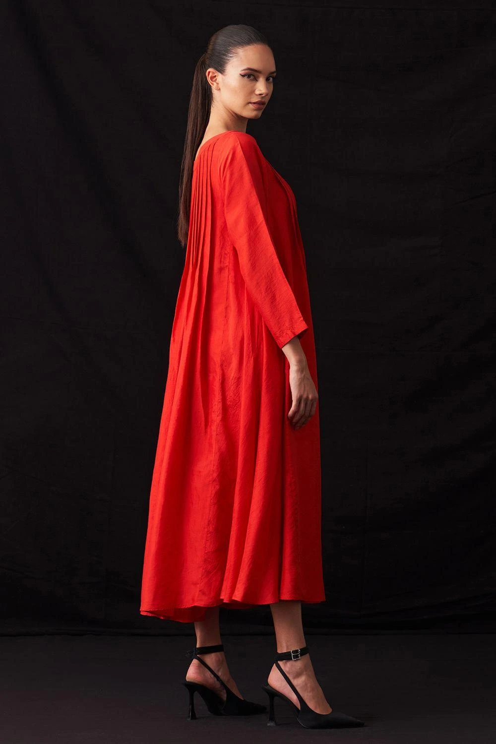 Elevate your style with the exquisite red hand-woven, silk pleated yoke dress. The epitome of elegance, this dress seamlessly combines craftsmanship & luxury. Perfect for soirÃ’es, galas, or upscale events, it exudes sophistication and timeless charm.