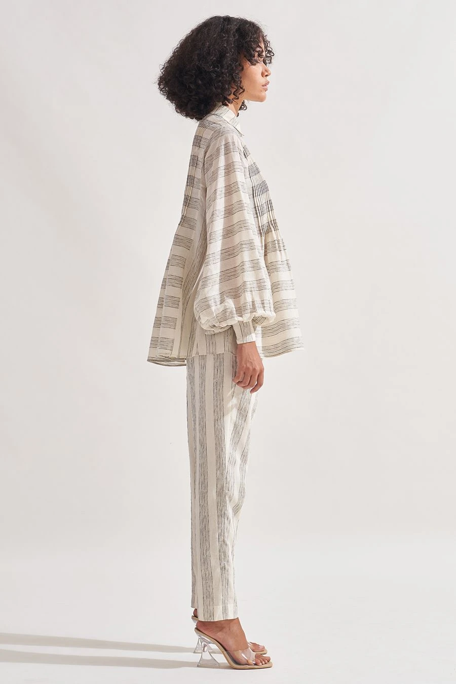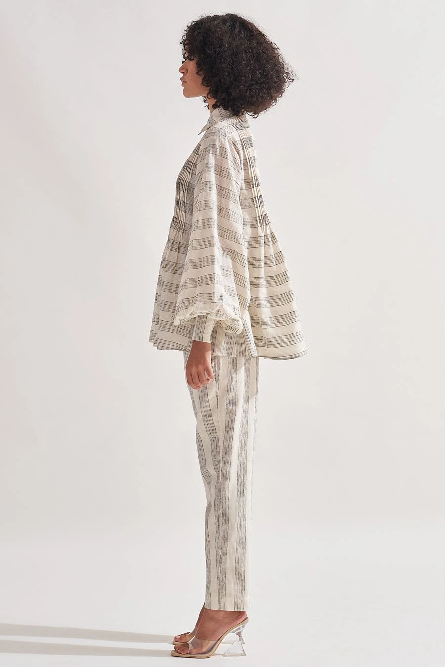 Look sartorially savvy with this ivory top. Crafted in handwoven cotton, this collared top features a pleated yoke with bishop sleeves. Add a pair of dangler earrings to complete the look.