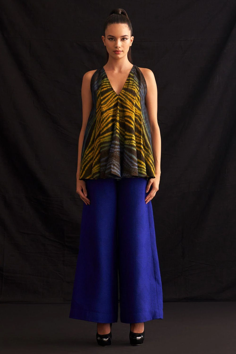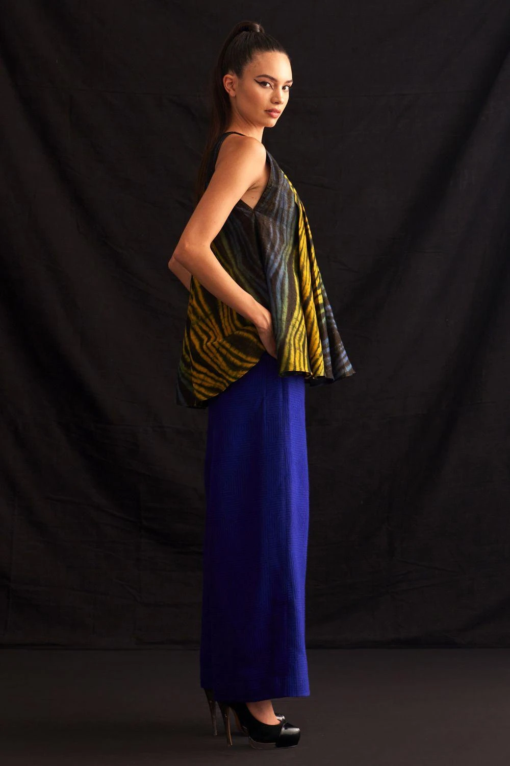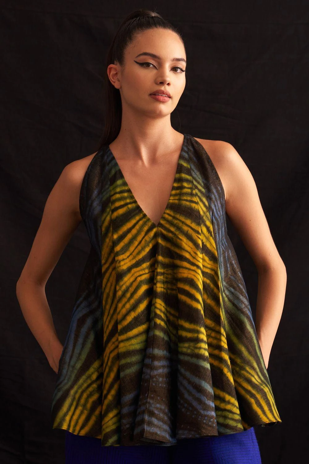 Elevate your style effortlessly with this sleeveless swing shirt, a masterpiece of hand-woven cotton and zari blend, adorned with meticulously hand-crafted shibori patterns.