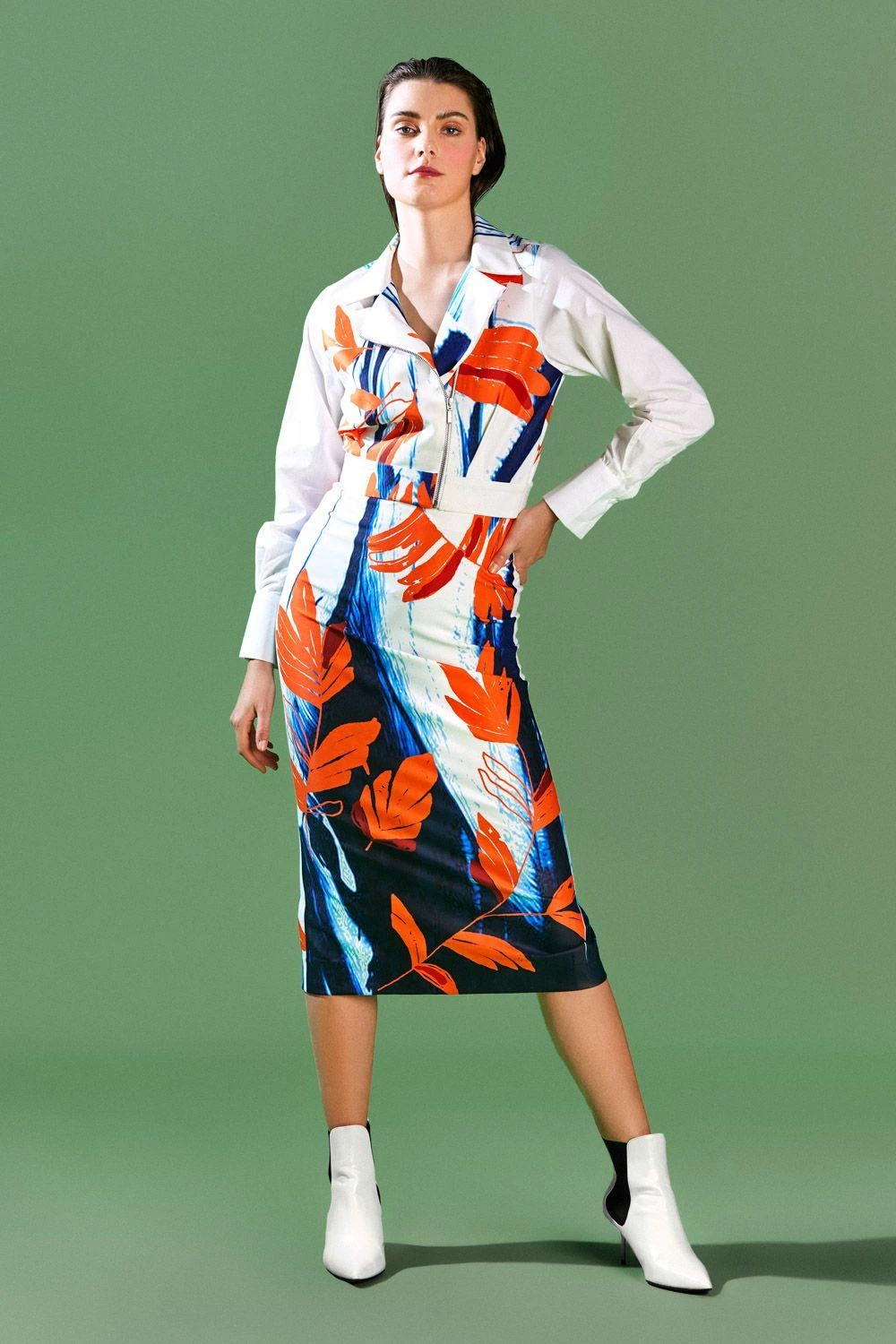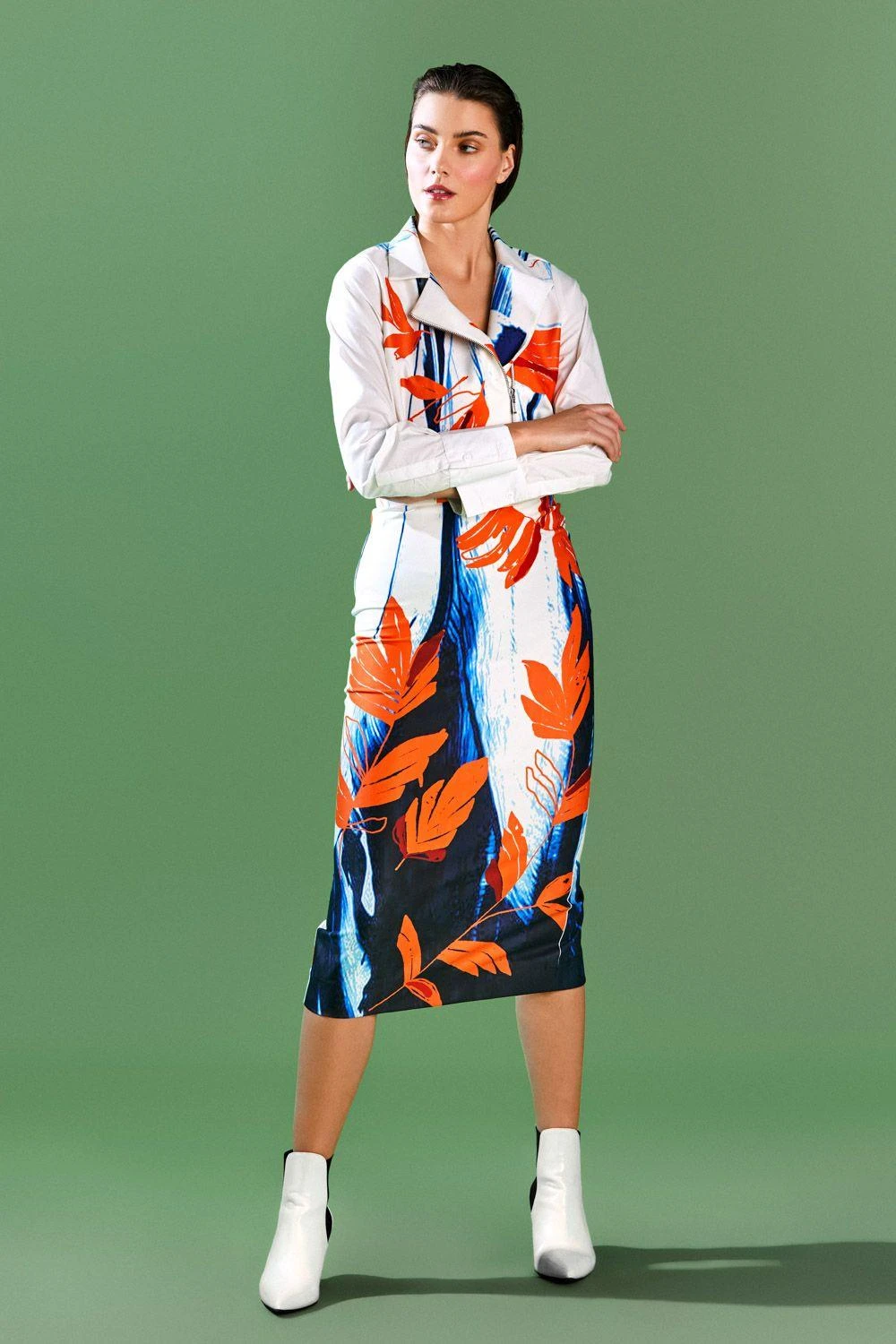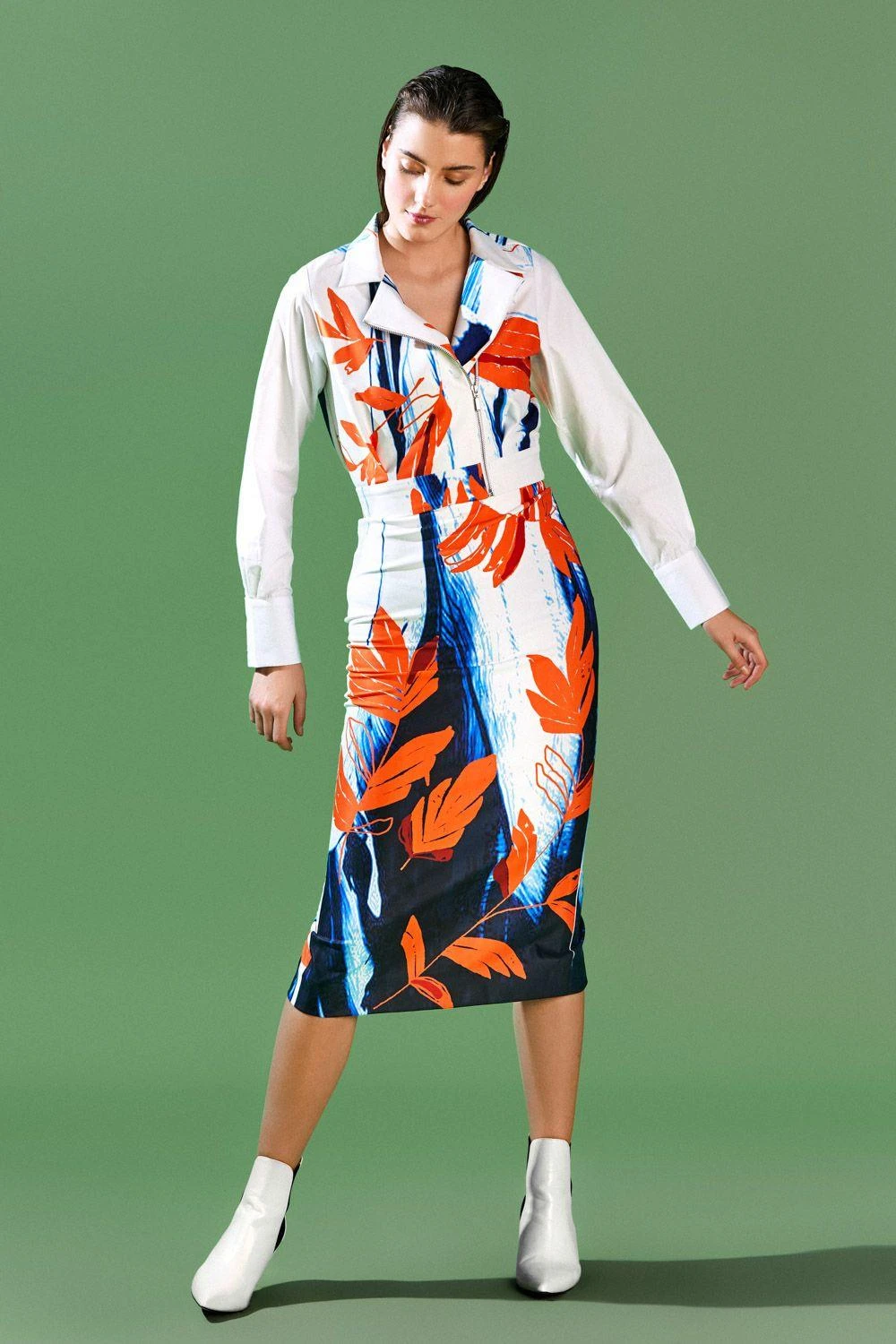 This artful piece surely deserves a place in your tasteful closet. Featuring this pencil skirt cut in stretch microfiber fabric and accented with brushstroke prints. Style this skirt with the abstract print shirt from Bennch to complete the look.