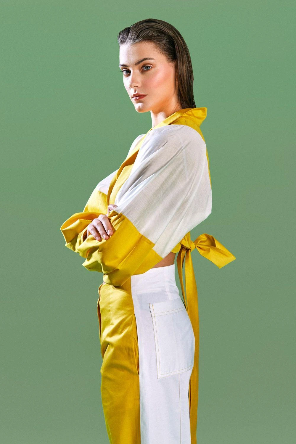 This sporty crop top is a staple piece for your modern & contemporary closet. This utility piece can also be worn as a jacket or shirt. Style this statement piece with a pair of blue denims & gold hoop earrings.
