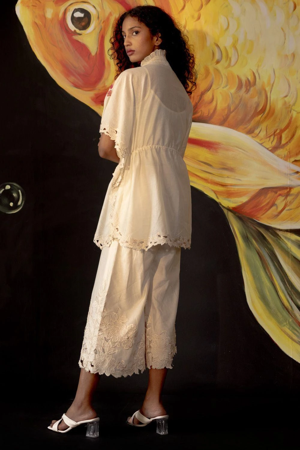 Maximise the life of your wardrobe with these exquisite pair of trousers. Crafted in chanderi, this culotte features a cutwork detail. Style it with a floral embroidered top and dainty jewellery to complete the look.