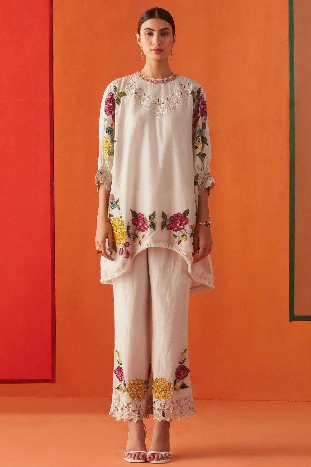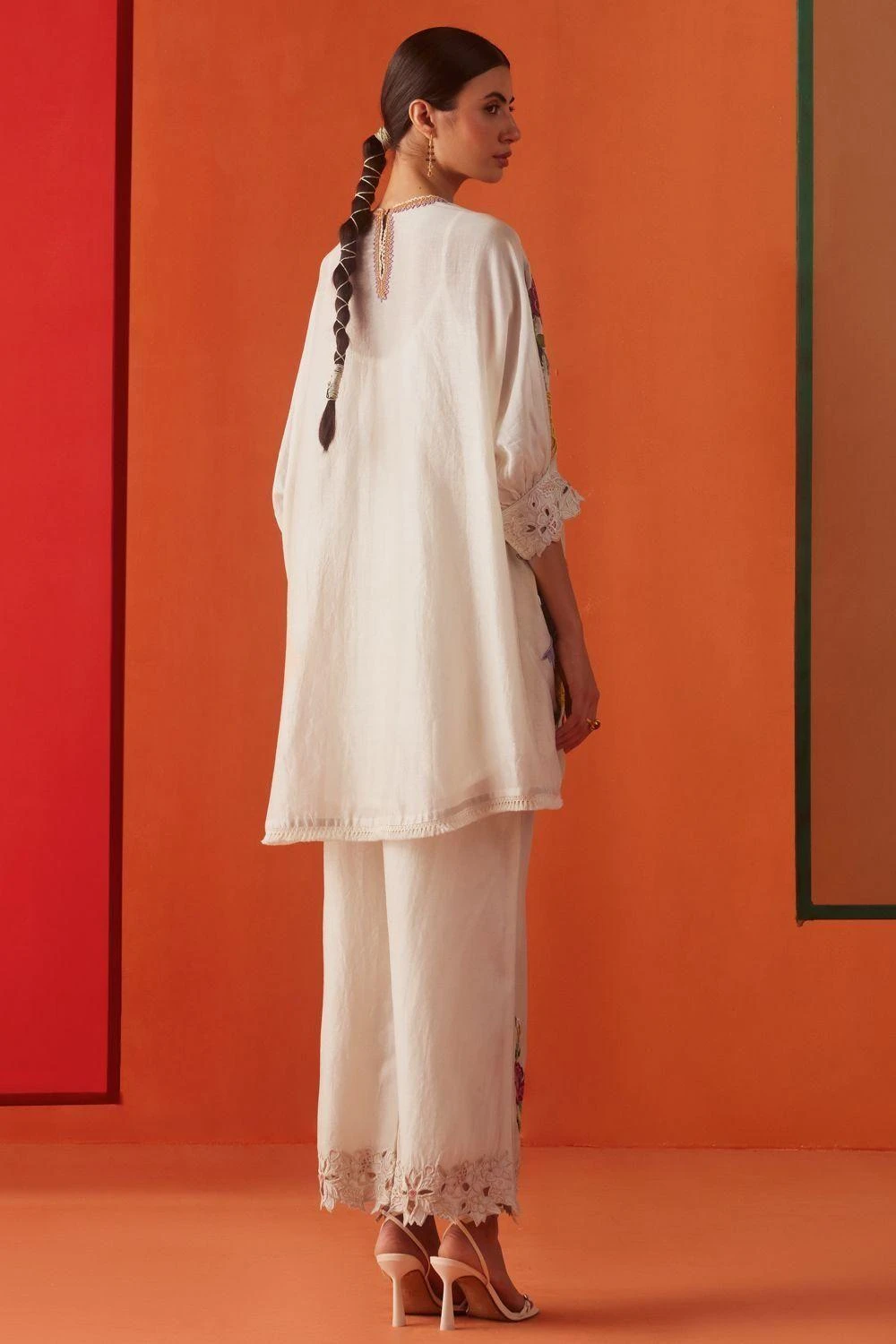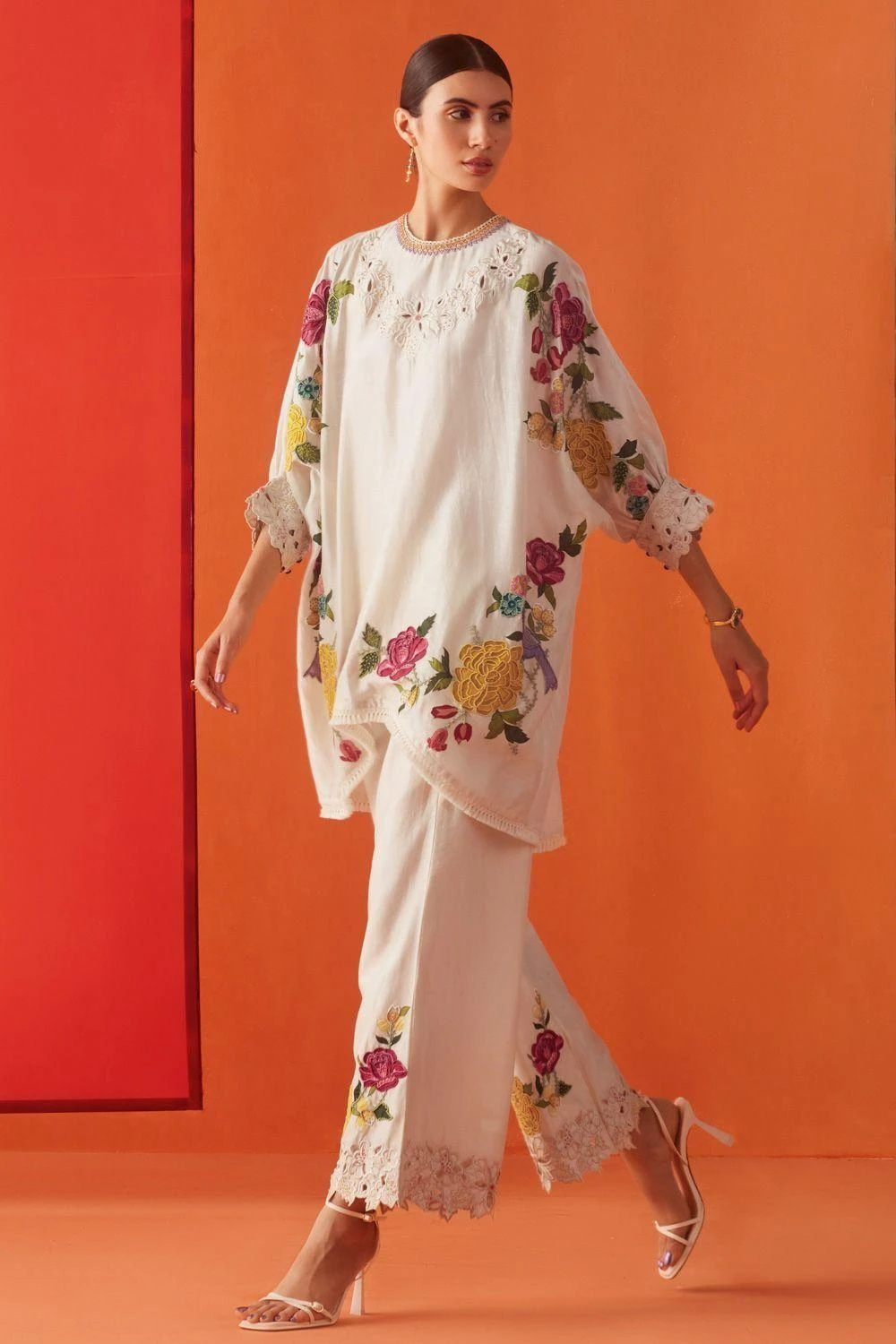 Indulge in sophistication with these chanderi pants. Enhanced by intricate beadwork and mesmerizing cutwork, these pants redefine luxury. Elevate your wardrobe with this exquisite piece.