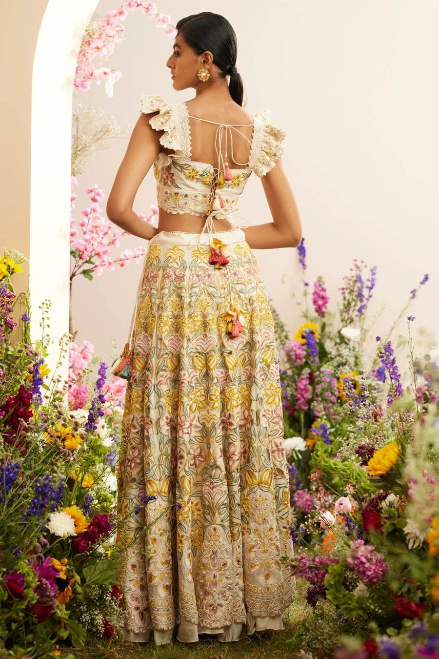 Maximise the life of your wardrobe with this bustier. Crafted in chanderi, this bustier features intricate beadwork details & ruffle sleeves. Pair it with the Ivory multi pastel cutwork lehenga from the collection for an effortless daytime look.