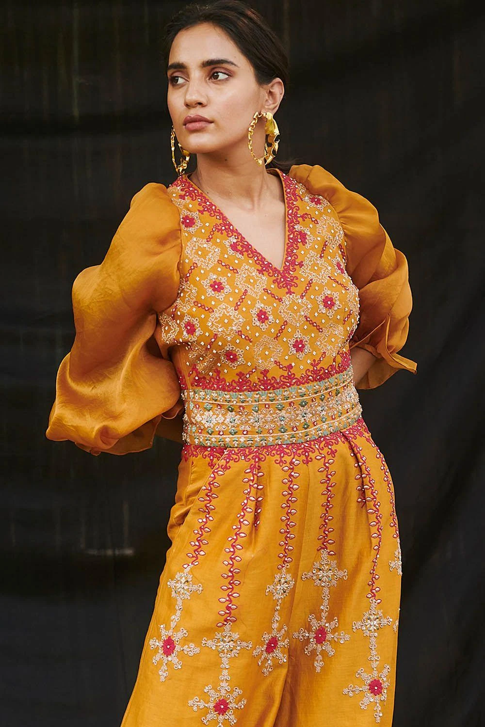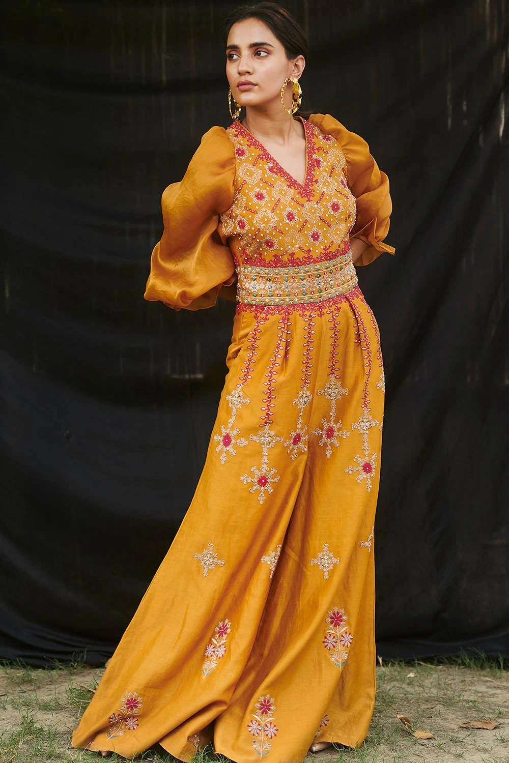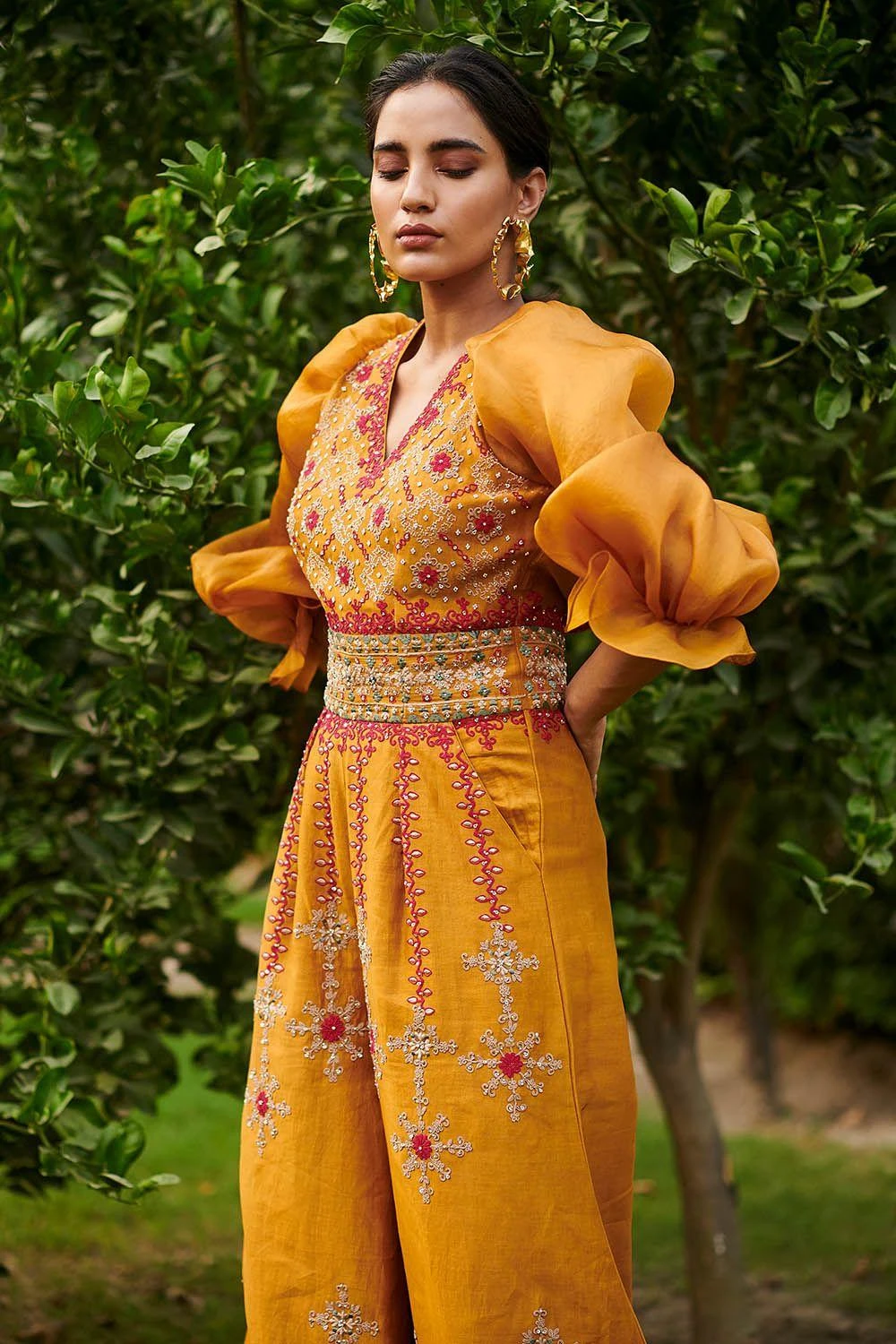 Chandrima Mustard Chanderi Flared Jumpsuit