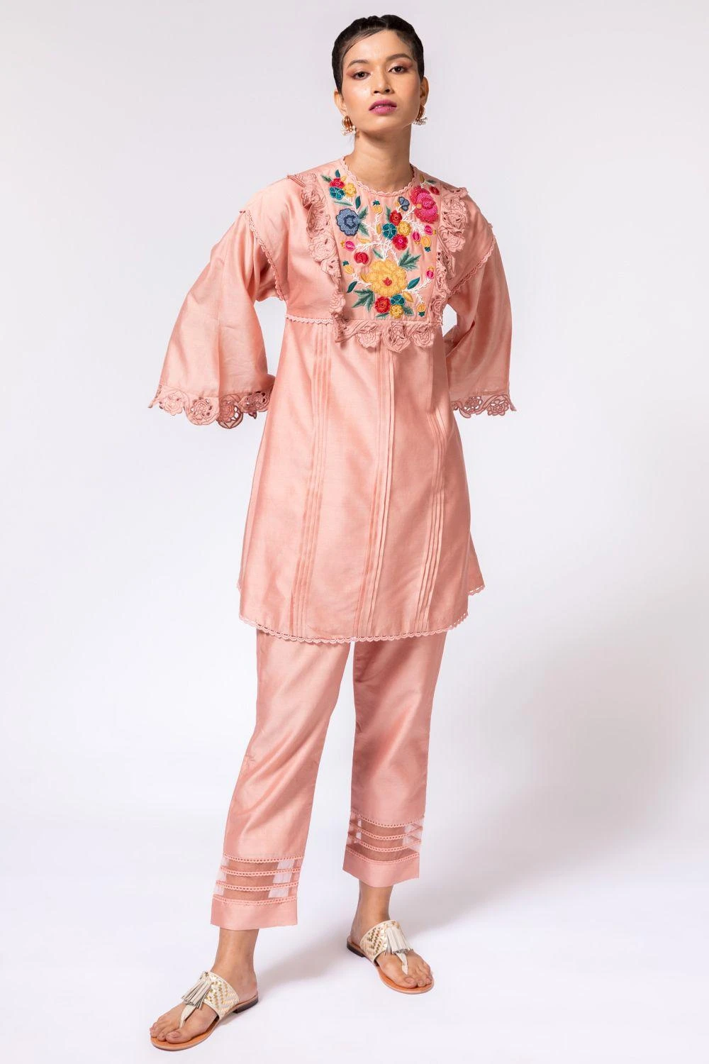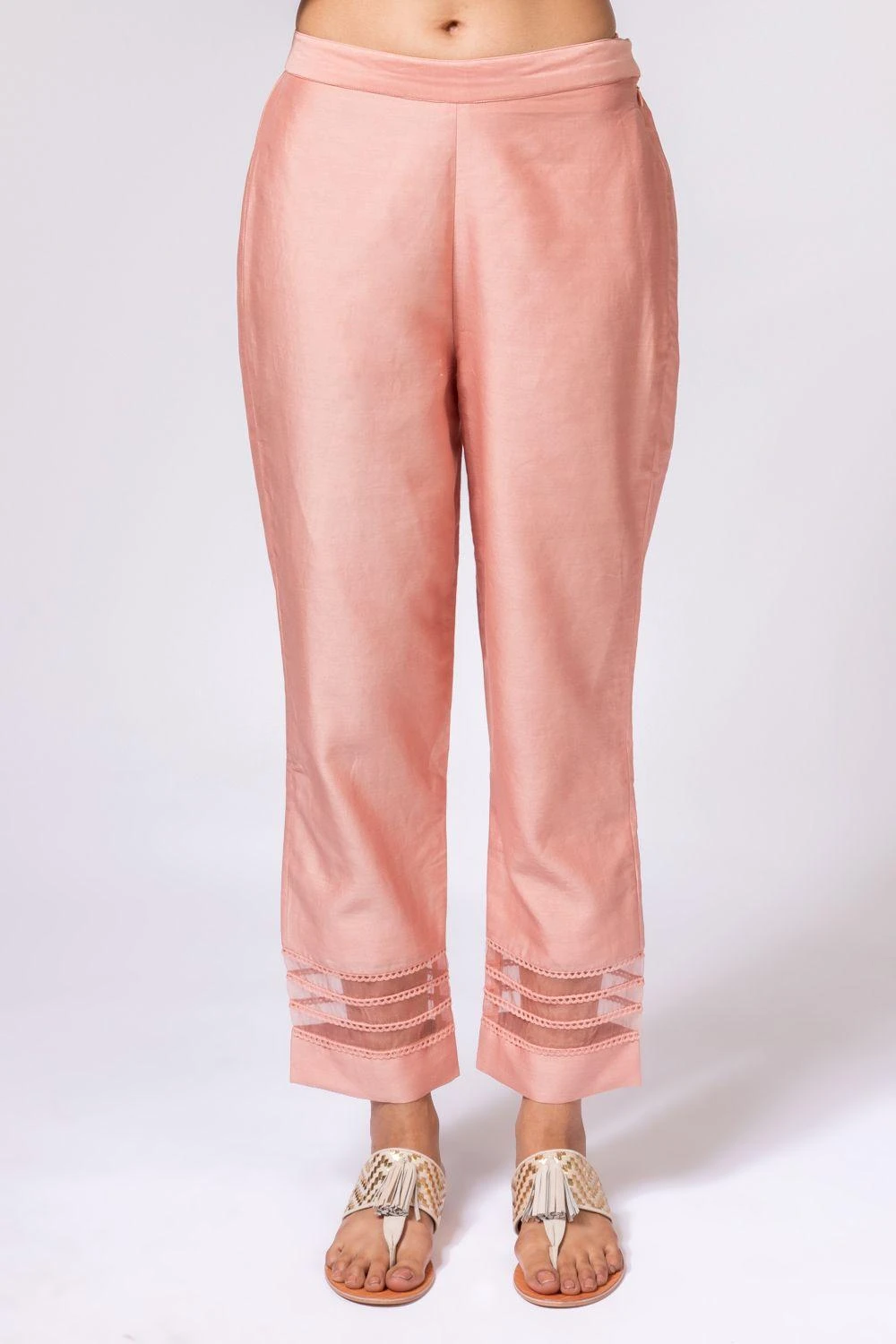 These peach narrow pants are cut in luxe chanderi fabric and feature an organza panel on the hem. You can style this versatile piece with an array of options from your closet.