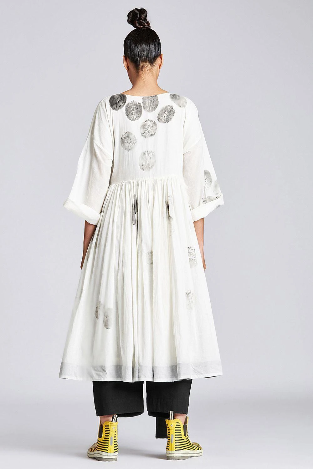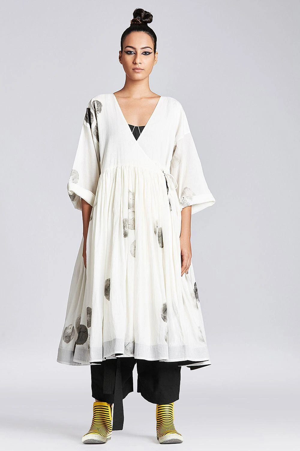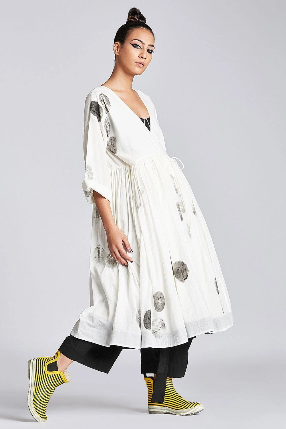This white hand painted angrakha dress is a trans-seasonal piece and can be styled as both Indian & a contemporary look. It is made in airy organic cotton with drop shoulders & front tie-up. Style it solo or team it up with a pair of pants.