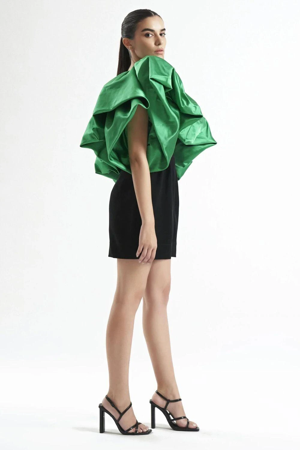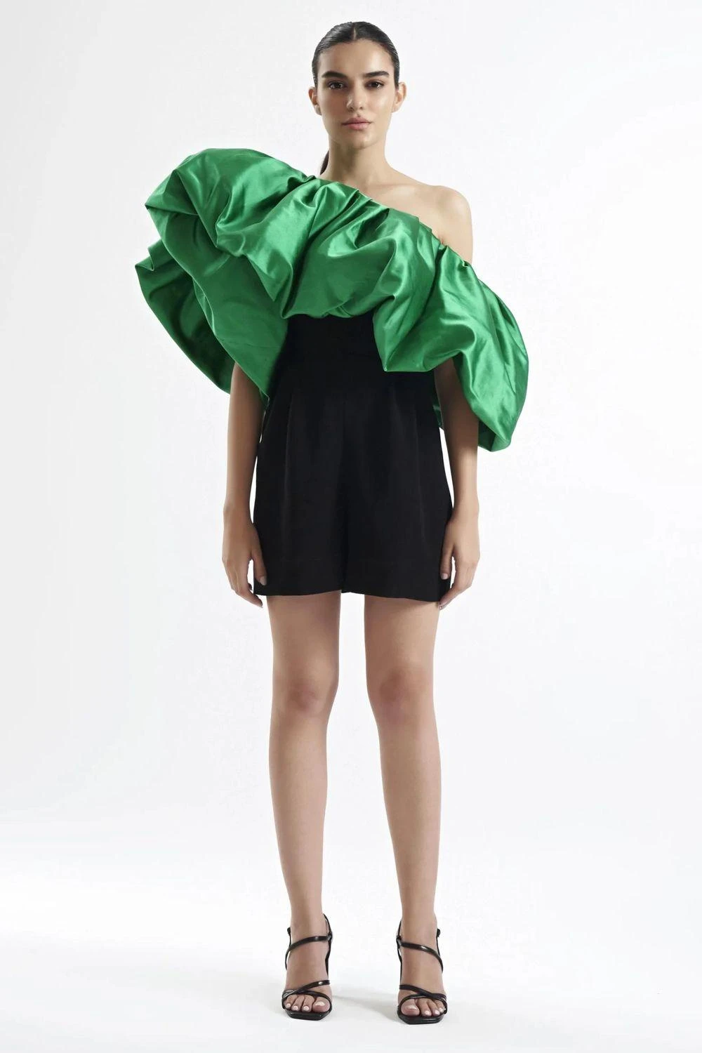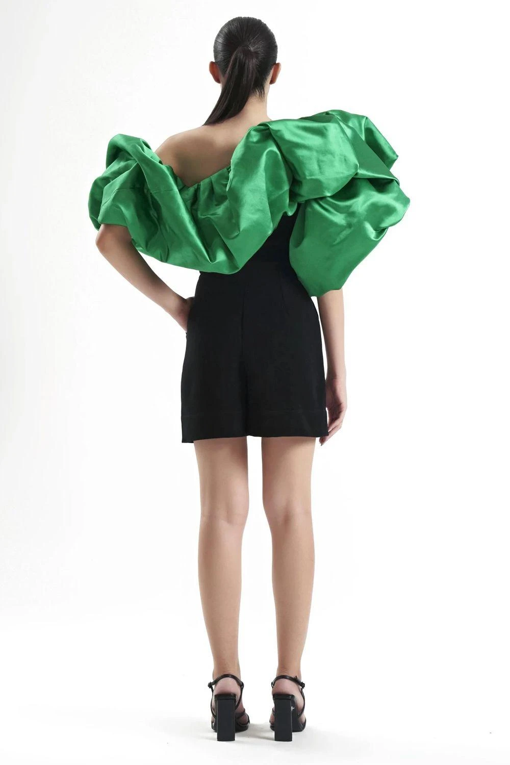 Elevate your style with this one-shoulder romper, featuring a gracefully ruffled upper body and chic cold shoulder sleeves, all crafted in luxurious duchess satin. A fashion statement that’s both elegant and trendy.
