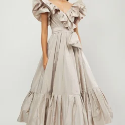 If you’re looking for a head-turning statement-making dress, this is the dress for you. Crafted in taffeta, this wrap dress features a frilled V-neck with a bow detail on the side. Style it with a pair of statement earrings to complete the look.