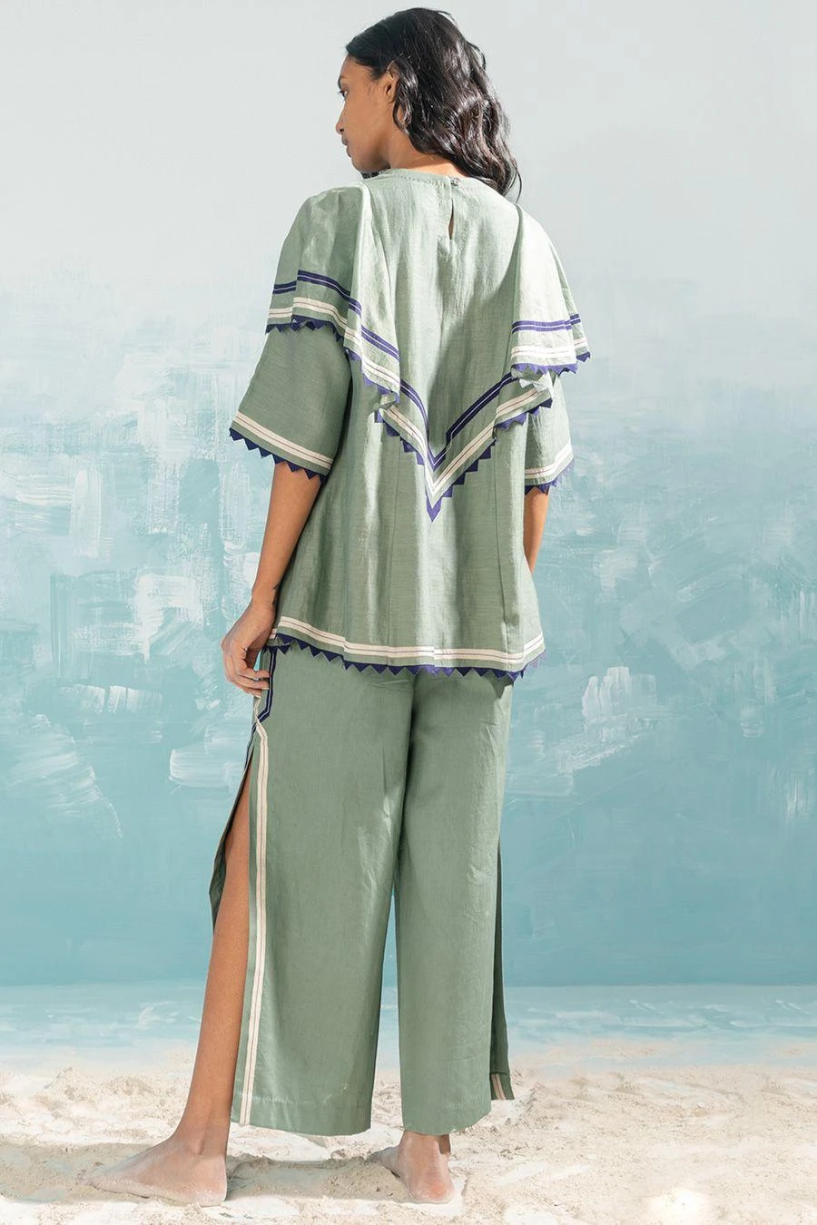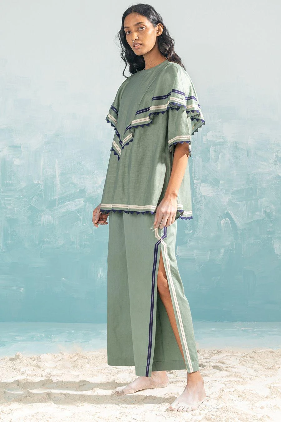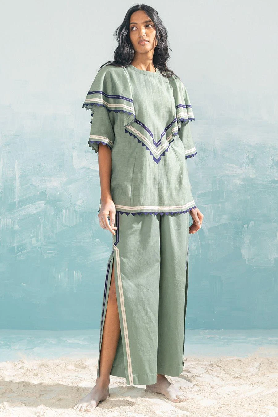 This green frill top falls in the realm of luxe minimalism. Crafted in cotton silk chanderi, this top features handcut applique and cutwork details. Style it with the Ivory high slit cutwork pants from the collection to complete the set.