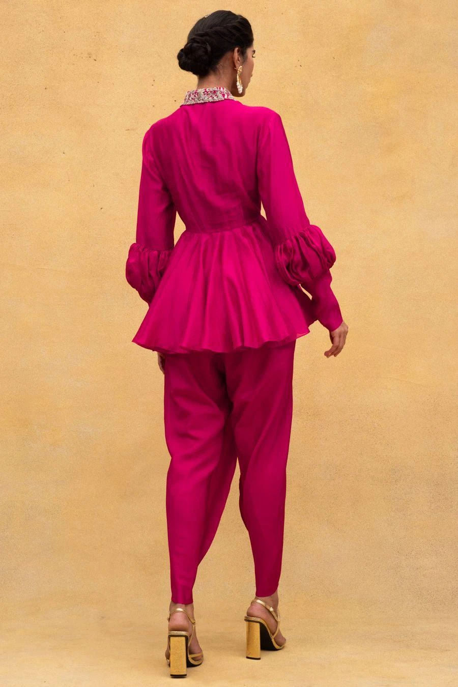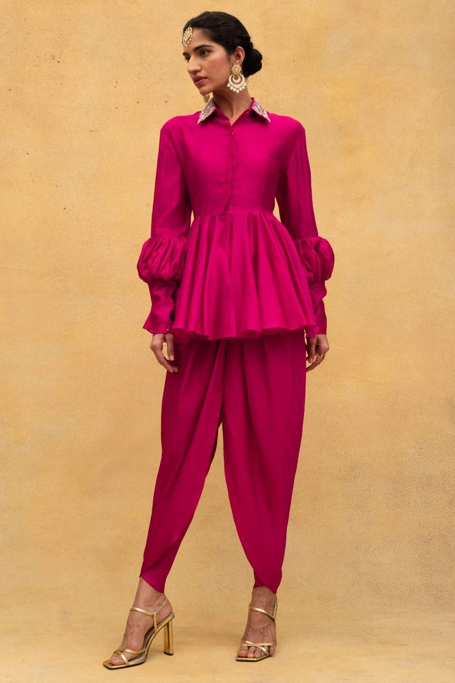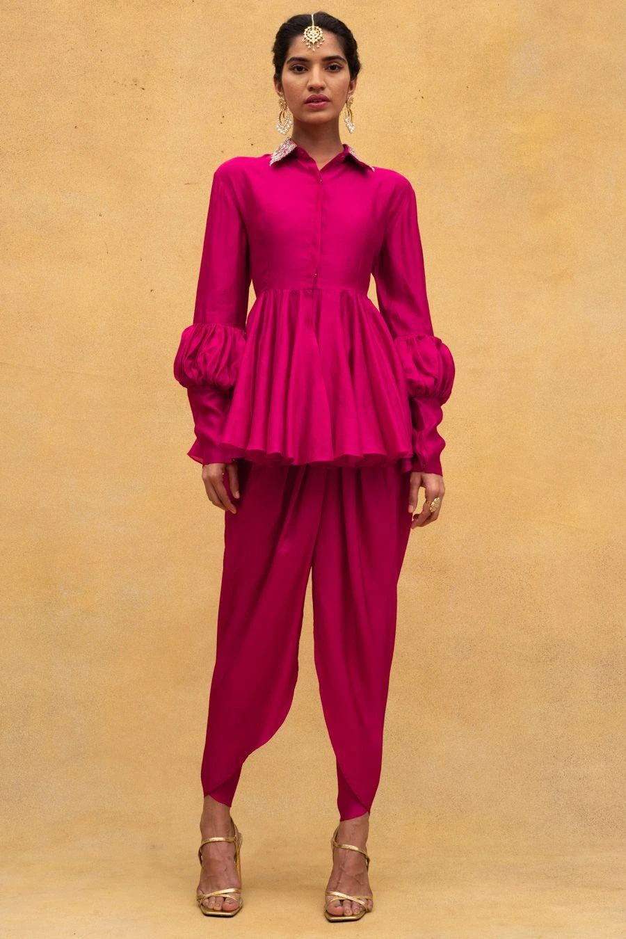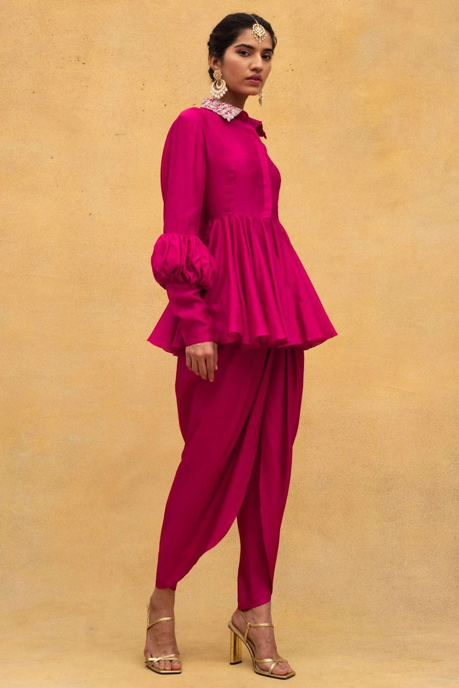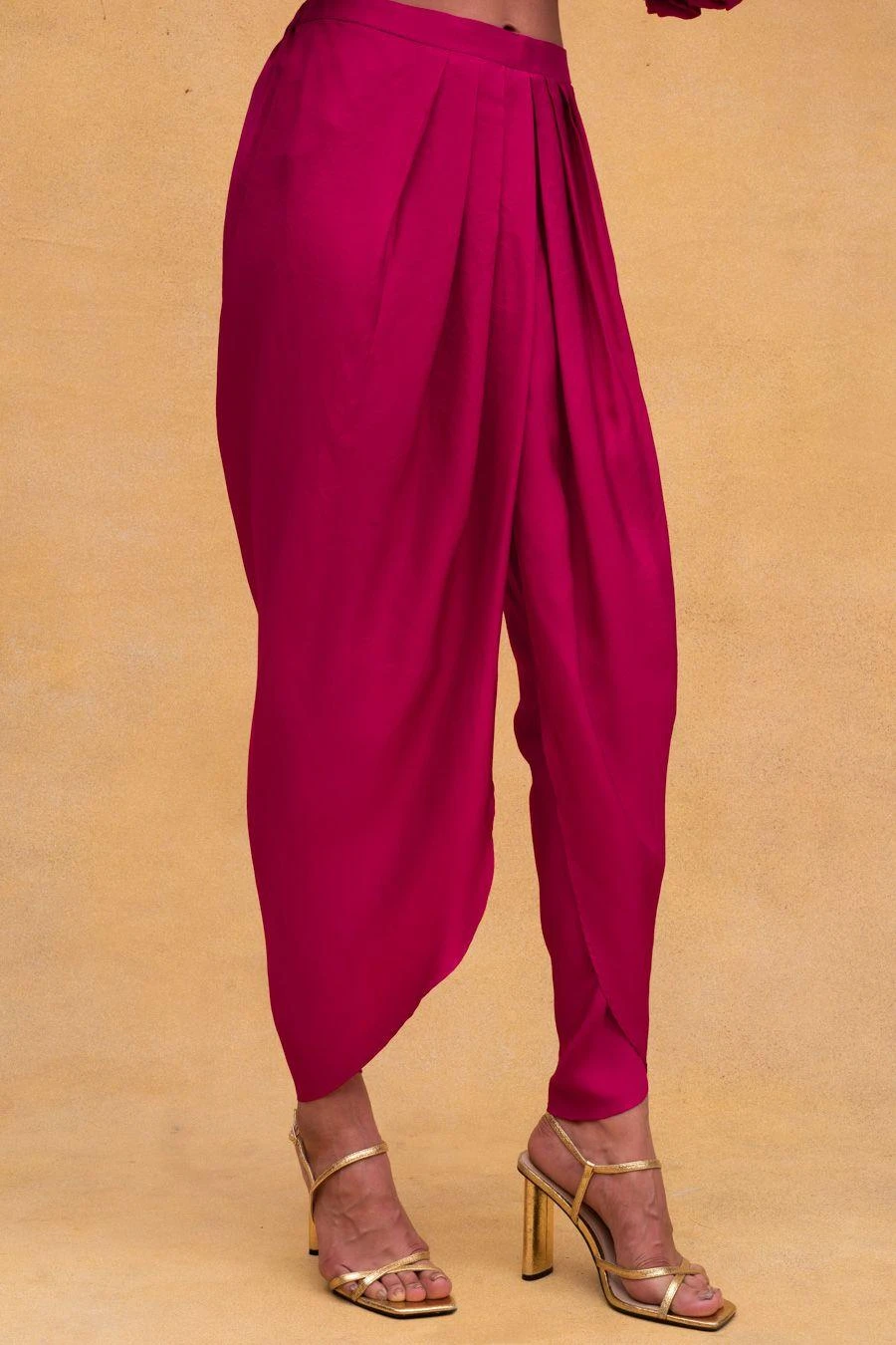 Crafted in silk, these, functional separate pink dhoti pants can be paired with a zardosi embroidered kurta or top from the collection.