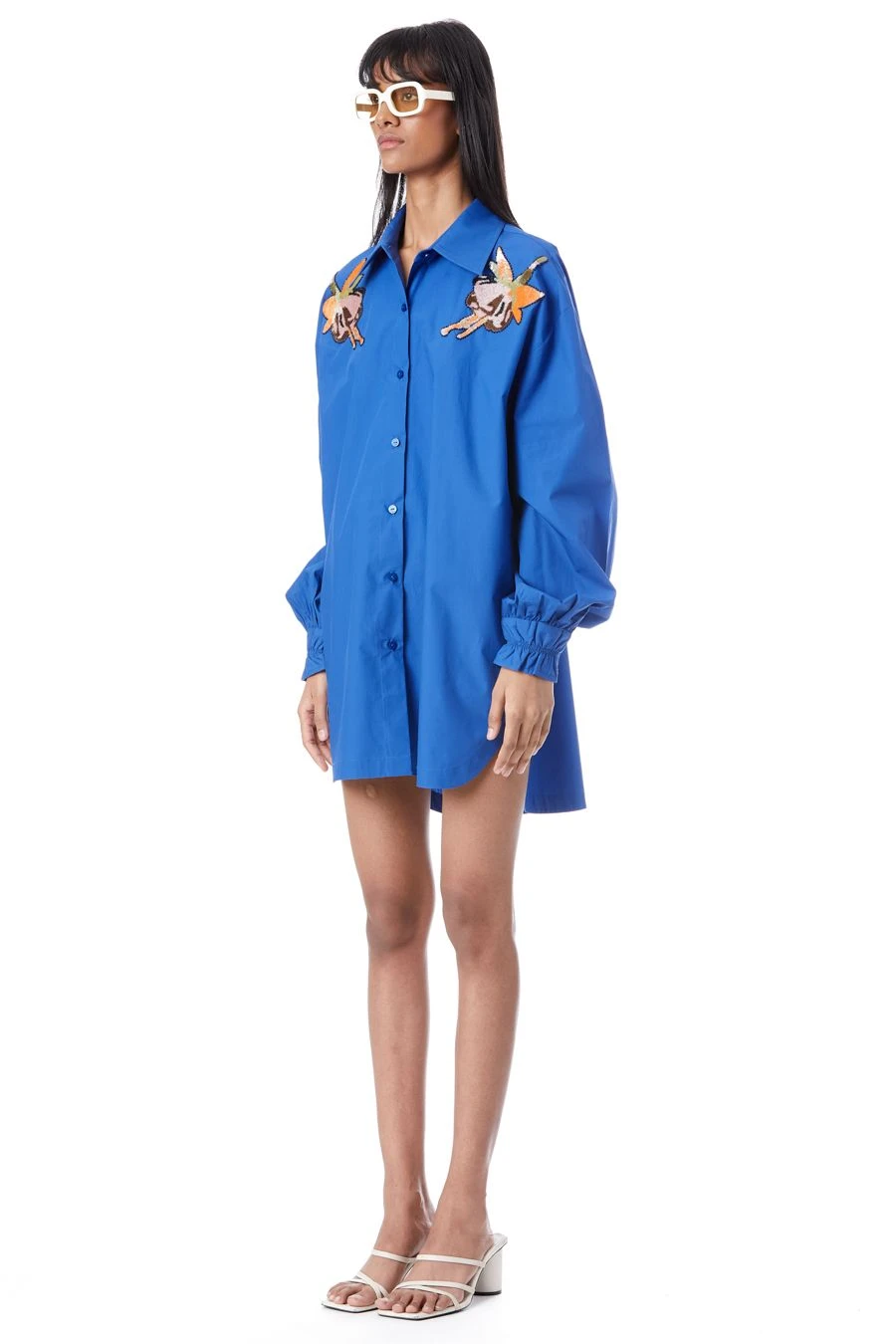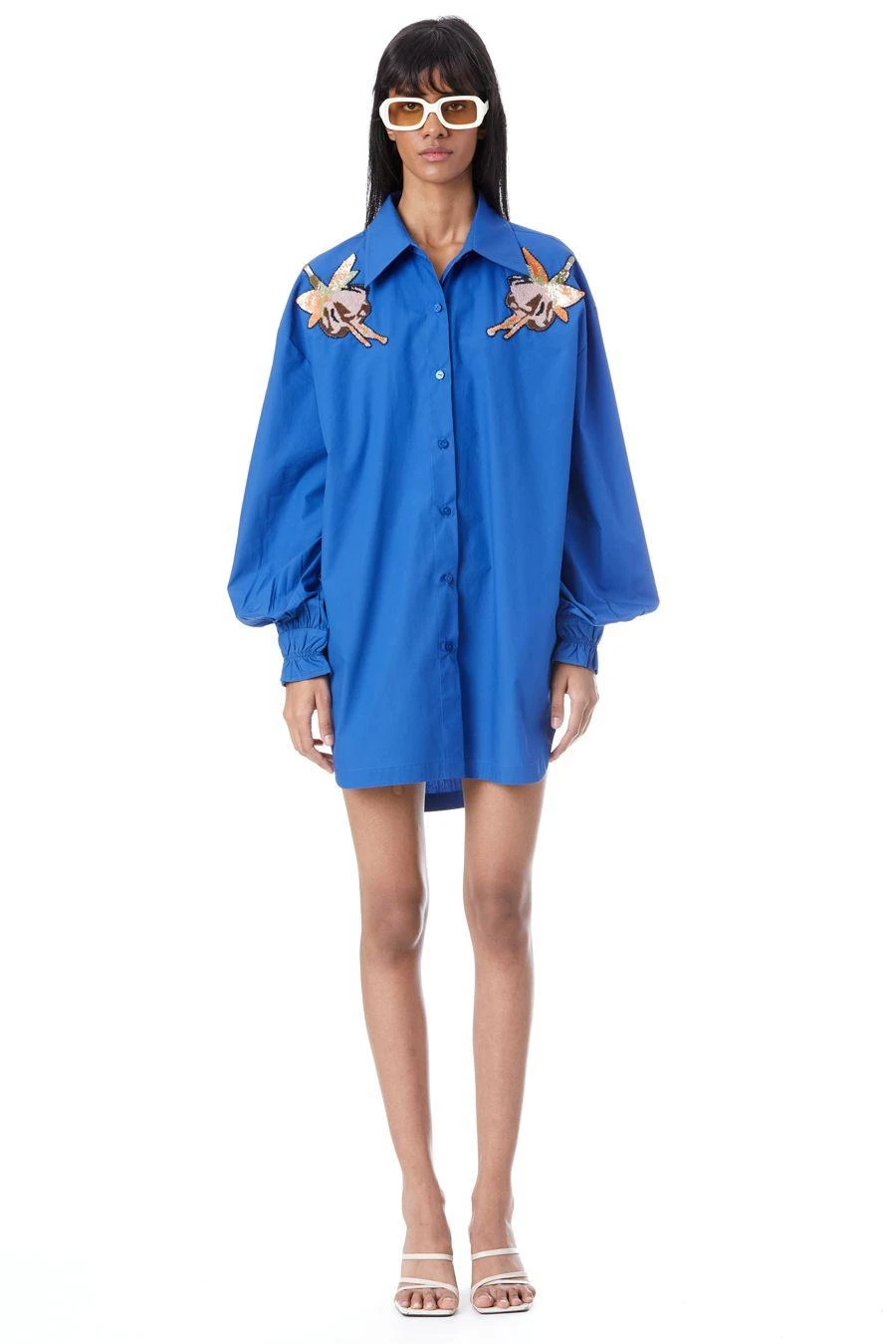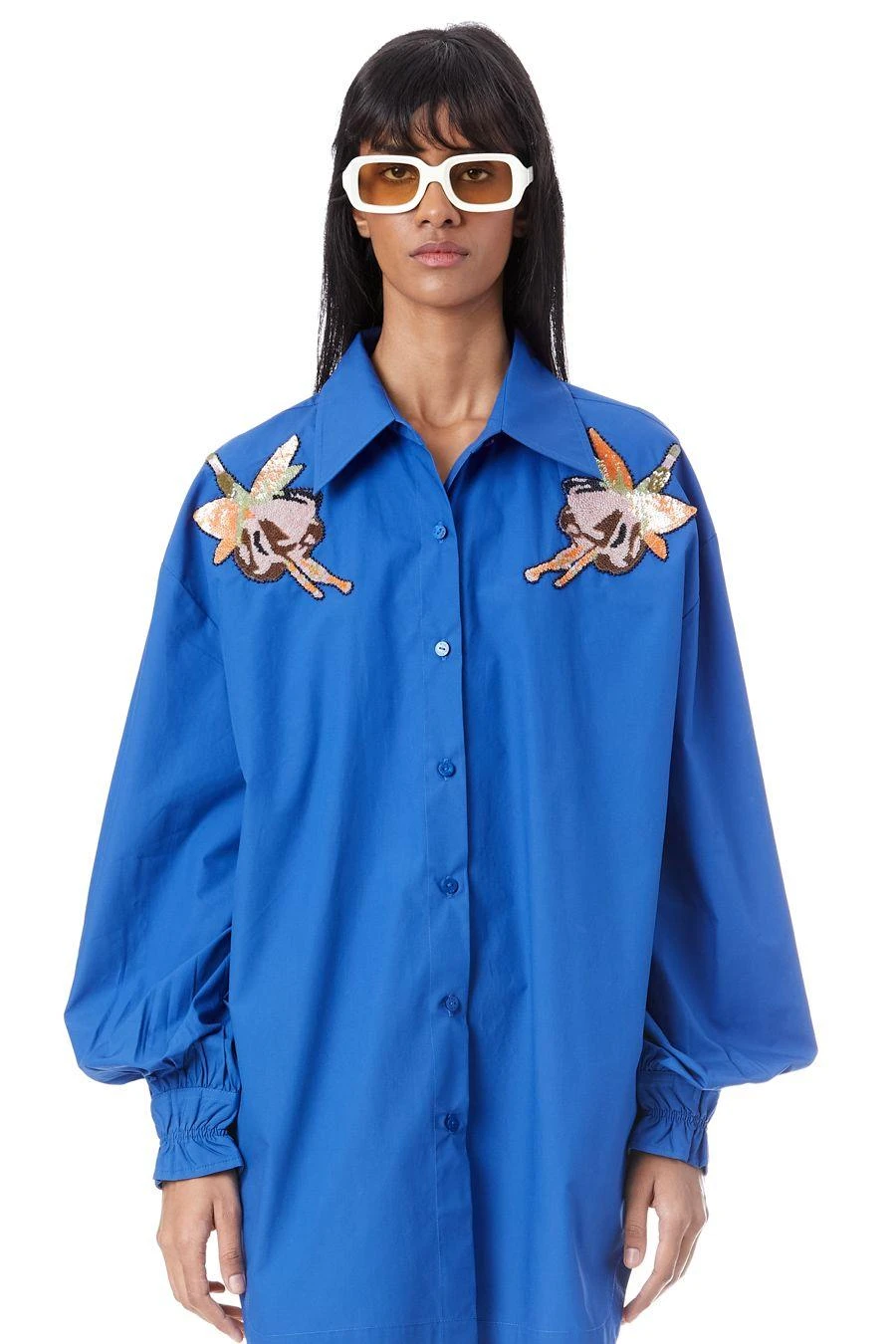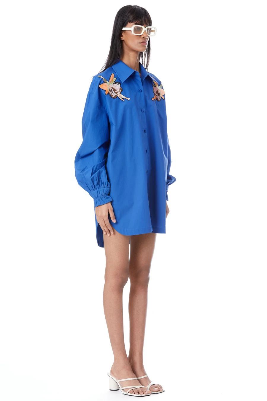 Look sartorially savvy with this blue shirt. Crafted in cotton, this collared buttoned down shirt features hand embellished details. Pair this shirt with blue denims to complete the set.