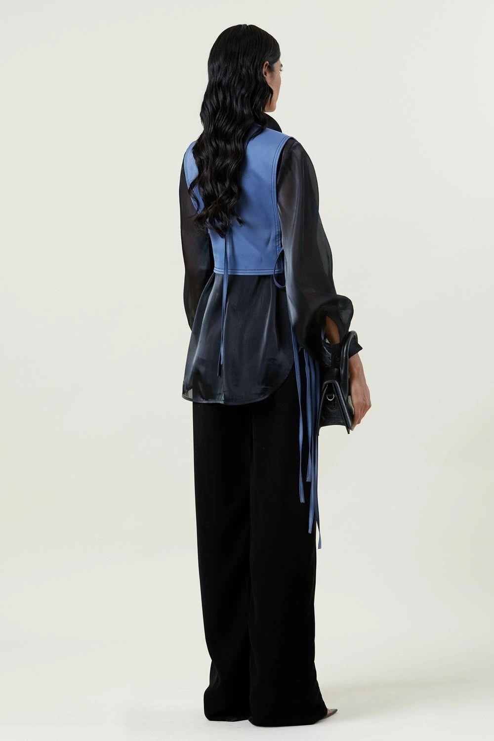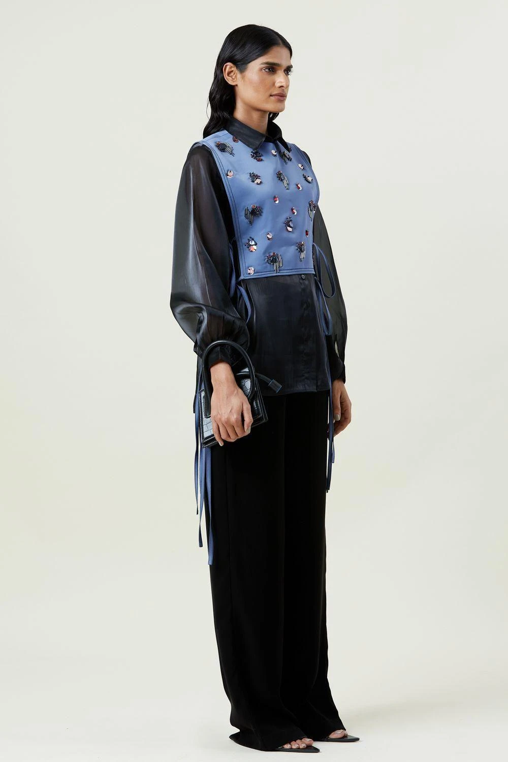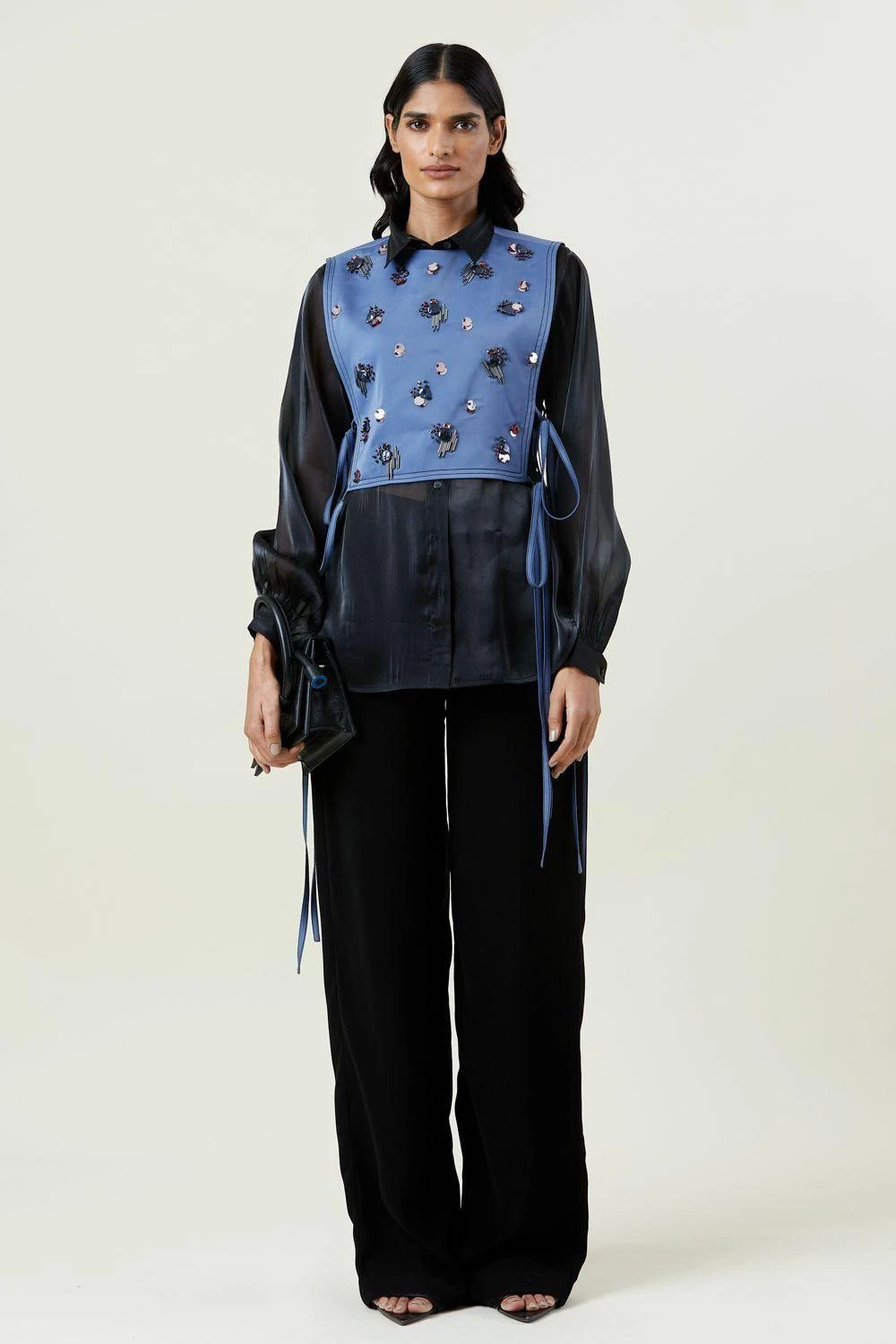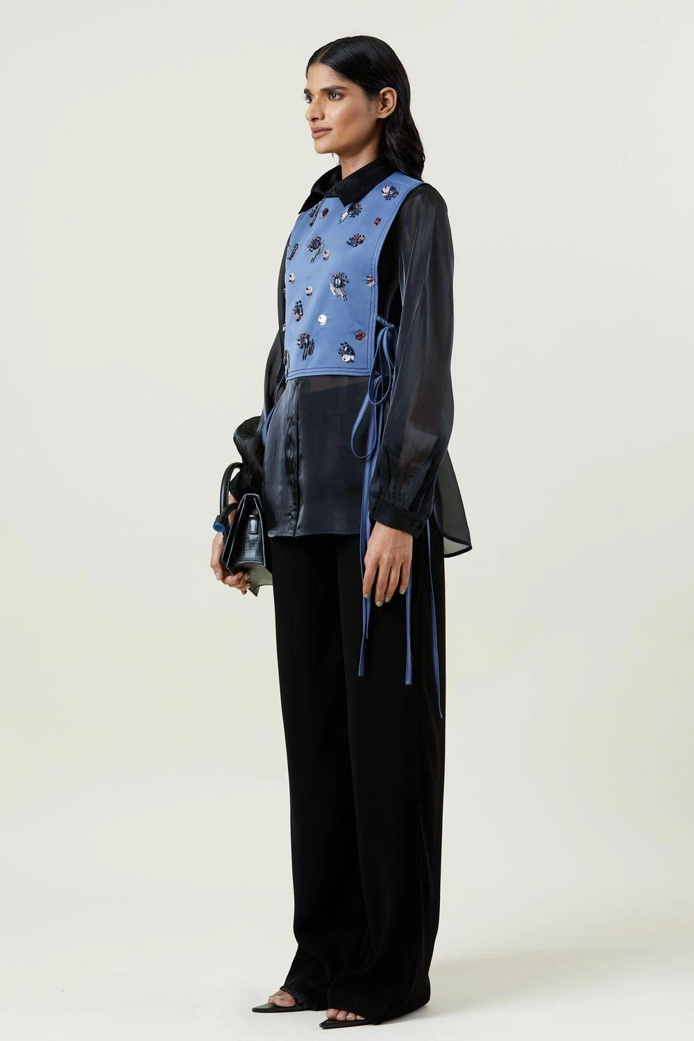 Dazzle in this Blue Embellished Bib with side tie-up detailing. Effortlessly chic, this piece adds a touch of glamour to any ensemble, making it a must-have for your stylish wardrobe.