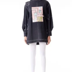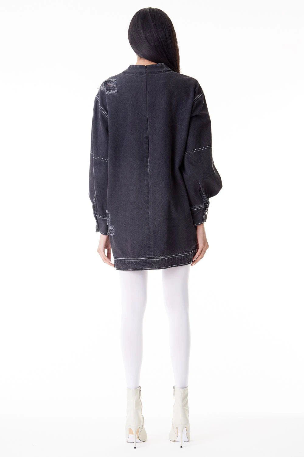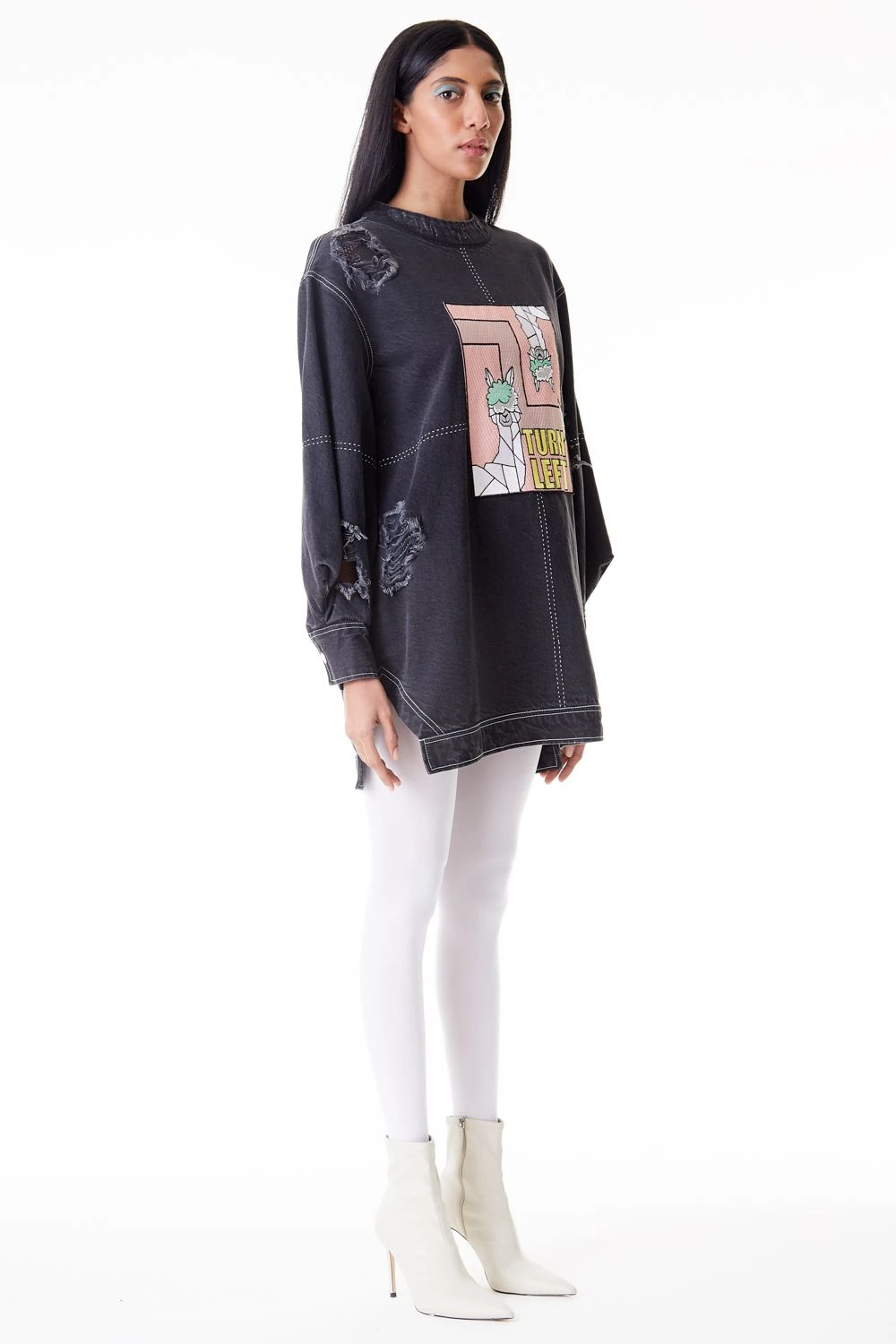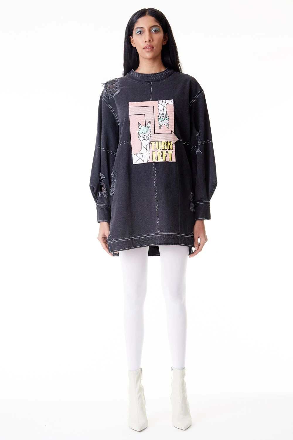 Kanika Goyal tweaks the classic LBD with a dash of fun & lots of quirk. This distressed black denim dress is cut in a relaxed fit with large bishop sleeves. It is highlighted with a graphic patch embroidered in the centre.