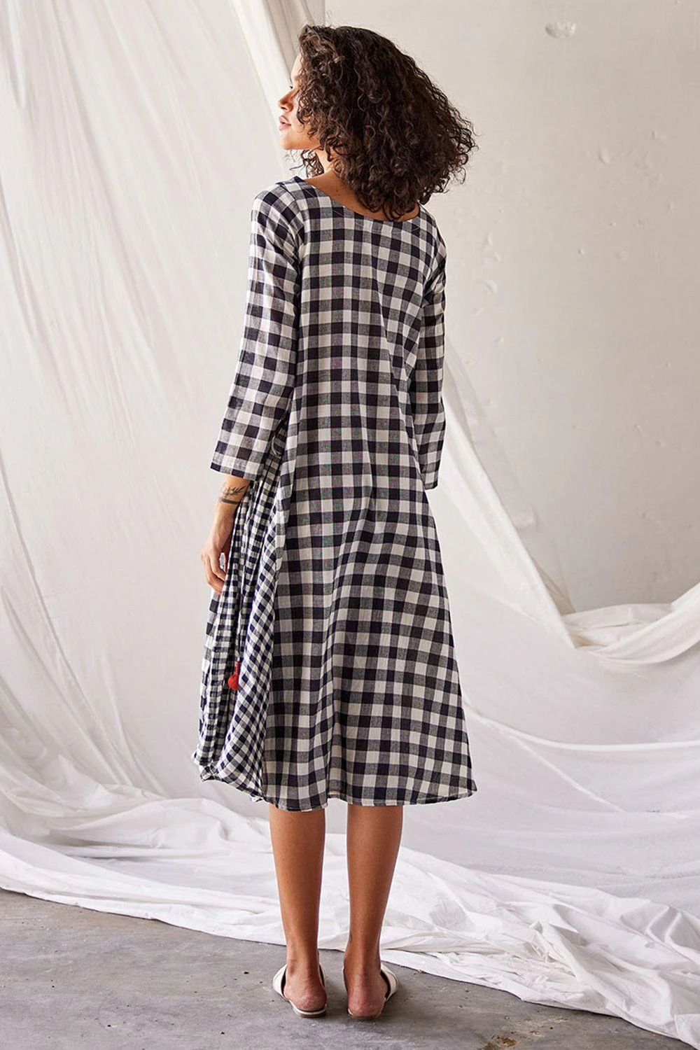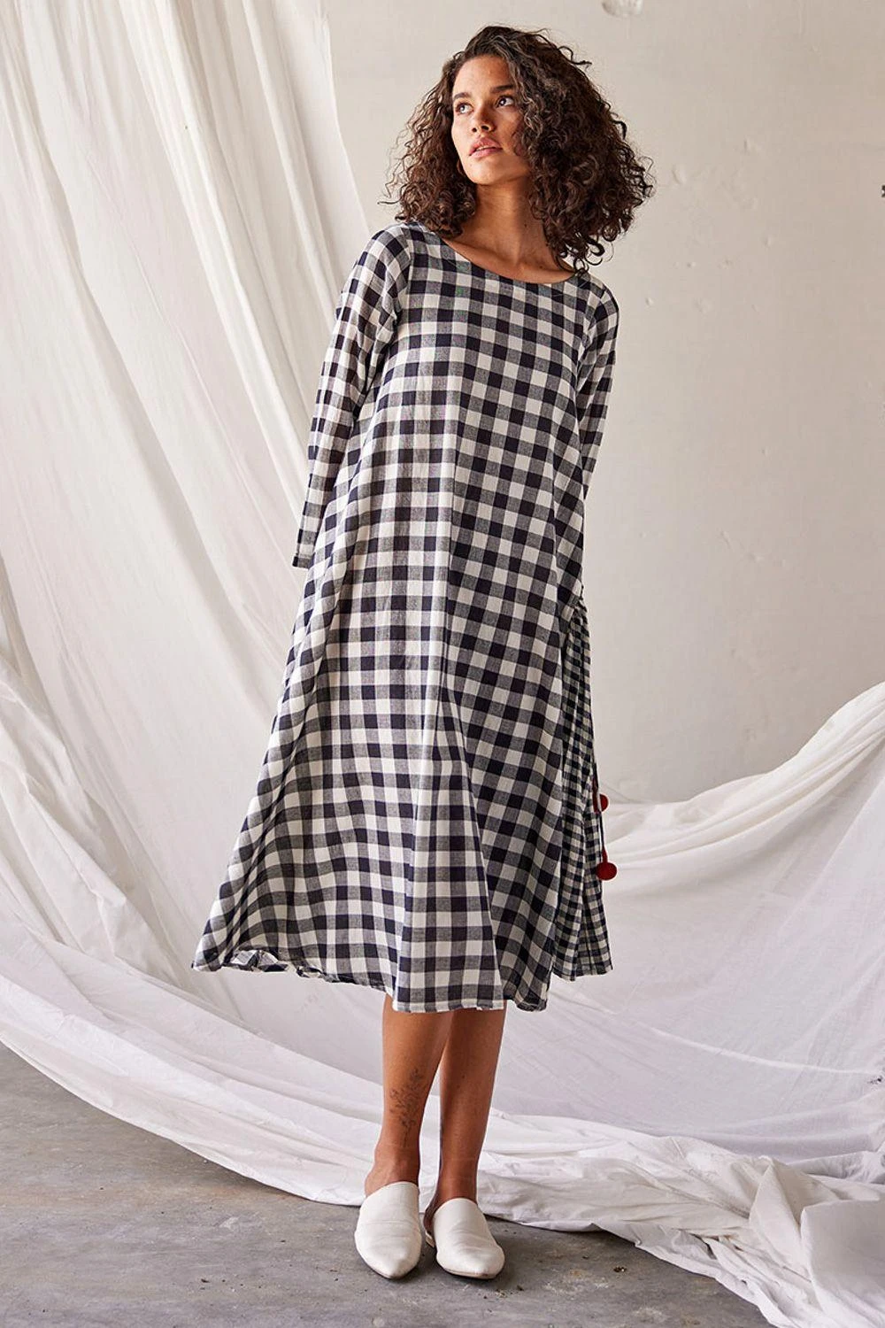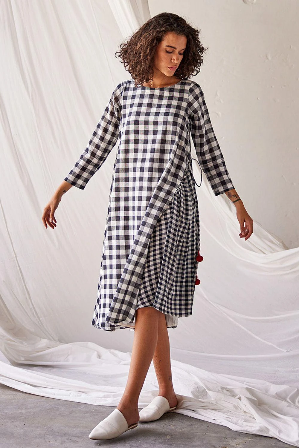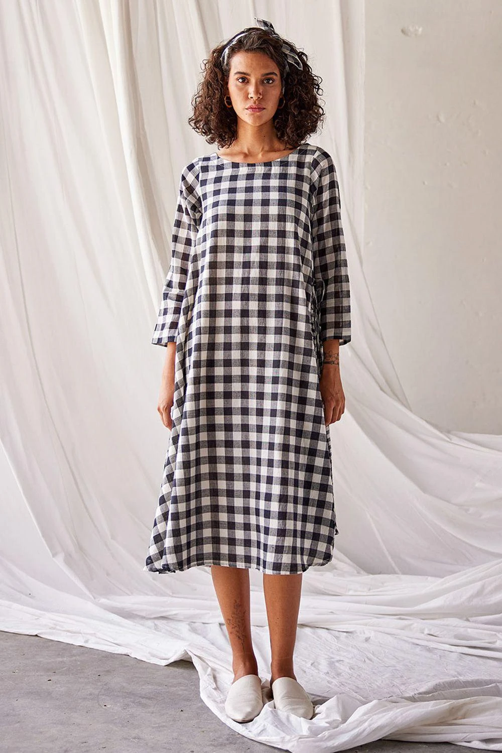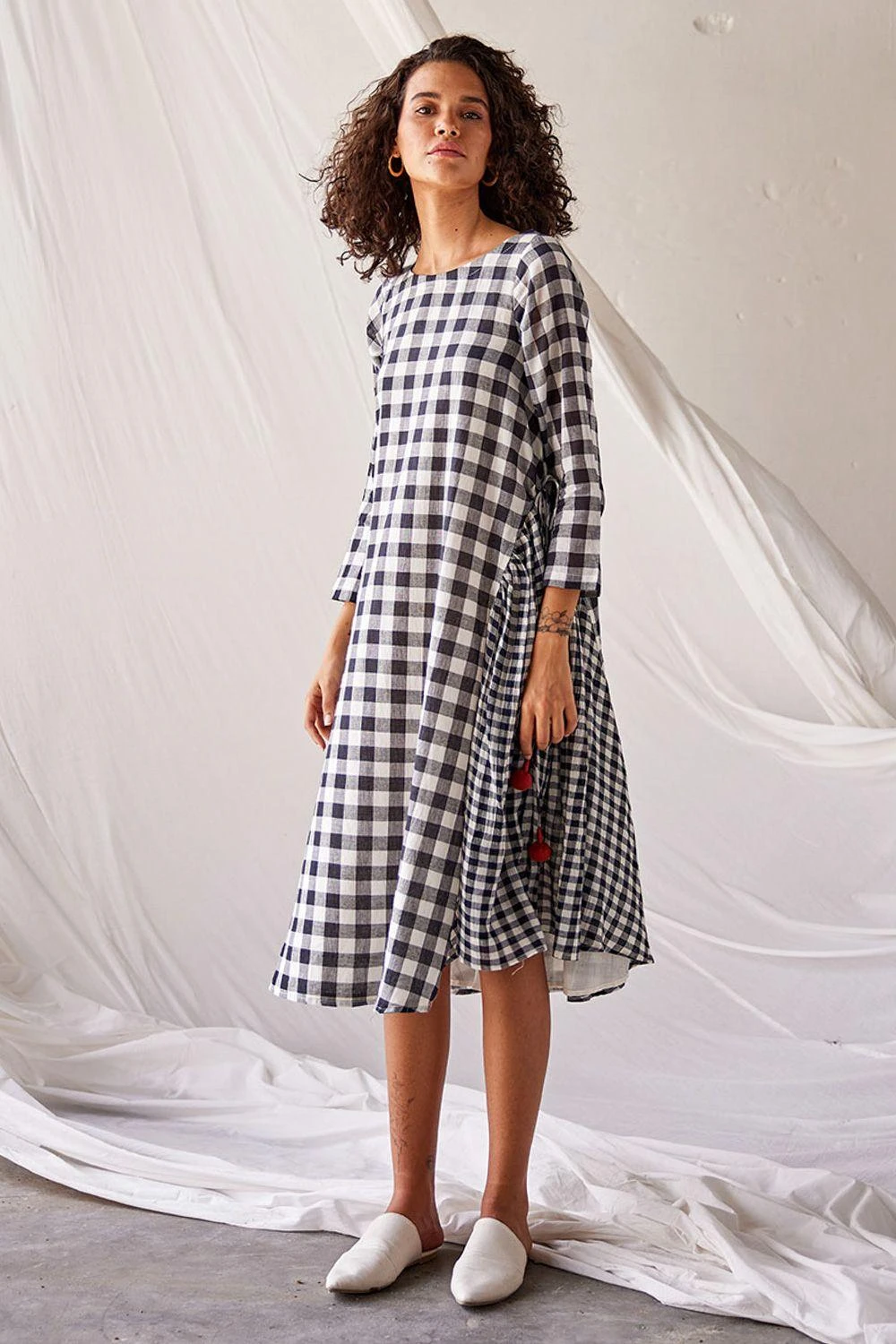 Elevate your style with this black and white check mul dress. Enhanced by side tie-up gather detail and chic 3/4 sleeves, it’s a symbol of effortless sophistication, completing your refined look.