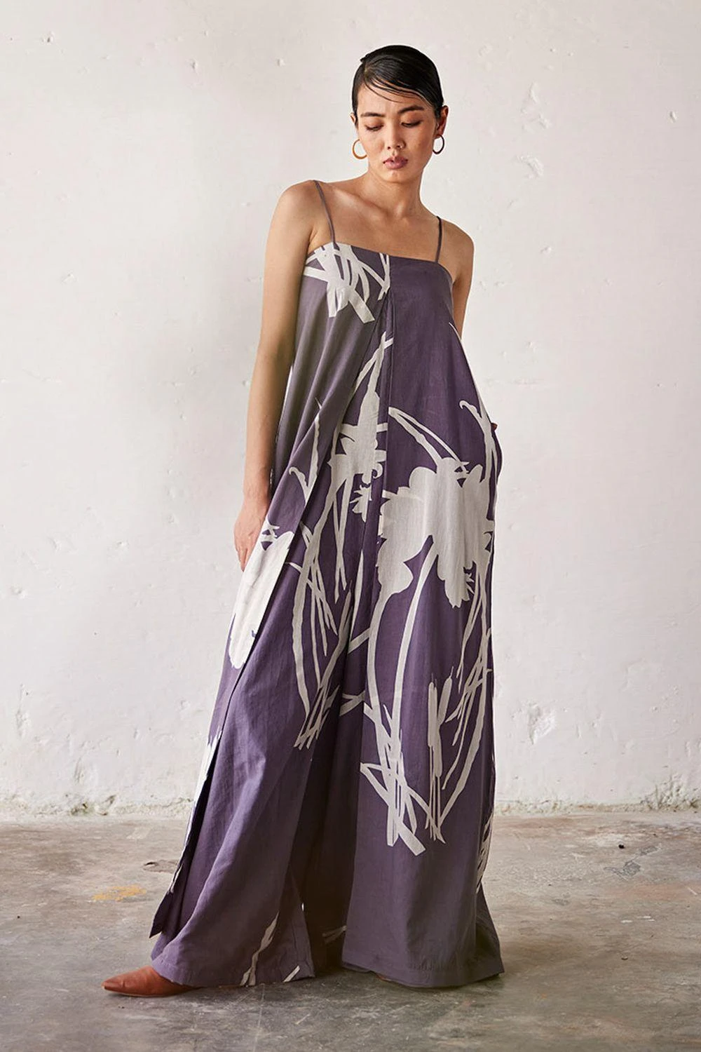Elevate your style with this cool grey lino print jumpsuit. Exquisite front pleat detailing, a chic zipper back opening, and a charming tie-up at the back make it a symbol of timeless sophistication.