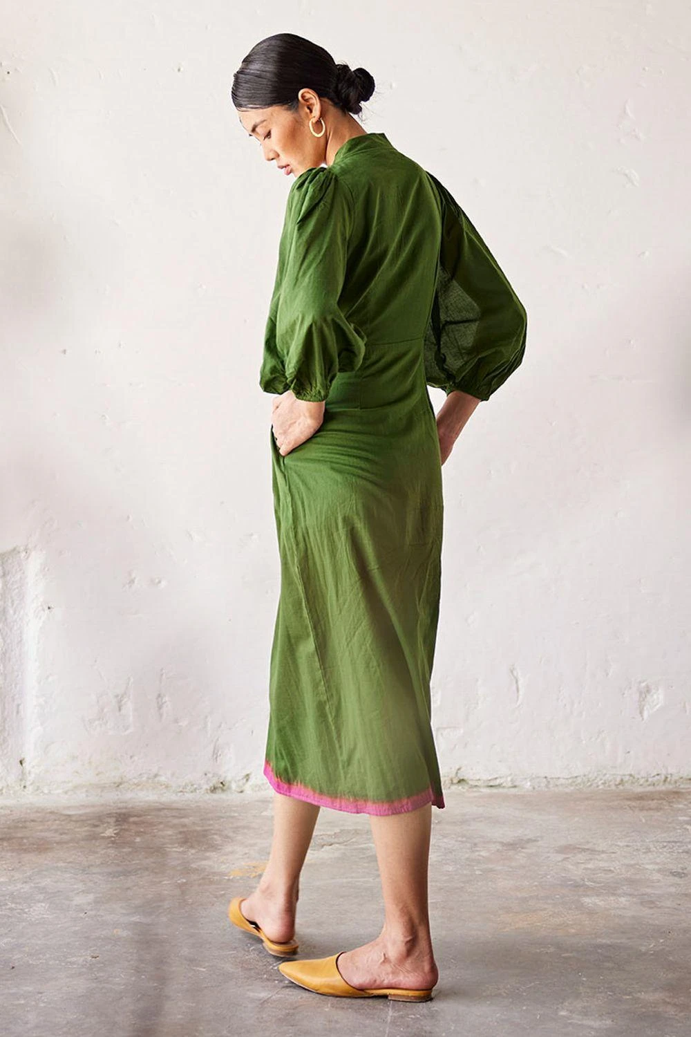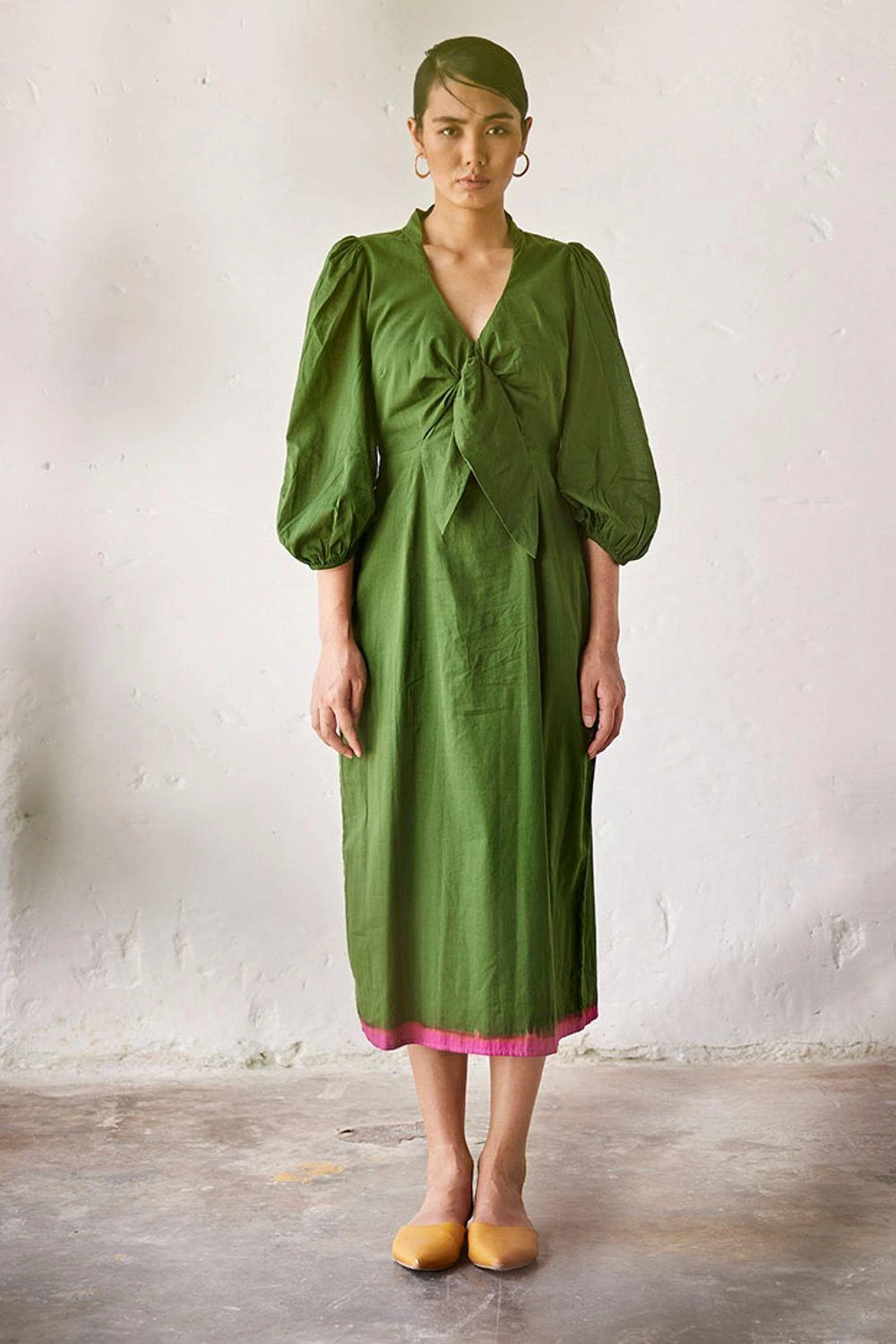 Indulge in refined elegance with this dark green mul dress. Featuring a charming tie-up front, a discreet side zip, and elegant elasticated sleeve hems, it’s elevated by a captivating pink dip-dyed hemline.