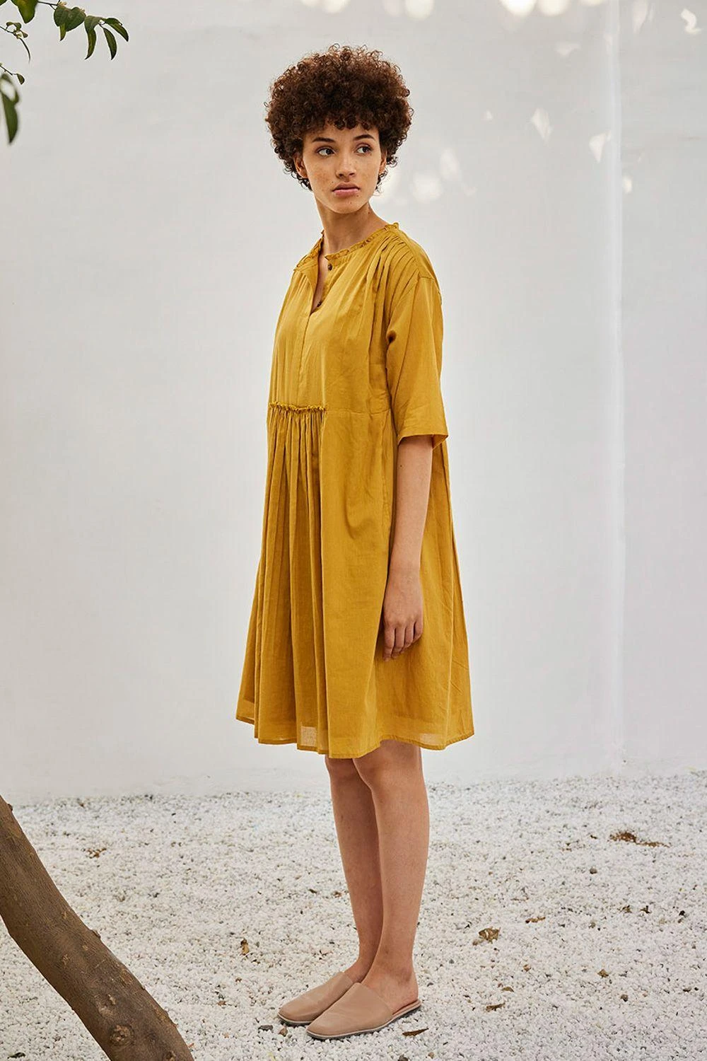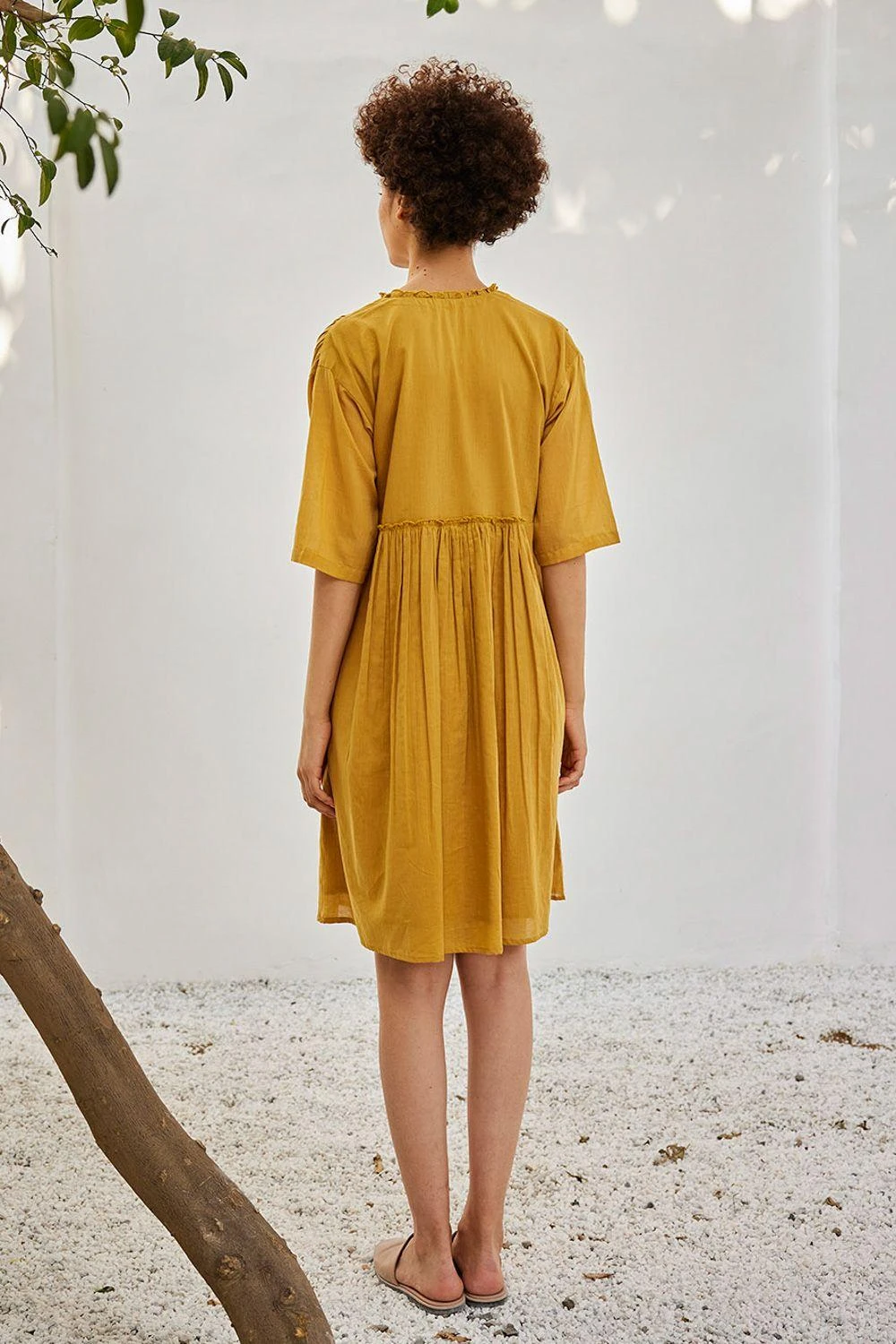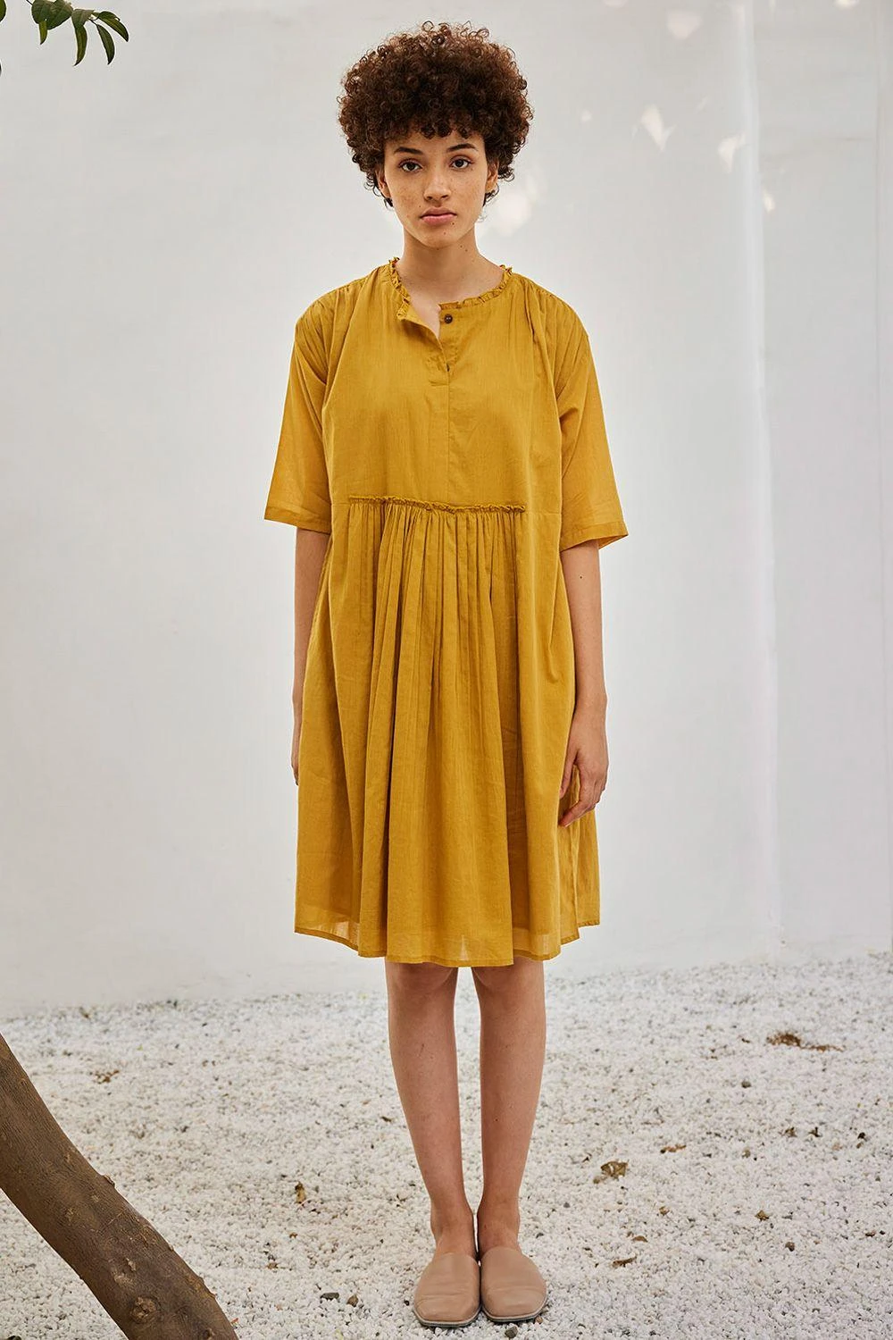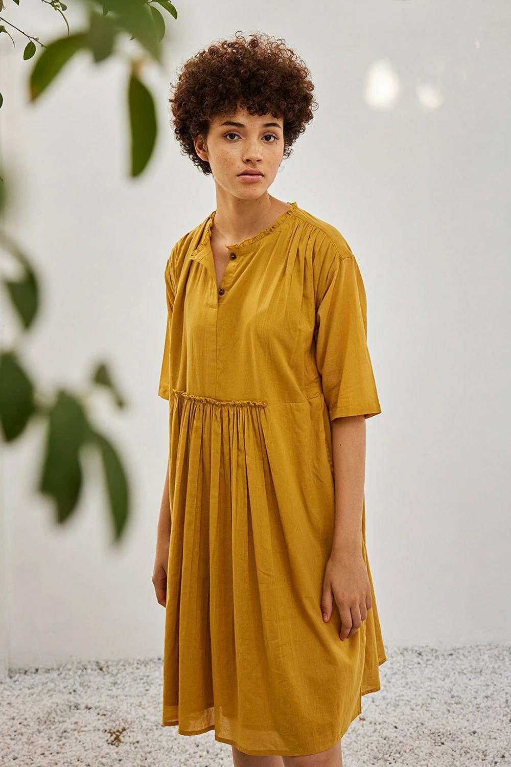 Elevate your wardrobe with this mustard yellow dress. Adorned with attached gathered panels at the front & back, delicate ruffles at the neckline, a front button opening, and gathers at the shoulder, it embodies a perfect fusion of grace and style.