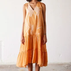 Radiate in this yellow-orange floral lino print midi mul dress. The V neckline, graceful shoulder gathers, and cascading frilled tiers epitomize a vibrant, yet refined, fashion statement.