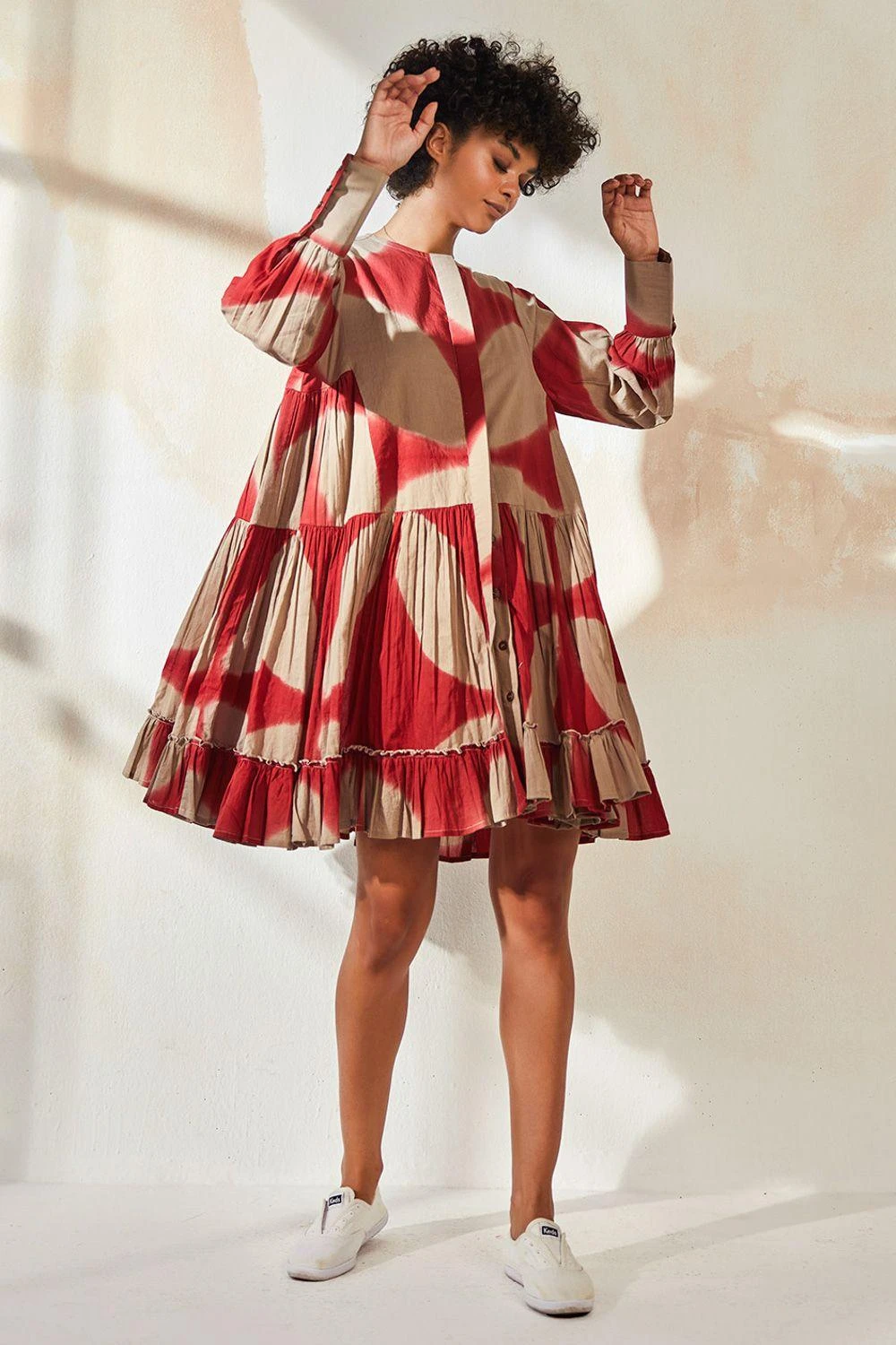 Embrace elegance in this stunning clamp-dyed short dress. Adorned with long cuffed sleeves and a charming frilled hem, it boasts a hidden front placket and full lining for a seamless look.