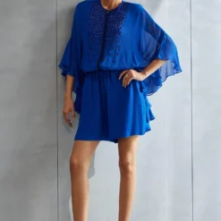 Elevate your summer wardrobe with this steel blue linen jumpsuit. Its V neckline, back zip opening, and flared bottoms exude timeless elegance, promising a chic and sophisticated look.