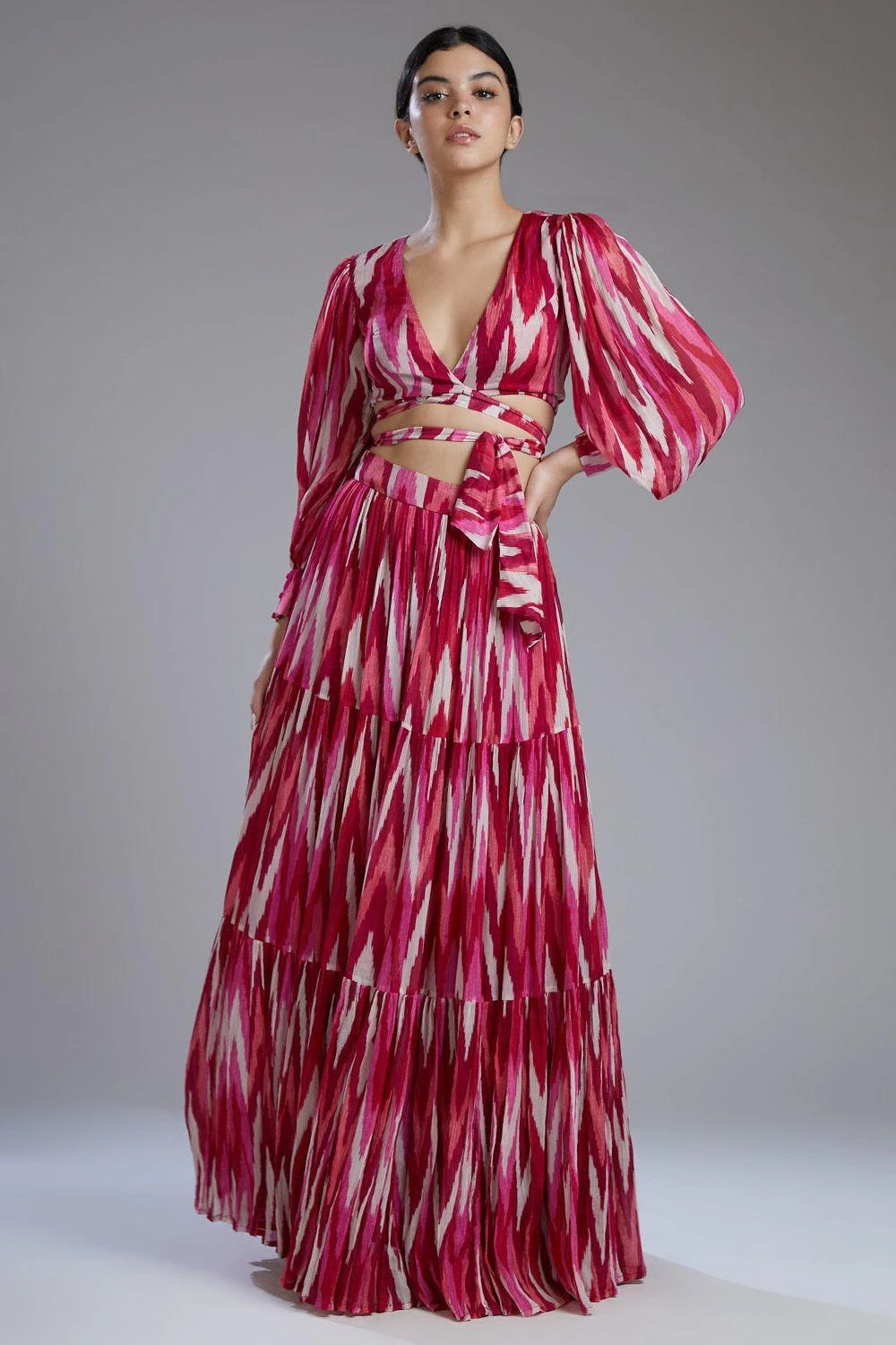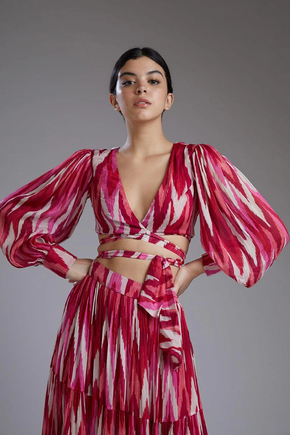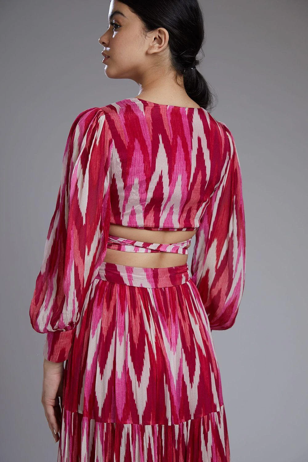 KoAi Chiffon White & Pink Dabu Zig Zag Bow Tie Top