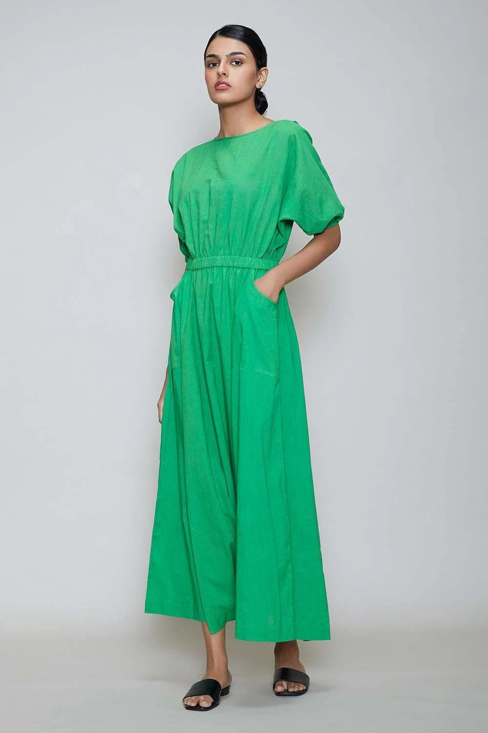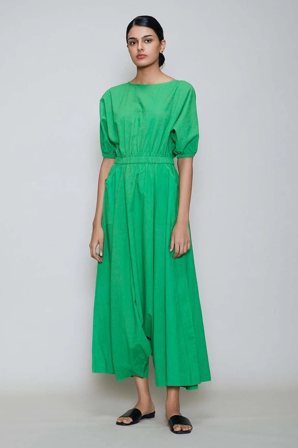 A vibrant, playful & super comfortable jumpsuit made in a refreshing green hue in cotton. It features back button closure with side pockets and a smocking waist. Dress it up or down, that suits your mood, with a few tricks of styling.
