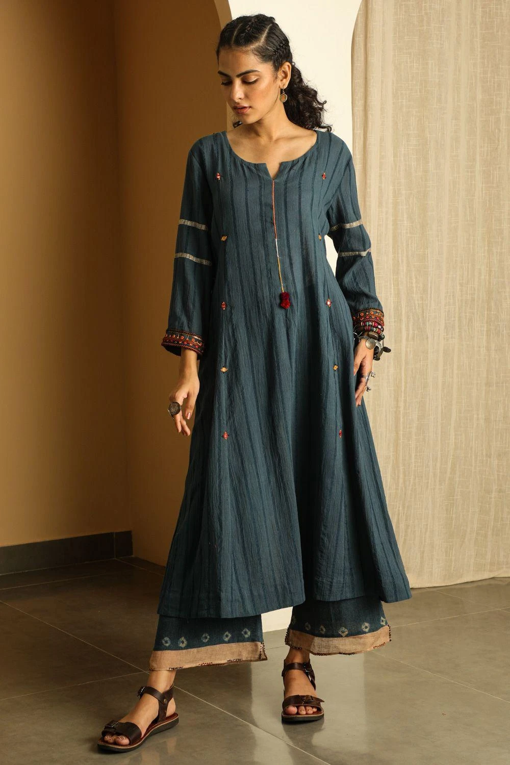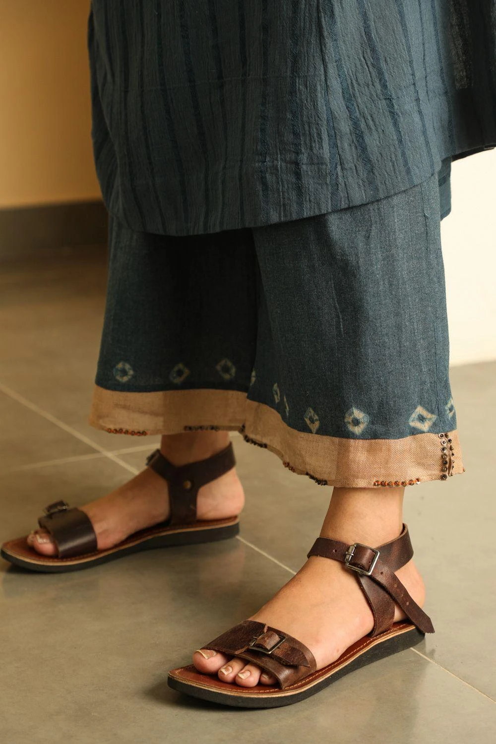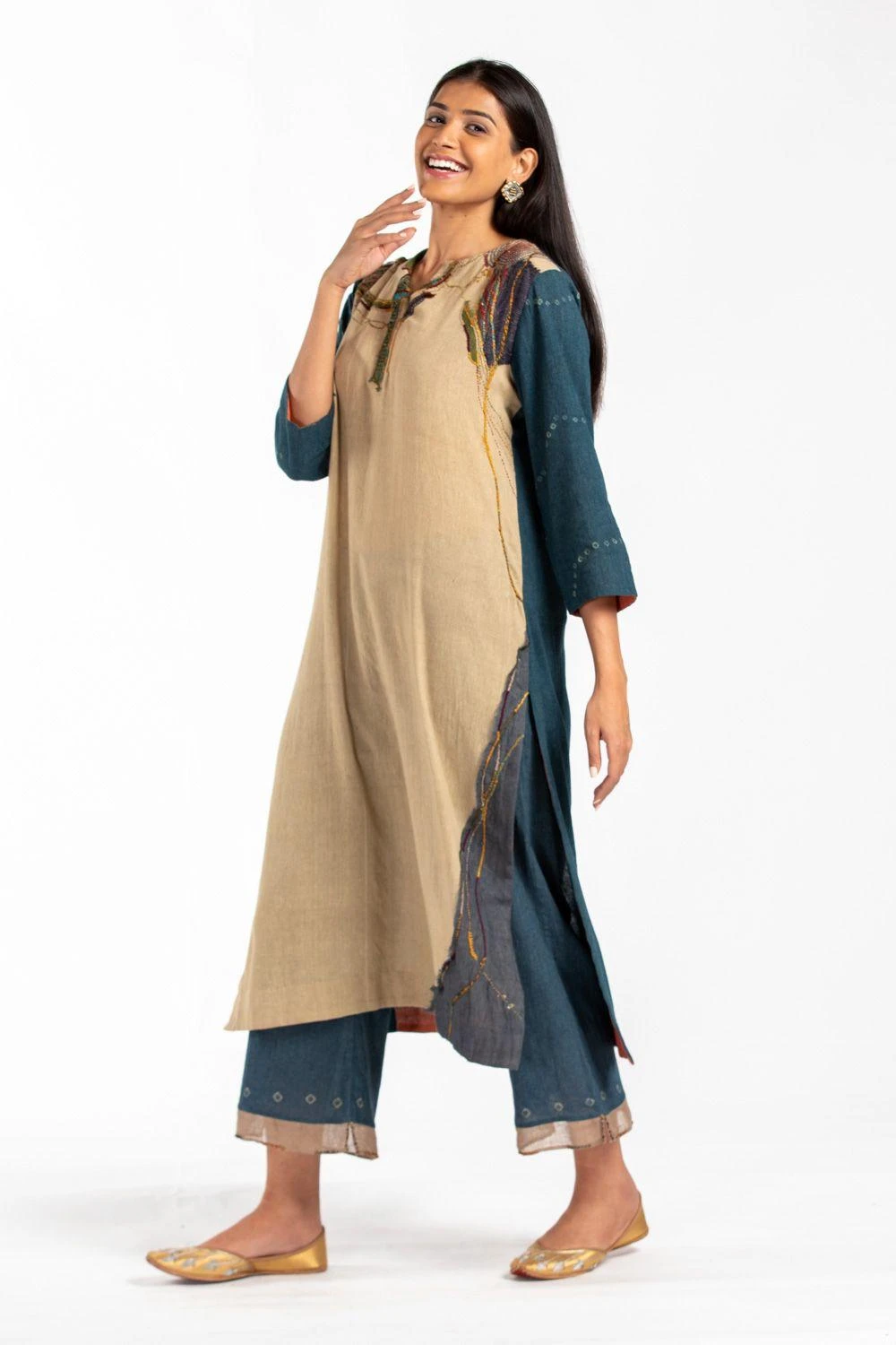 These soothing blue sheer pants are cut in cotton in a relaxed silhouette with bandhani print & hand work details at the hem. These pants are a definite staple piece.