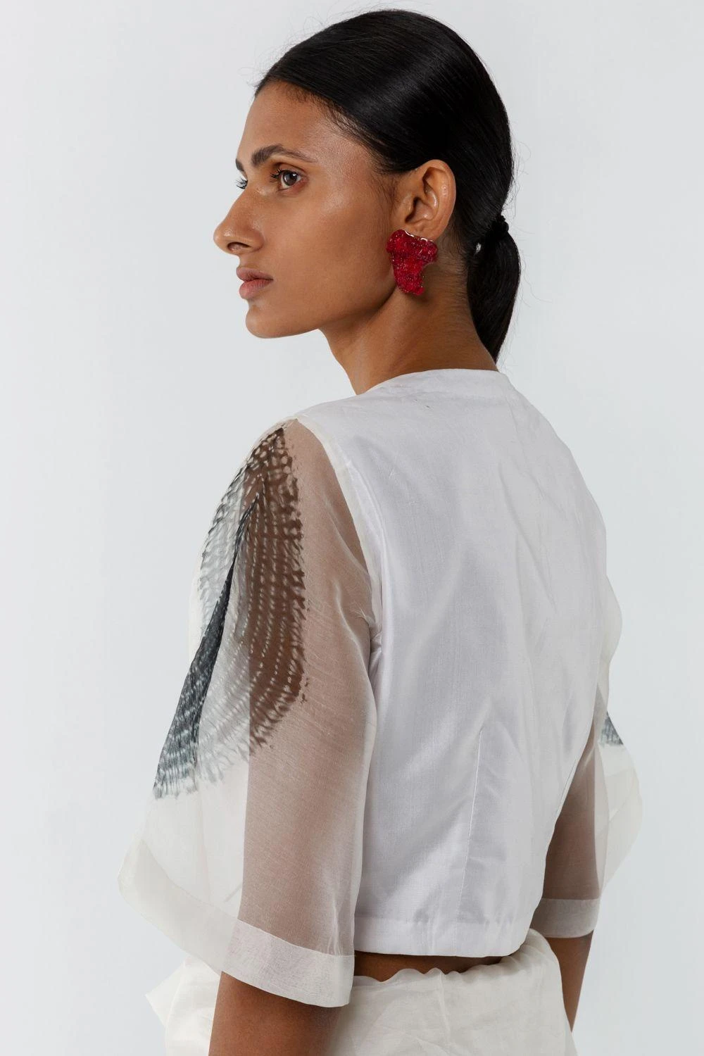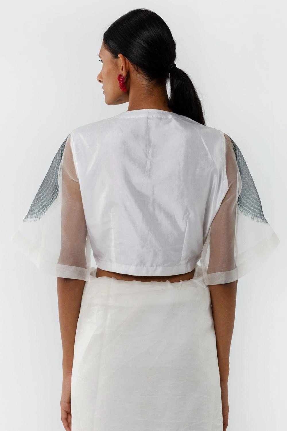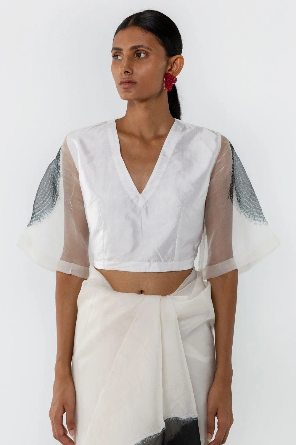This hand woven silk V-neck blouse is dyed in white and features a black nui-shibori detail on sheer organza sleeves. You can team it up with a coordinating sari from the collection.