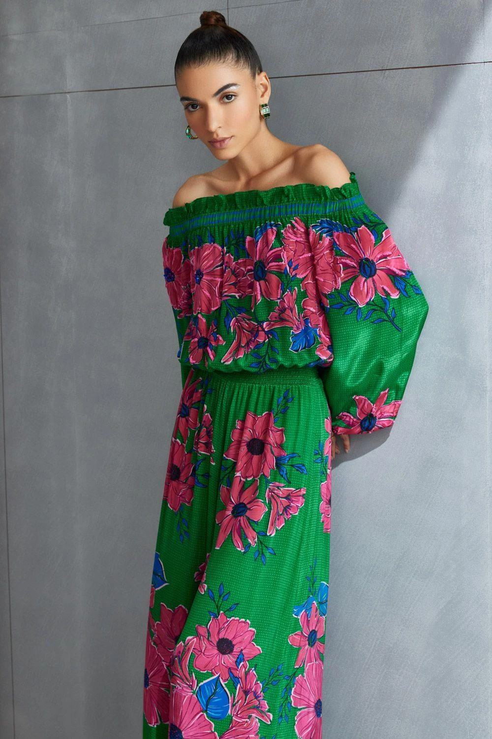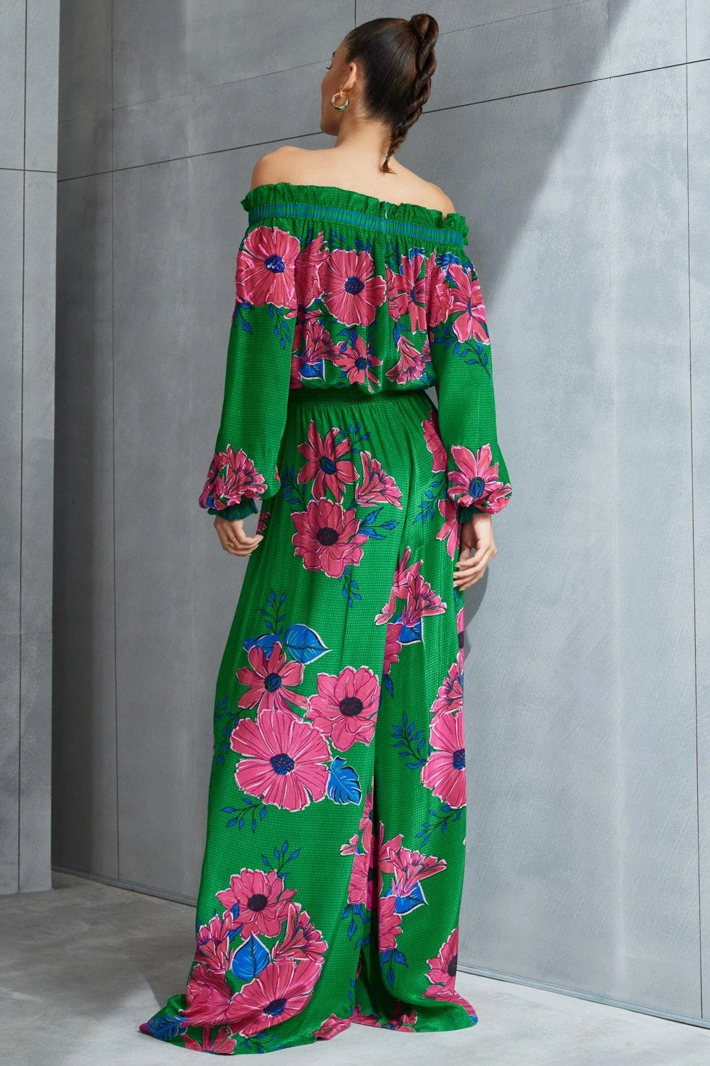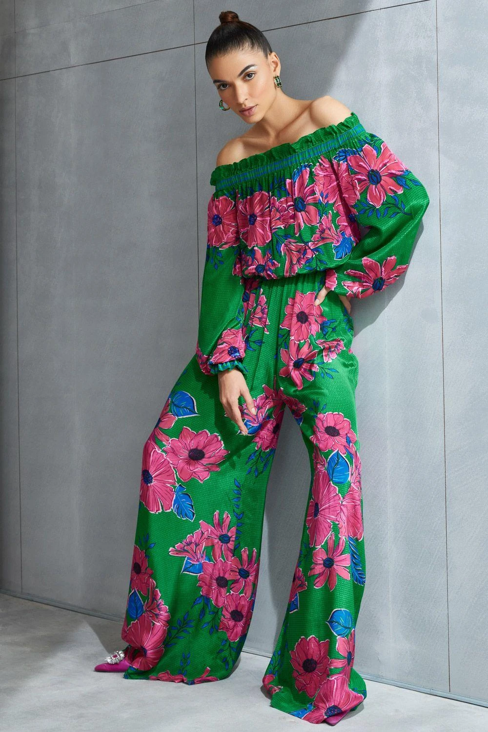 Elevate your style with the Zinnia Jumpsuit. Effortlessly chic, the off shoulder design adds a touch of drama to this modern ensemble, perfect for making a statement. Add a pair of dangler earrings to complete the look.