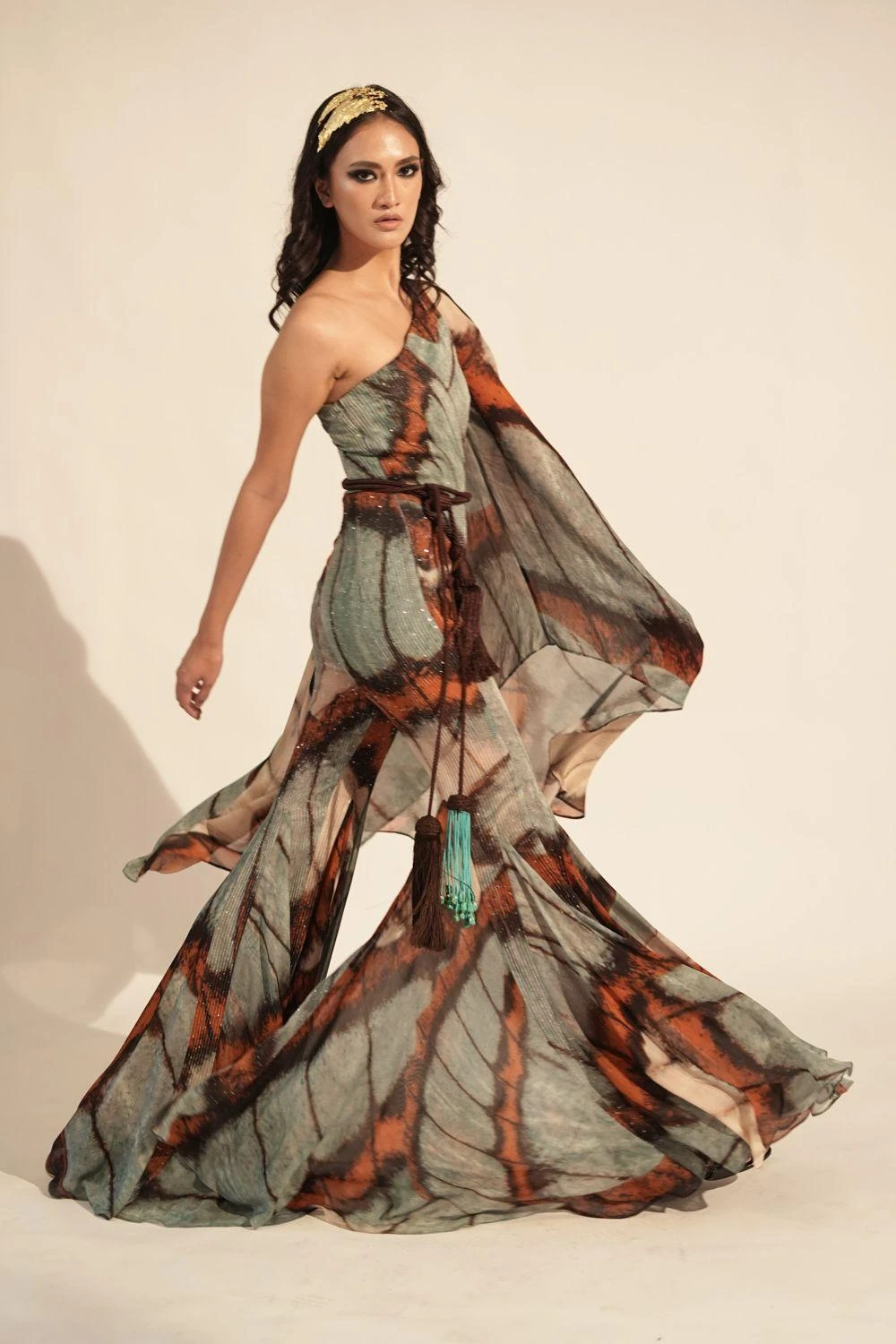 Look effortlessly stylish with this cape style jumpsuit. Crafted in georgette, this one shoulder jumpsuit features an abstract butterfly print all over. Add a pair of dangler earrings to complete the look.