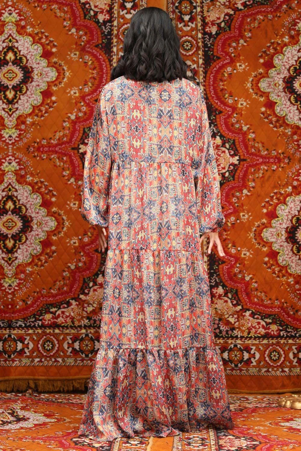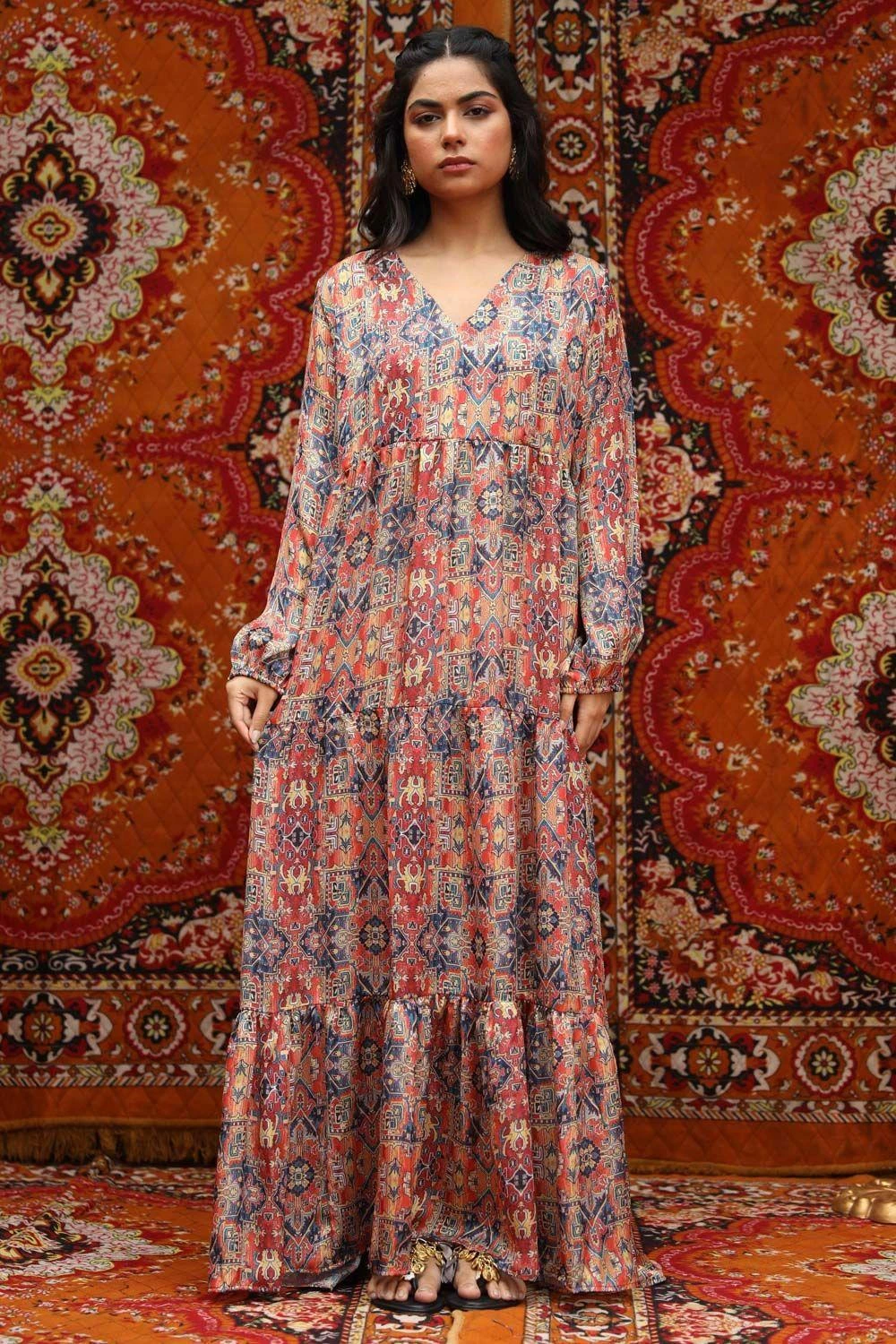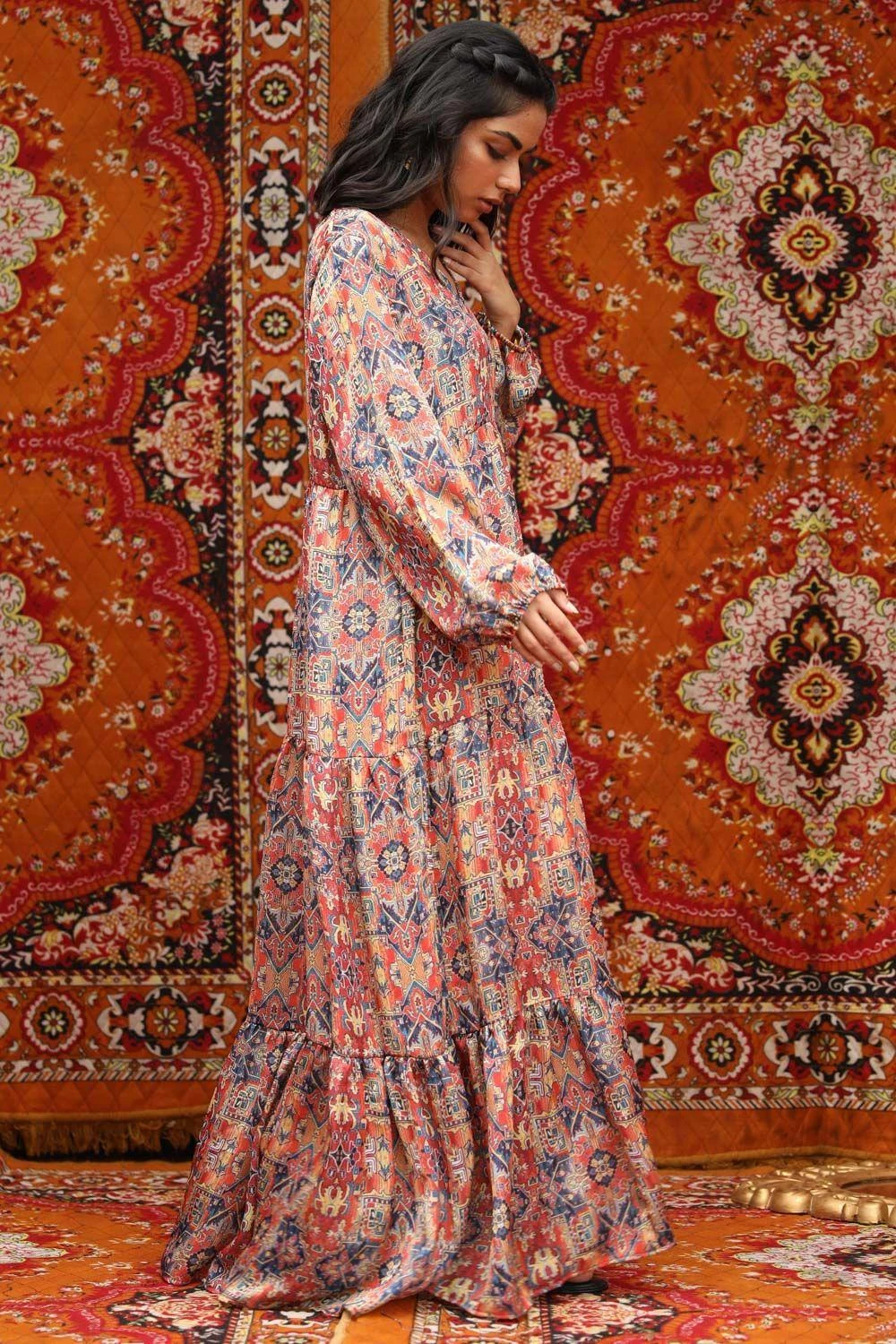 Add a layer of statement & glamour to your resort getaways with this dress. Crafted in satin georgette, this maxi dress features an abstract print. Embrace the tropical spirit and elevate your style effortlessly with this extraordinary piece.