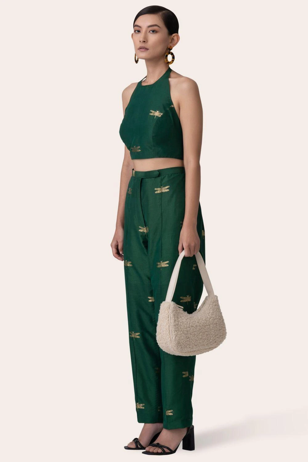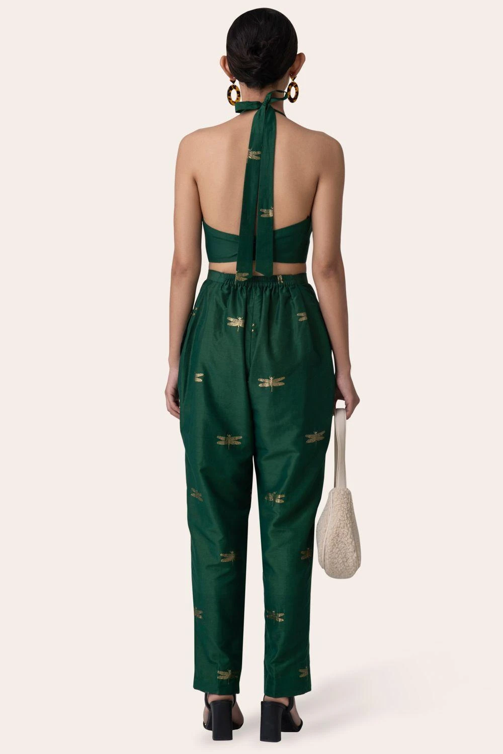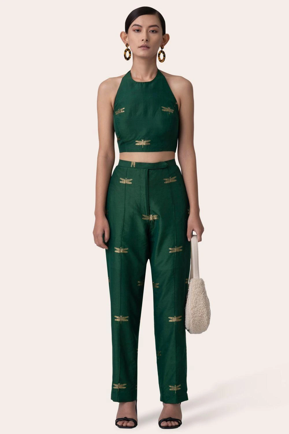These narrow fitted dragonfly trousers are exquisitely handwoven using the traditional kadua technique in silk, making it an investment worthy piece. The luscious silk fabric is adorned with dragonfly motifs in gold zari.