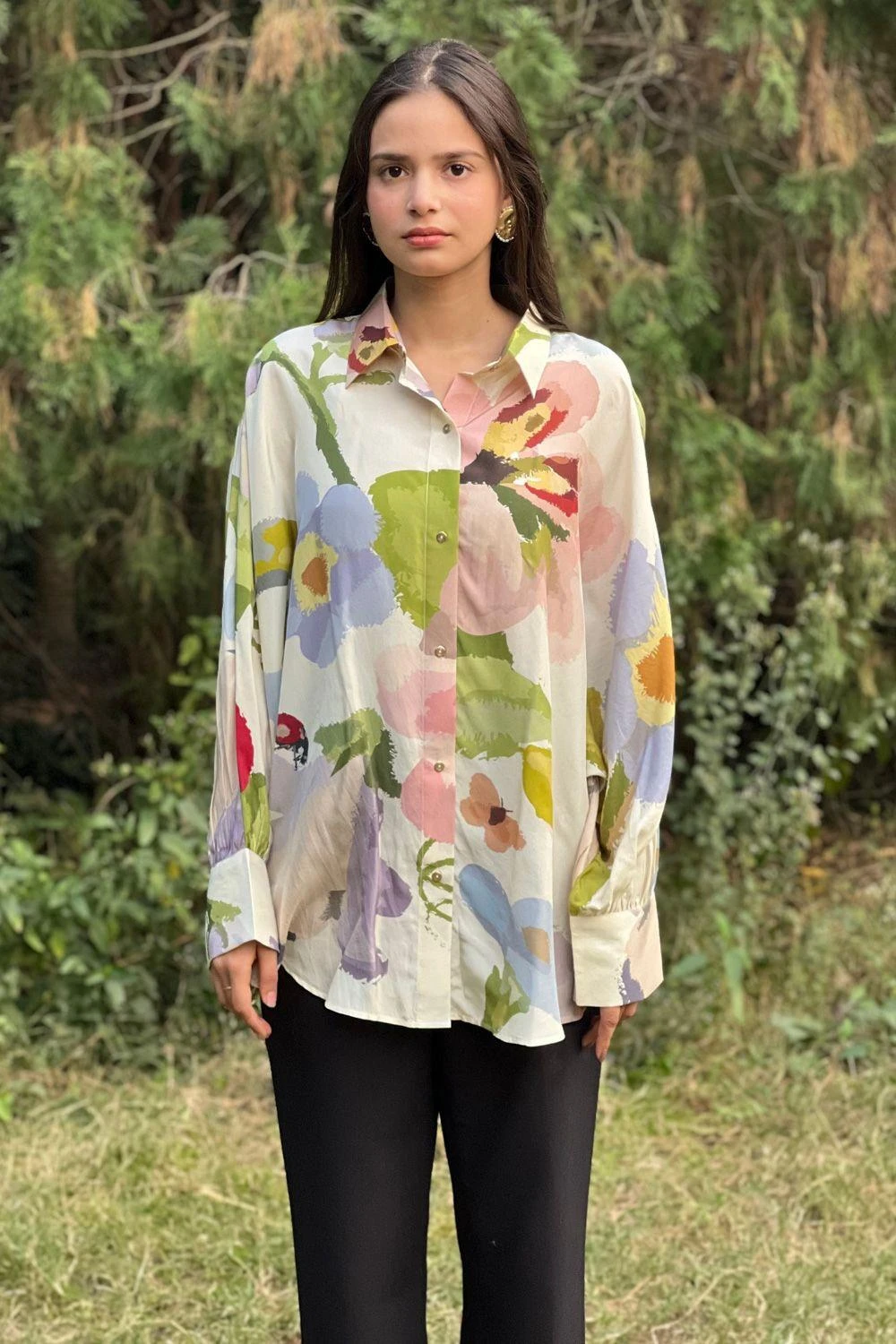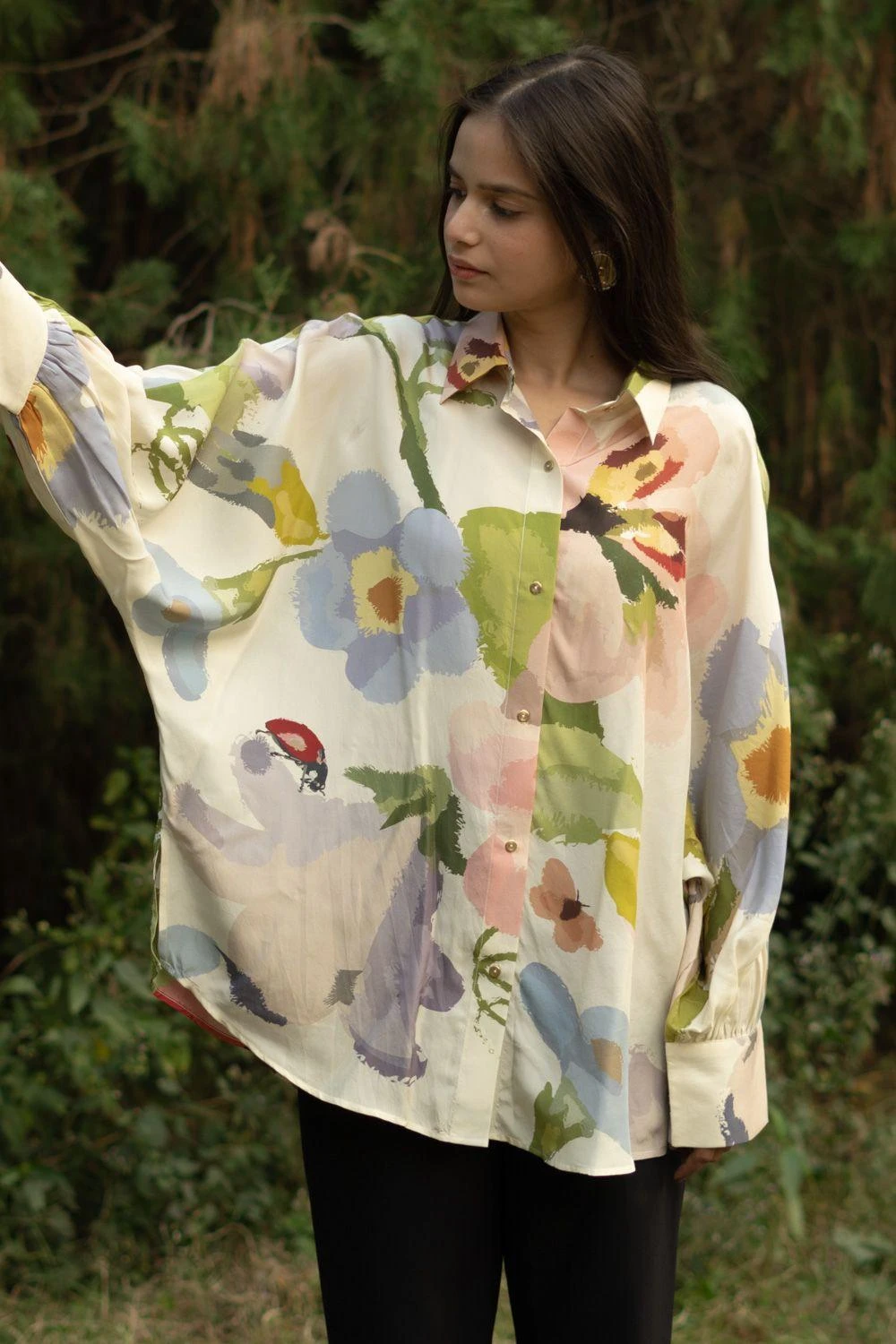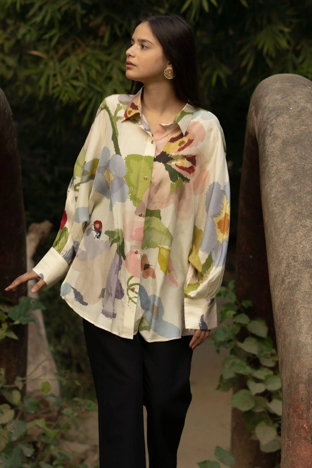 In the tapestry of elegance, the oversized silk shirt unfoldsùa canvas of artistry, adorned with signature brass buttons. Dolman sleeves embrace chic comfort. An enchanting choice for outings & leisurely brunches. Elevate your moments with grace.