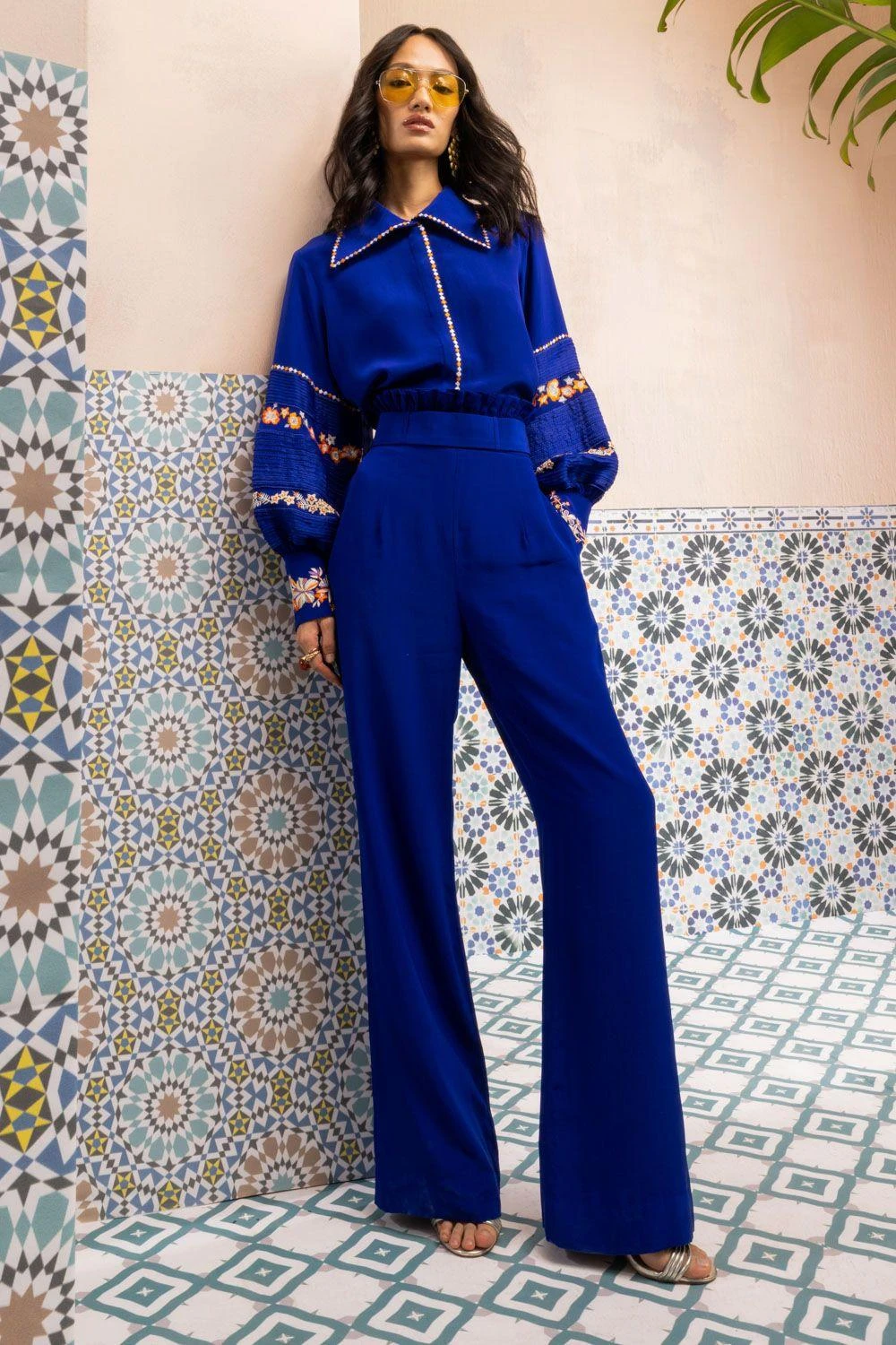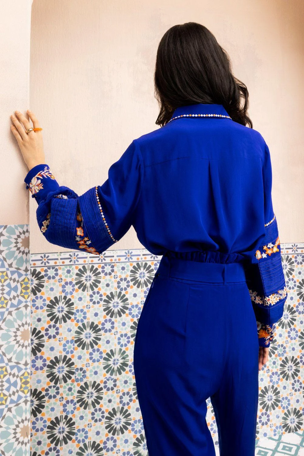 Elevate your wardrobe with this Zoe Moroccan Blue Shirt. Intricately threaded with ivory katdana using delicate techniques like French knots, this pure silk crepe piece exudes elegance and timeless beauty.