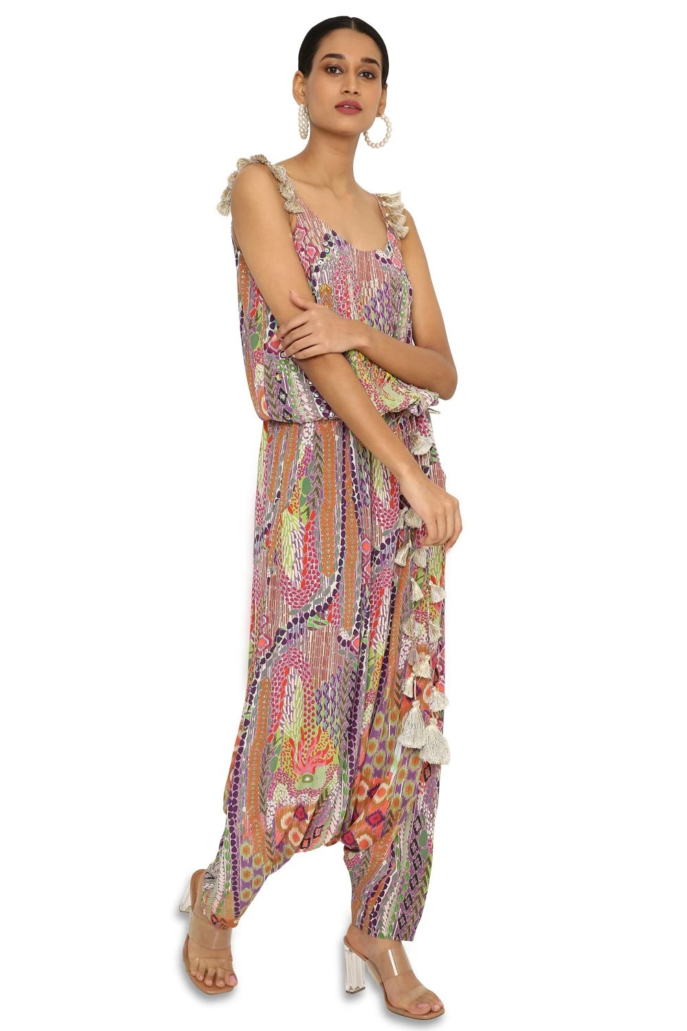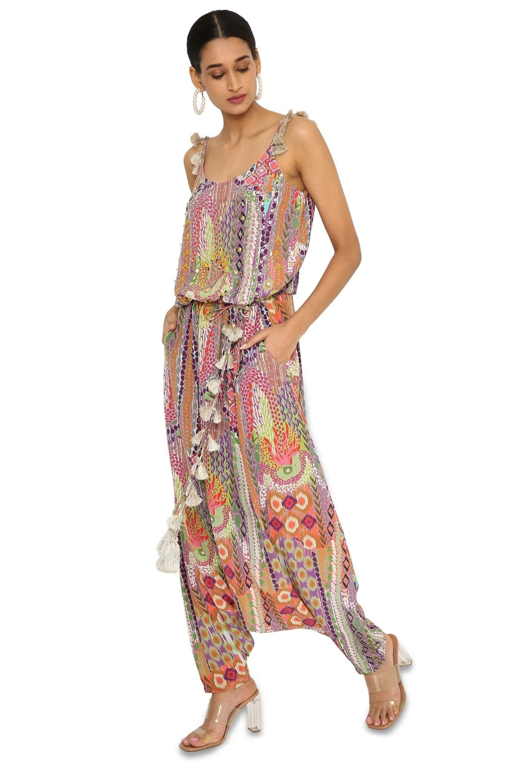 On a vacation or at a celebration, this multi-coloured printed jumpsuit will suit all your occasions. It is cut in crepe and is uplifted with embroidery and tassel detail. Style it with a pair of statement earrings to finish your look.