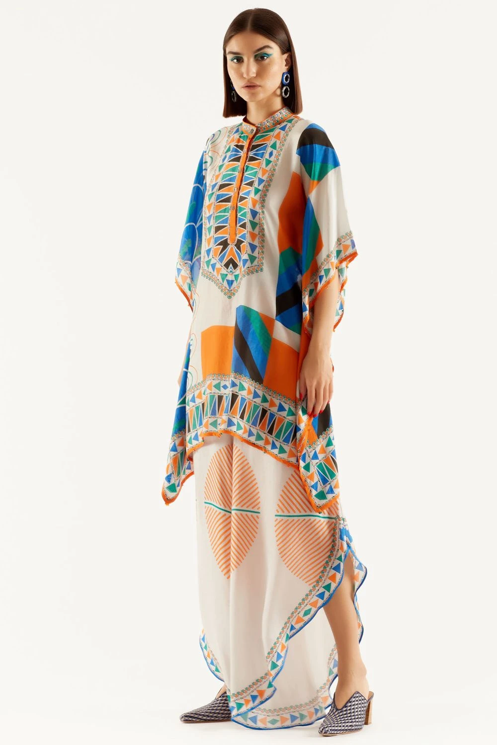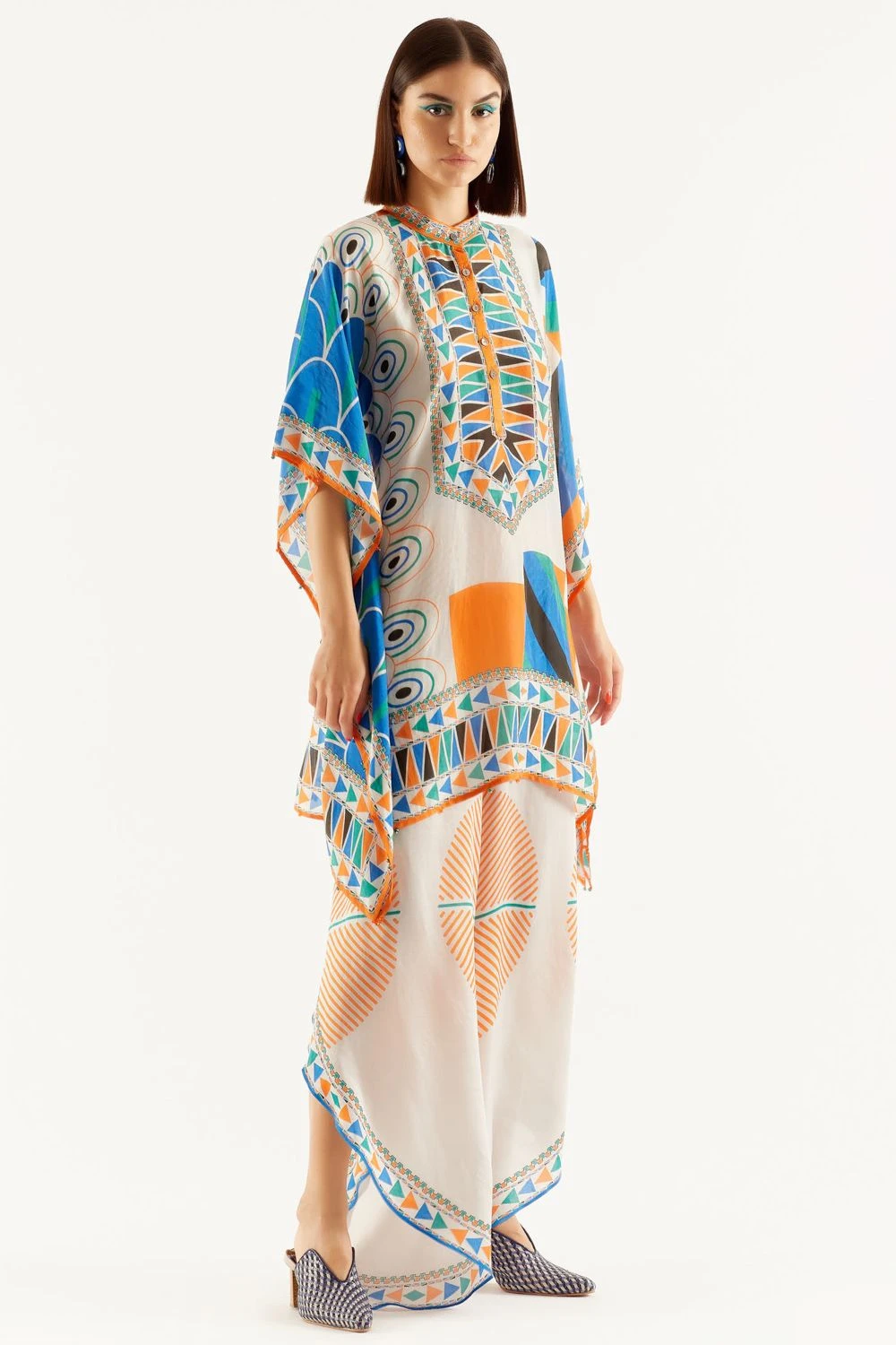 Playful silhouettes and vibrant tones are in perfect style this season, and these pants fit the bill perfectly. It is cut in satin linen with a curved hem. You can style it with a matching tunic from the collection.