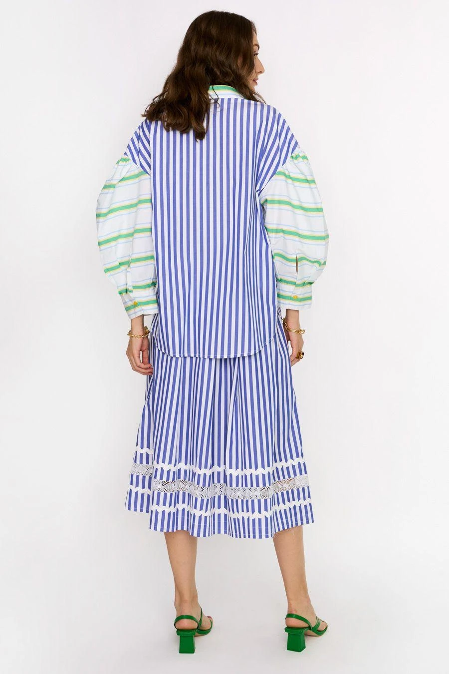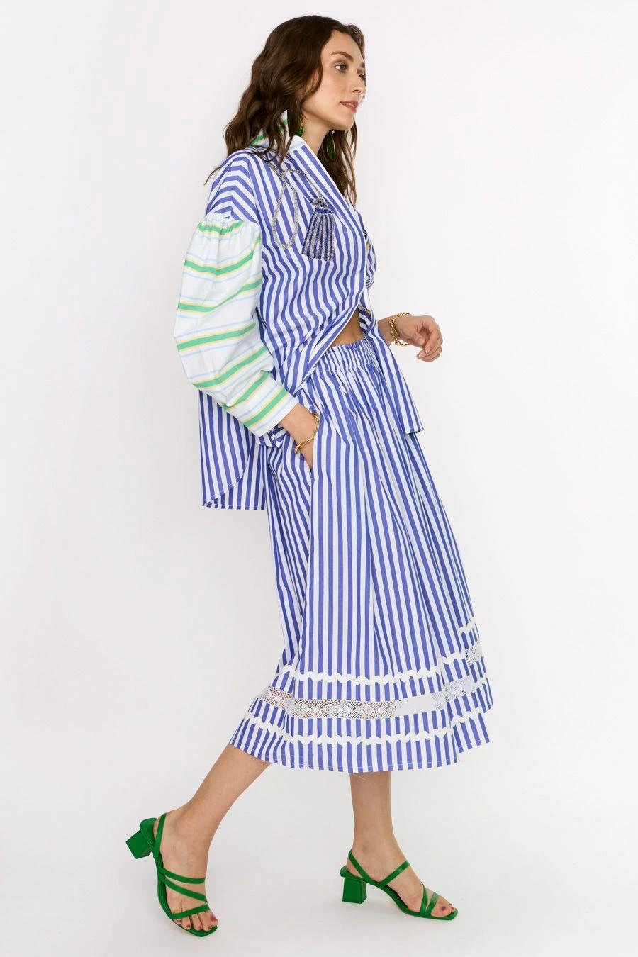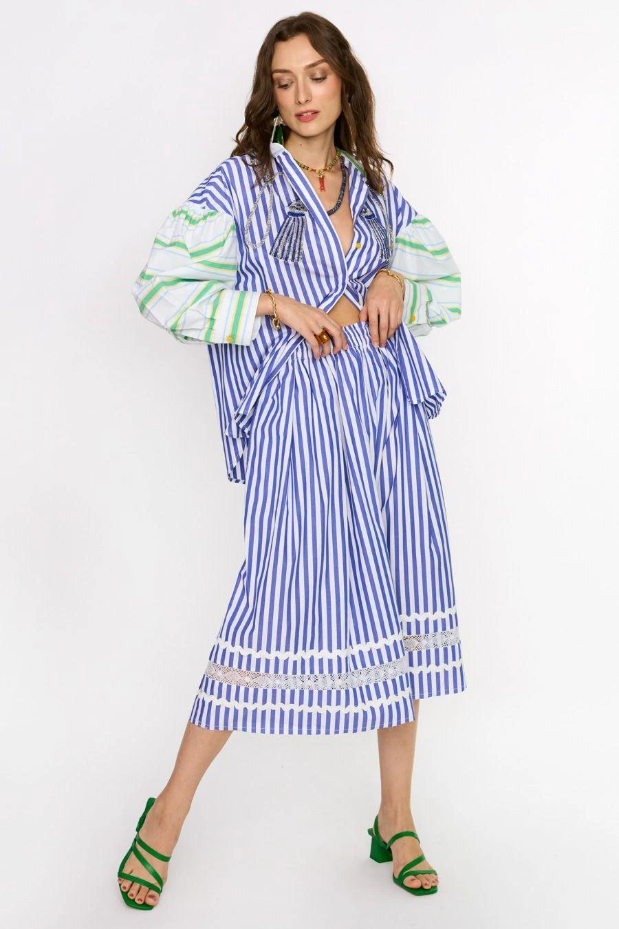 Elevate your nautical style wardrobe this summer with this one of a kind blue & white shirt. Crafted in cotton, this hand embroidered striped shirt features dropped shoulder and knot motifs.
