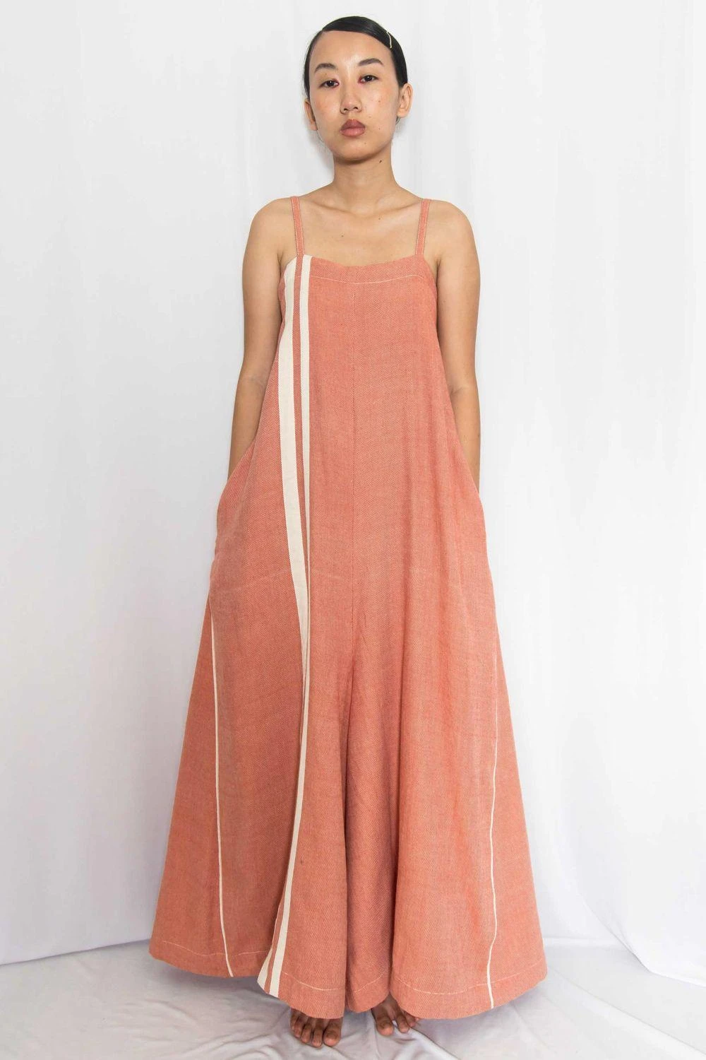 For your next weekend getaway, this coral strappy jumpsuit will keep you fresh & playful the whole day. It is cut in indigenous handspun handwoven cotton denim fabric. Accessorise your look with a pair of chic hoops & statement flats.