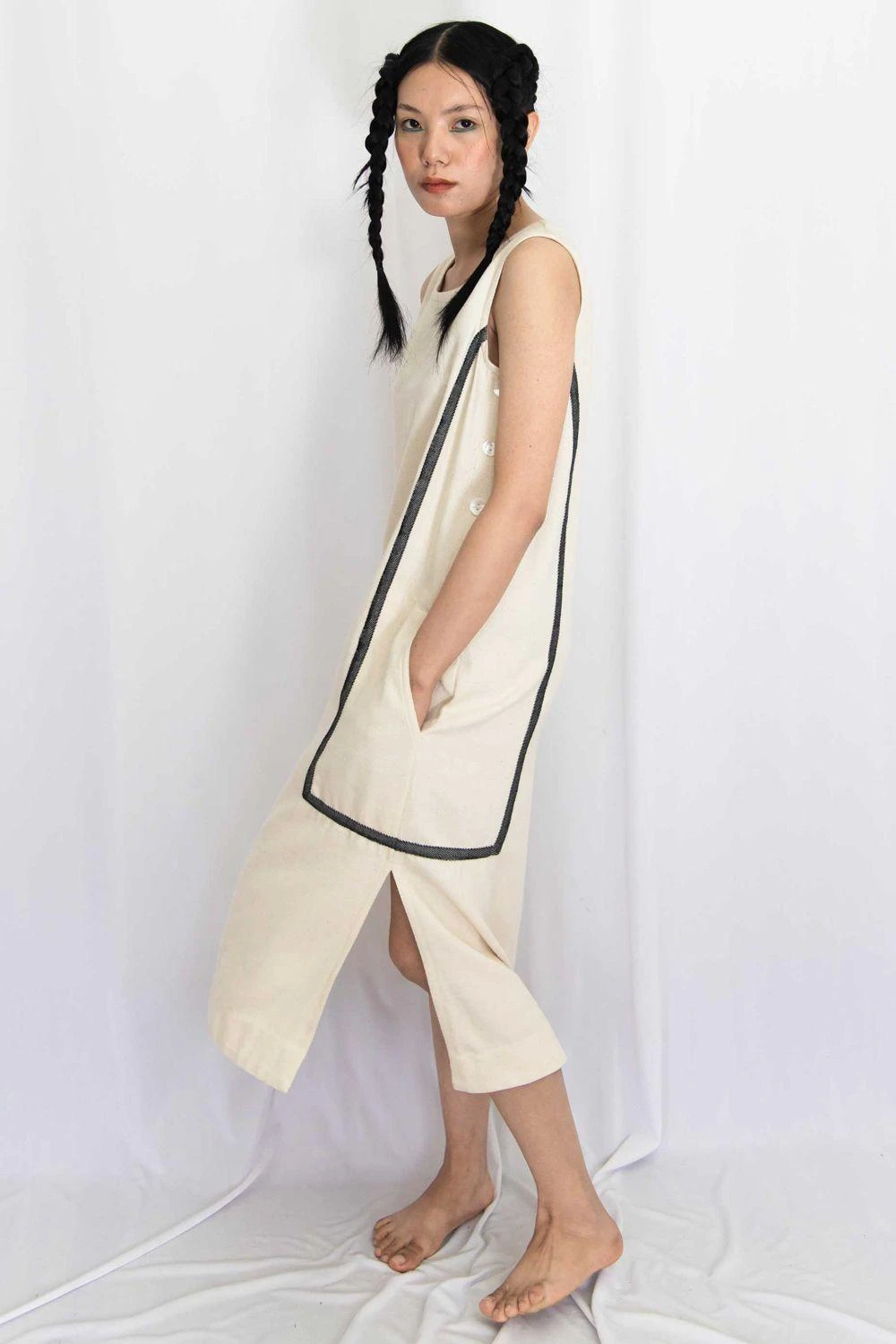 Home or away, this ecru relaxed fit dress is the ideal wardrobe staple. It is woven in indigenous handspun handwoven cotton denim fabric and features side button details with slits, adding comfort to the look. Dress it up with a pair of chic flats.