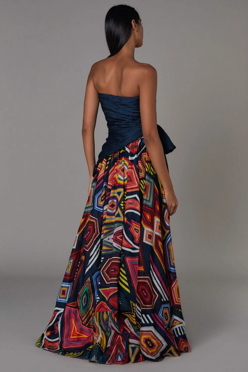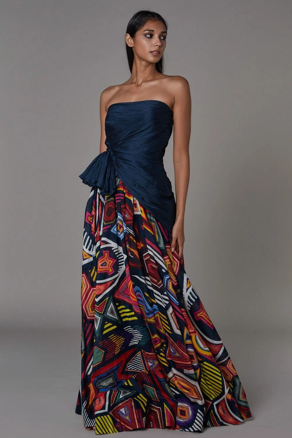 This deep blue peplum style corset top is made in a hand micro pleated cotton silk fabric. Style this statement piece with a skirt or flared pants for a playful look.