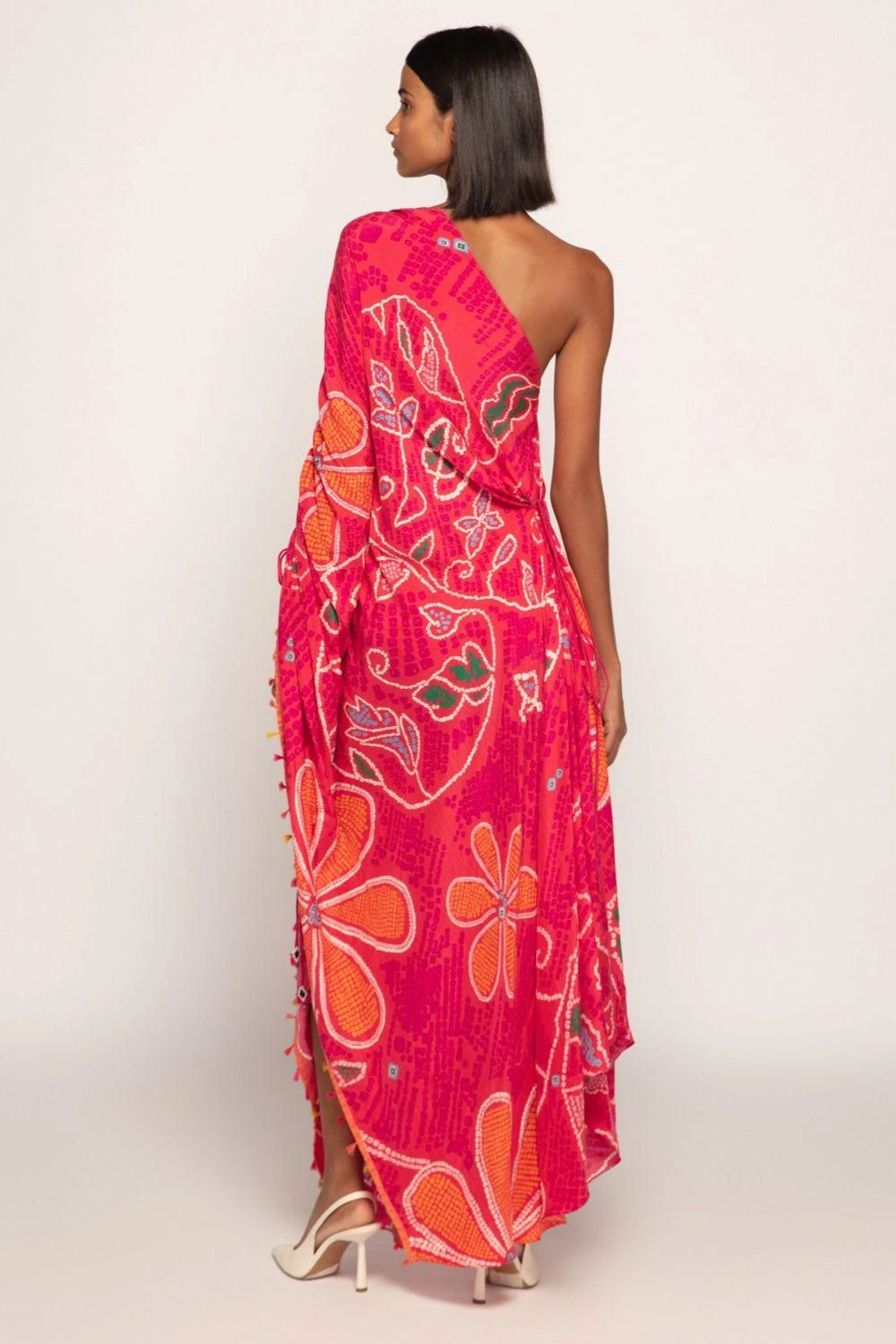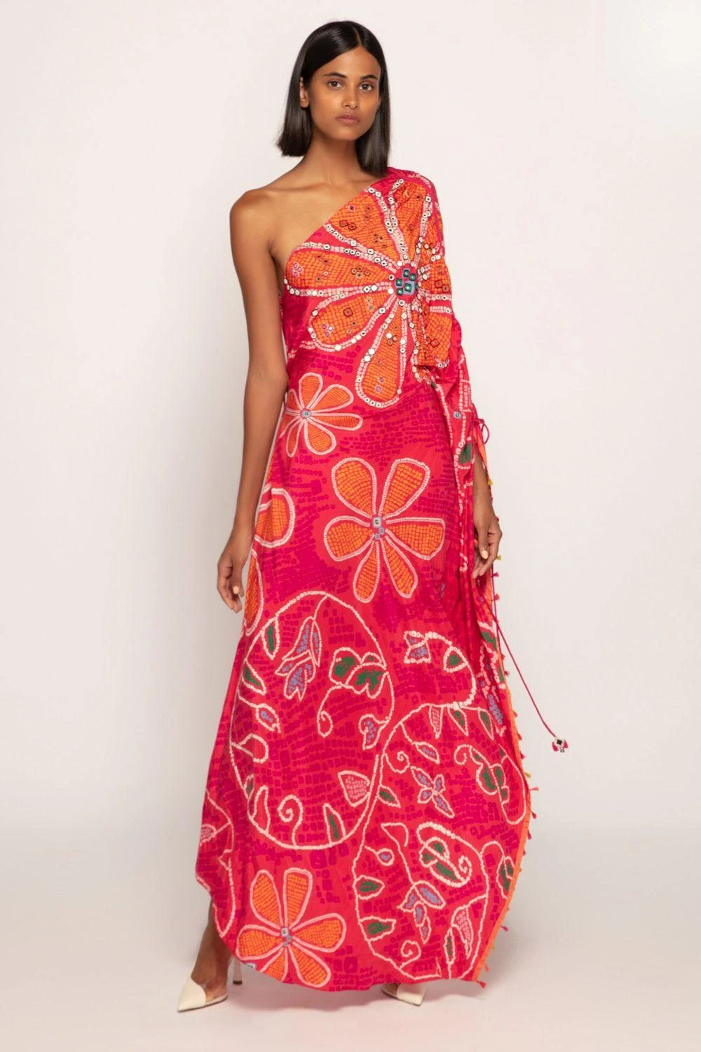 Radiate elegance in this Marigold Bandhani Print Asymmetric Kaftan. With a chic side slit and hand-embroidered mirror and threadwork neckline, it’s a fusion of style and craftsmanship that’s both chic and refined.